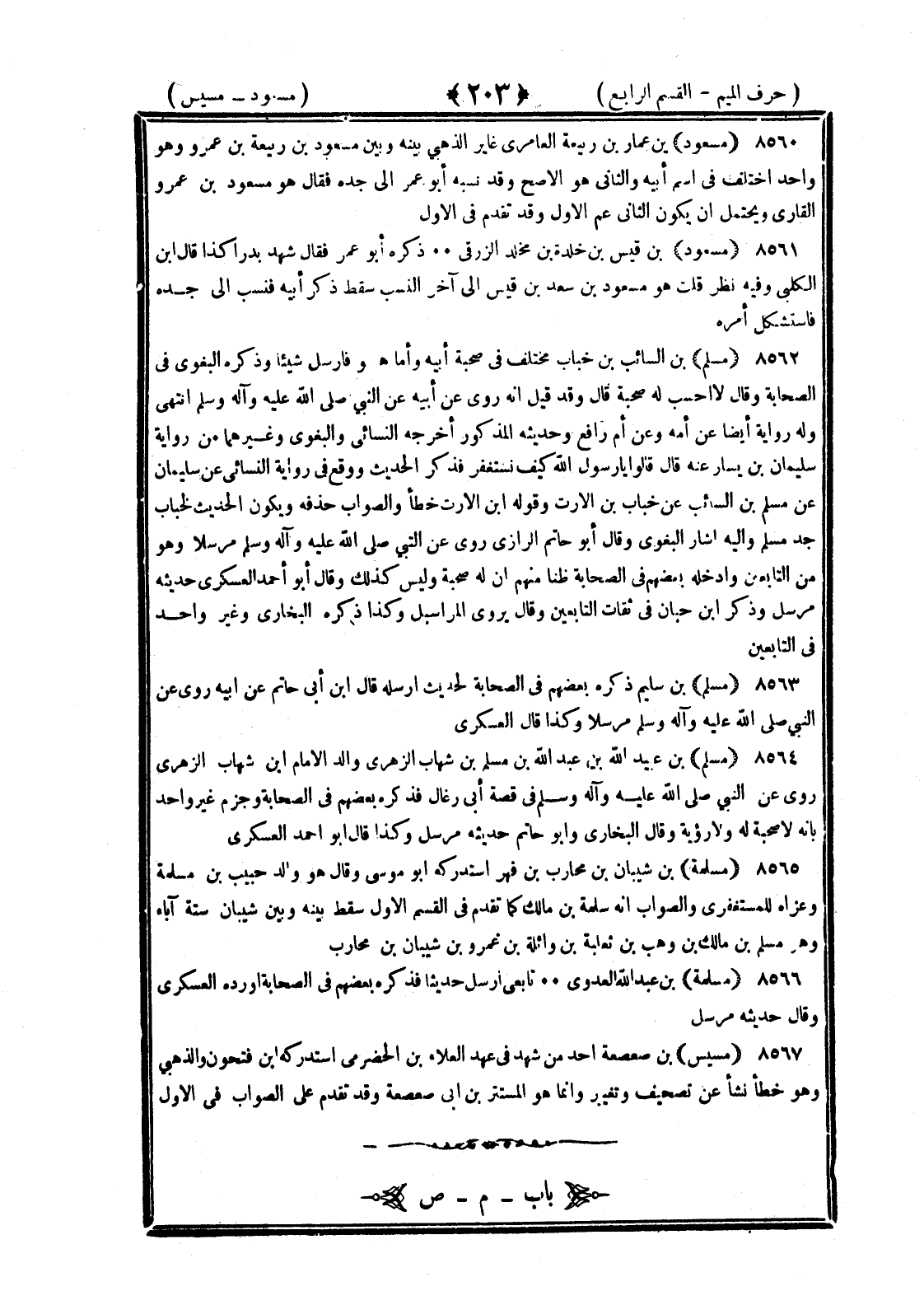 <203> مسعود بن عمار بن ربيعة القاري غاير الذهبي بينه وبين مسعود بن ربيعة بن عمرو وهو واحد اختلف في اسم أبيه والثاني هو الأصح وقد نسبه أبو عمر إلى جده فقال هو مسعود بن عمرو القاري ويحتمل أن يكون الثاني عم الأول وقد تقدم في الأول مسعود بن قيس بن خلدة بن مخلد الزرقي ذكره أبو عمر فقال شهد بدرا كذا قال بن الكلبي وفيه نظر قلت مسعود بن سعد بن قيس إلى آخر النسب سقط ذكر أبيه فنسب إلى جده فأشكل أمره مسلم بن السائب بن خباب مختلف في صحبة أبيه وأما هو فأرسل شيئا وذكره البغوي في الصحابة وقال لا أحسب له صحبة قال وقد قيل إنه روى عن أبيه عن النبي صلى الله عليه وسلم انتهى وله رواية أيضا عن أمه وعن أم رافع وحديثه المذكور أخرجه النسائي والبغوي وغيرهما من رواية سليمان بن يسار عنه قال قالوا يا رسول الله كيف نستغفر فذكر الحديث ووقع في رواية النسائي عن سليمان عن مسلم بن السائب عن خباب بن الأرت وقوله بن الأرت خطأ والصواب حذفه ويكون الحديث لخباب جد مسلم وإليه أشار البغوي وقال أبو حاتم الرازي روى عن النبي صلى الله عليه وسلم مرسلا وهو من التابعين وأدخله بعضهم في الحصابة ظنا منهم أن له صحبة وليس كذلك وقال أبو أحمد العسكري حديثه مرسل وذكره بن حبان في ثقات التابعين وقال يروي المراسيل وكذا ذكره البخاري وغير واحد في التابعين مسلم بن سليم ذكره بعضهم في الصحابة لحديث أرسله قال بن أبي حاتم عن أبيه روى عن النبي صلى الله عليه وسلم مرسلا وكذا قال العسكري مسلم بن عبيد الله بن عبد الله بن مسلم بن شهاب الزهري والد الإمام بن شهاب الزهري روى عن النبي صلى الله عليه وسلم وفي قصة أبي رغال فذكره بعضهم في الصحابة وجزم غير واحد بأنه لا صحبة له ولا رؤية وقال البخاري وأبو حاتم حديثه مرسل وكذا قال أبو أحمد العسكري مسلمة بن شيبان بن محارب بن فهر استدركه أبو موسى وقال هو والد حبيب بن مسلمة وعزاه للمستغفري والصواب أنه مسلمة بن مالك كما تقدم في القسم الأول سقط بينه وبين شيبان ستة آباء وهو مسلمة بن مالك بن وهب بن ثعلبة بن وائلة بن عمرو بن شيبان بن محارب مسلمة بن عبد الله العدوي تابعي أرسل حديثا فذكره بعضهم في الصحابة أورده العسكري وقال حديثه مرسل المسيس بن صعصعة أحد من شهد في عهد العلاء بن الحضرمي استدركه بن فتحون والذهبي وهو خطأ نشأ عن تصحيف وتغيير وإنما هو المستنير بن أبي صعصعة وقد تقدم علي الصواب في الأول الميم بعدها الصاد §