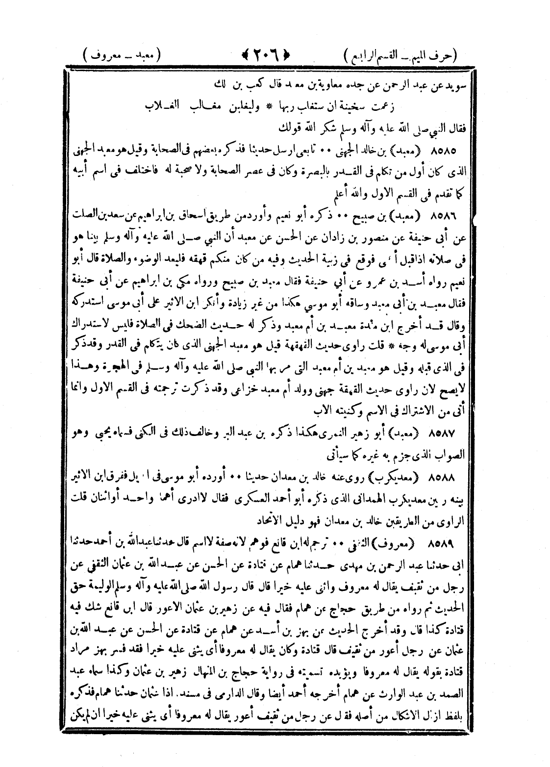 <206> سويد عن عبد الرحمن عن جده معاوية بن معبد قال كعب بن مالك زعمت سخينة أن ستغلب ربها وليغلبن مغالب الغلاب فقال النبي صلى الله عليه وسلم شكر الله قولك معبد بن خالد الجهني تابعي أرسل حديثا فذكره بعضهم في الصحابة وقيل هو معبد الجهني الذي كان أول من تكلم في القدر بالبصرة وكان في عصر الصحابة ولا صحبة له فاختلف في اسم أبيه كما تقدم في القسم الأول والله أعلم معبد بن صبيح ذكره أبو نعيم وأورده من طريق إسحاق بن إبراهيم عن سعد بن الصلت عن أبي حنيفة عن منصور بن زادان عن الحسن عن معبد أن النبي صلى الله عليه وسلم بينا هو في صلاته إذ أقبل أعمى فوقع في زبية الحديث وفيه من كان منكم قهقه فليعد الوضوء والصلاة قال أبو نعيم رواه أسد بن عمرو عن أبي حنيفة فقال معبد بن صبيح ورواه مكي بن إبراهيم عن أبي حنيفة فقال معبد بن أبي معبد وساقه أبو موسى هكذا من غير زيادة وأنكر بن الأثير على أبي موسى استدراكه وقال قد أخرج بن منده معبد بن أم معبد وذكر له حديث الضحك في الصلاة فليس لاستدراك أبي موسى له وجه قلت راوي حديث القهقهة قيل هو معبدالجهني الذي كان يتكلم في القدر وقد ذكر في الذي قبله وقيل هو معبد بن أم معبد التي مر بها النبي صلى الله عليه وسلم في الهجرة وهذا لا يصح لأن راوي حديث القهقهة جهني وولد أم معبد خزاعي وقد ذكرت ترجمته في القسم الأول وإنما أتى من الاشتراك في الاسم وكنية الأب معبد أبو زهير النمري هكذا ذكره بن عبد البر وخالف ذلك في الكنى فسماه يحيى وهو الصواب الذي جزم به غيره كما سيأتي معد يكرب روى عنه خالد بن معدان حديثا أورده أبو موسى في الذيل ففرق بن الأثير بينه وبين معد يكرب الهمداني الذي ذكره أبو أحمد العسكري فقال لا أدري أهما واحد أو اثنان قلت الراوي من الطريقين خالد بن معدان فهو دليل الاتحاد معروف الثقفي ترجم له بن قانع فوهم لأنه صفة لا اسم قال حدثنا عبد الله بن أحمد حدثنا أبي حدثنا عبد الرحمن بن مهدي حدثنا همام عن قتادة عن الحسن عن عبد الله بن عثمان الثقفي عن رجل من ثقيف يقال له معروف وأثنى عليه خيرا قال رسول الله صلى الله عليه وسلم الوليمة حق الحديث ثم رواه من طريق حجاج عن همام فقال فيه عن زهير بن عثمان الأعور قال بن قانع شك فيه قتادة كذا قال وقد أخرج الحديث عن بهز بن أحمد عن همام عن قتادة عن الحسن عن عبد الله بن عثمان عن رجل أعور من ثقيف قال قتادة وكان يقال له معروفا أي يثني عليه خيرا فقد فسر بهز مراد قتادة بقوله يقال له معروفا ويؤيده تسميته في رواية حجاج بن المنهال زهير بن عثمان وكذا سماه عبد الصمد بن عبد الوارث عن همام أخرجه أحمد أيضا وقال الدارمي في مسنده أنبأنا عفان حدثنا همام فذكره بلفظ أزال الإشكال من أصله فقال عن رجل من ثقيف أعور يقال له معروفا أي يثني عليه خيرا إن لم يكن §