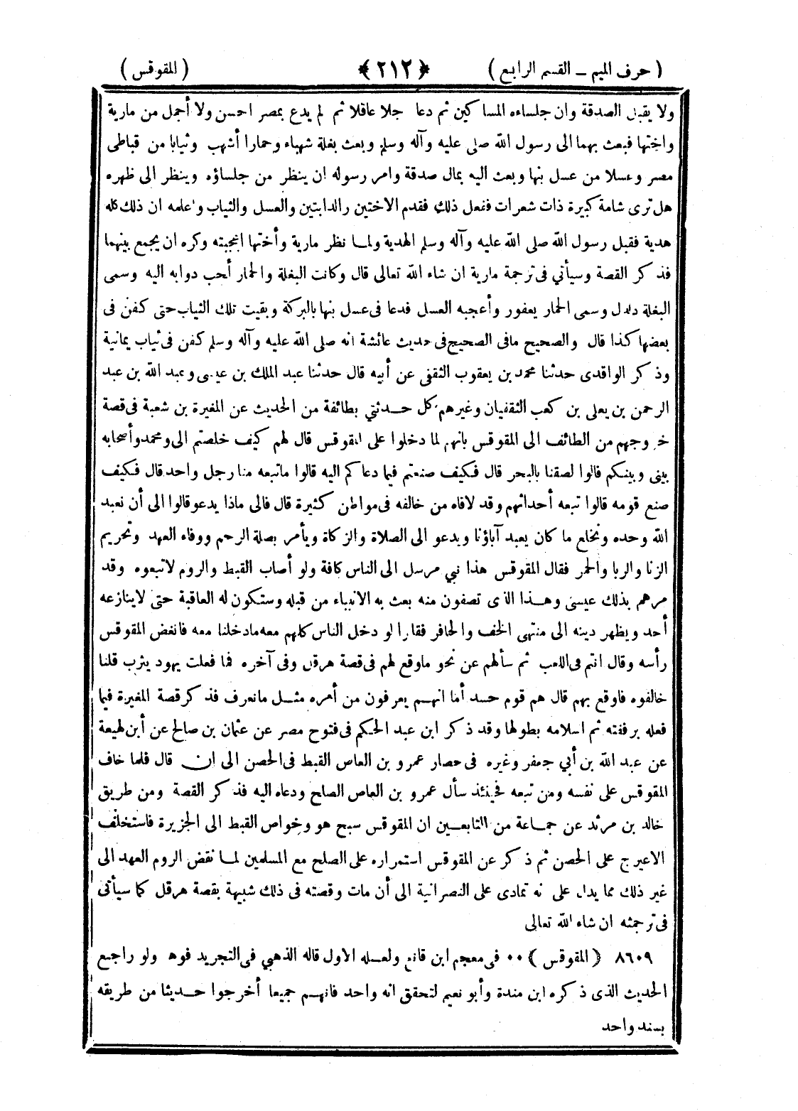 <212> ولا يقبل الصدقة وأن جلساءه المساكين ثم دعا رجلا عاقلا ثم لم يدع بمصر أحسن ولا أجمل من مارية وأختها فبعث بهما إلى رسول الله صلى الله عليه وسلم وبعث بغلة شهباء وحمارا أشهب وثيابا من قباطى مصر وعسلا من عسل بنها وبعث إليه بمال وصدقة وأمر رسوله أن ينظر من جلساؤه وينظر إلى ظهره هل يرى شامة كبيرة ذات شعرات ففعل ذلك فقدم الأختين والدا بتين والعسل والثياب وأعلمه أن ذلك كله هدية فقبل رسول الله صلى الله عليه وسلم الهدية ولما نظر إلى مارية وأختها أعجبتاه وكره أن يجمع بينهما فذكر القصة وسيأتي في ترجمة مارية إن شاء الله تعالى قال وكانت البغلة والحمار أحب دوابه إليه وسمى البغلة دلدل وسمى الحمار يعفور وأعجبه العسل فدعا في عسل بنها بالبركة وبقيت تلك الثياب حتى كفن في بعضها وكذا قال والصحيح ما في الصحيح في حديث عائشة أنه صلى الله عليه وسلم كفن في ثياب يمانية وذكر الواقدي حدثنا محمد بن يعقوب الثقفي عن أبيه قال حدثنا عبد الملك بن عيسى وعبد الله بن عبد الرحمن بن يعلى بن كعب الثقفيان وغيرهم كل حدثني بطائفة من الحديث عن المغيرة بن شعبة في قصة خروجهم من الطائف إلى المقوقس بأنهم لما دخلوا على المقوقس قال لهم كيف خلصتم إلى ومحمد وأصحابه بيني وبينكم قالوا لصقنا بالبحر قال فكيف صنعتم فيما دعاكم إليه قالوا ما تبعه منا رجل واحد قال فكيف صنع قومه قالوا تبعه أحداثهم وقد لاقاه من خالفه في مواطن كثيرة قال فإلى ماذا يدعو قالوا إلى أن نعبد الله وحده ونخلع ما كان يعبد آباؤنا ويدعو إلى الصلاة والزكاة ويأمر بصلة الرحم ووفاء العهد وتحريم الزنا والربا والخمر فقال المقوقس هذا نبي مرسل إلى الناس كافة ولو أصاب القبط والروم لاتبعوه وقد أمرهم بذلك عيسى وهذا الذي تصفون منه بعث به الأنبياء من قبله وستكون له العاقبة حتى لا ينازعه أحد ويظهر دينه إلى منتهى الخف والحافر فقالوا لو دخل الناس كلهم معه ما دخلنا معه فأنغص المقوقس رأسه وقال أنت في اللعب ثم سألهم عن نحو ما وقع لهم في قصة هرقل وفي آخره فما فعلت يهود يثرب قلنا خالفوه فأوقع بهم قال هم قوم حسد أما إنهم يعرفون من أمره مثل ما نعرف فذكر قصة المغيرة فيما فعله برفقته ثم إسلامه بطولها وقد ذكر بن عبد الحكم في فتوح مصر عن عثمان بن صالح عن بن لهيعة عن عبد الله بن أبي جعفر وغيره في حصار عمرو بن العاص القبط في الحصن إلى أن قال فلما خاف المقوقس على نفسه ومن تبعه فحينئذ سأل عمرو بن العاص الصلح ودعاه إليه فذكر القصة ومن طريق خالد بن مرثد عن جماعة من التابعين أن المقوقس سبح هو وخواص القبط إلى الجزيرة واستخلف الأعيرج على الحصن ثم ذكر عن المقوقس استمراره على الصلح مع المسلمين لما نقض الروم العهد إلى غير ذلك مما يدل على أنه تمادي على النصرانية إلى أن مات وقصته في ذلك شبيهة بقصة هرقل كما سيأتي في ترجمته إن شاء الله تعالى المقوقس في معجم بن قانع ولعله الأول قاله الذهبي في التجريد فوهم ولو راجع الحديث الذي ذكره بن منده وأبو نعيم لتحقق أنه واحد فإنهم جميعا أخرجوا حديثا من طريقه بسند واحد §
