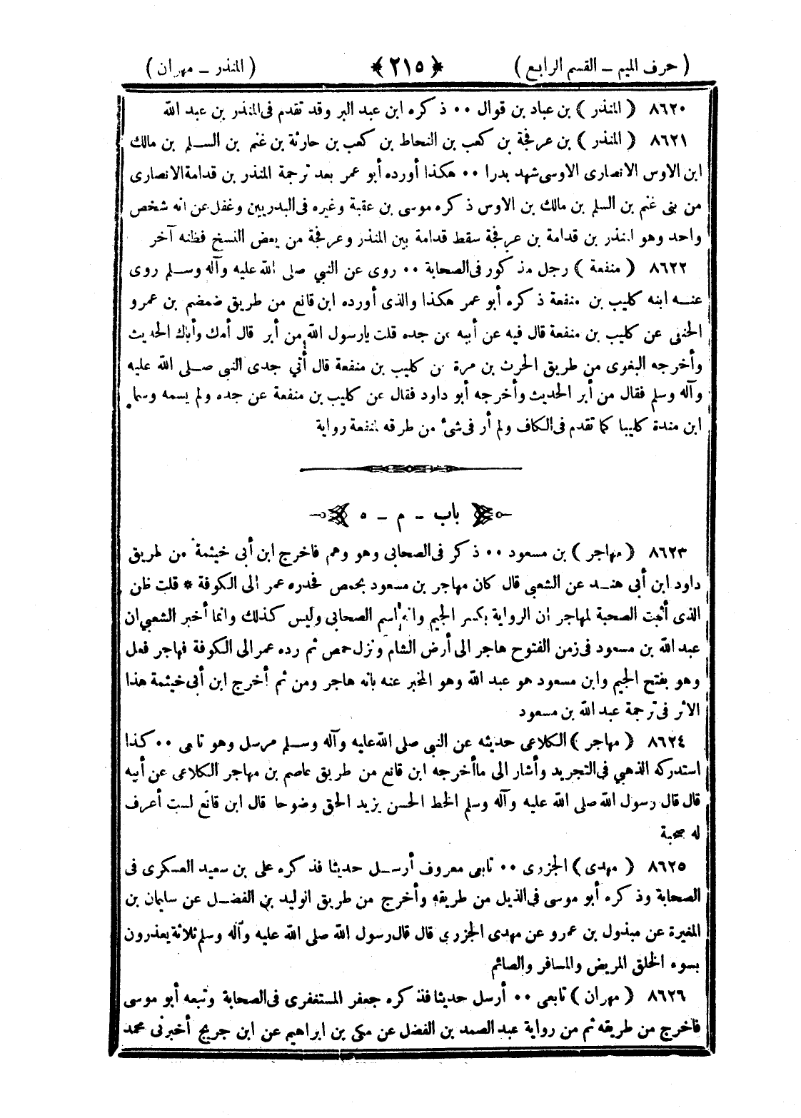 <215> المنذر بن عباد بن قوال ذكره بن عبد البر وقد تقدم في المنذر بن عبد الله المنذر بن عرفجة بن كعب بن النحاط بن كعب بن حارثة بن غنم بن السلم بن مالك بن الأوس الأنصاري الأوسي شهد بدرا هكذا أورده أبو عمر بعد ترجمة المنذر بن قدامة الأنصاري من بني غنم بن السلم بن مالك بن الأوس وذكره موسى بن عقبة وغيره في البدريين وغفل عن أنه شخص واحد وهو المنذر بن قدامة بن عرفجة سقط قدامة بين المنذر وعرفجة من بعض النسخ فظنه آخر منفعة رجل مذكور في الصحابة روى عن النبي صلى الله عليه وسلم روى عنه ابنه كليب بن منفعة ذكره أبو عمر هكذا والذي أورده بن قانع من طريق ضمضم بن عمرو الحنفي عن كليب بن منفعة قال فيه عن أبيه عن جده قلت يا رسول الله من أبر قال أمك وأباك الحديث وأخرجه البغوي من طريق الحارث بن مرة عن كليب بن منفعة قال أتى جدي النبي صلى الله عليه وسلم فقال من أبر الحديث وأخرجه أبو داود فقال عن كليب بن منفعة عن جده ولم يسمه وسماه بن منده كليبا تقدم في الكاف ولم أر في شيء من طرقه لمنفعة رواية الميم بعدها الهاء مهاجر بن مسعود ذكر في الصحابة وهو وهم فأخرج بن أبي خيثمة من طريق داود بن أبي هند عن الشعبي قال كان مهاجر بن مسعود بحمص فحدره عمر إلى الكوفة قلت ظن الذي أثبت الصحبة لمهاجر أن الرواية بكسر الجيم وأنه اسم الصحابي وليس كذلك إنما أخبر الشعبي أن عبد الله بن مسعود في زمن الفتوح هاجر إلى أرض الشام ونزل حمص ثم رده عمر إلى الكوفة فهاجر فعل وهو بفتح الجيم وابن مسعود هو عبد الله وهو المخبر عنه بأنه هاجر ومن ثم أخرج بن أبي خيثمة هذا الأثر في ترجمة عبد الله بن مسعود مهاجر الكلاعي حديثه عن النبي صلى الله عليه وسلم مرسل وهو تابعي كذا استدركه الذهبي في التجريد وأشار إلى ما أخرجه بن قانع من طريق عاصم بن مهاجر الكلاعي عن أبيه قال قال رسول الله صلى الله عليه وسلم الخط الحسن يزيد الحق وضوحا قال بن قانع لست أعرف له صحبة مهدي الجزري تابعي معروف أرسل حديثا فذكره علي بن سعيد العسكري في الصحابة وذكره أبو موسى في الذيل من طريقه وأخرج من طريق الوليد بن الفضل عن سليمان بن المغيرة عن مبذول بن عمرو عن مهدي الجزري قال قال رسول الله صلى الله عليه وسلم ثلاثة يعذرون بسوء الخلق المريض والمسافر والصائم مهران تابعي أرسل حديثا فذكره جعفر المستغفري في الصحابة وتبعه أبو موسى فأخرج من طريقه ثم من رواية عبد الصمد بن الفضل عن مكي بن إبراهيم عن بن جريج أخبرني محمد §