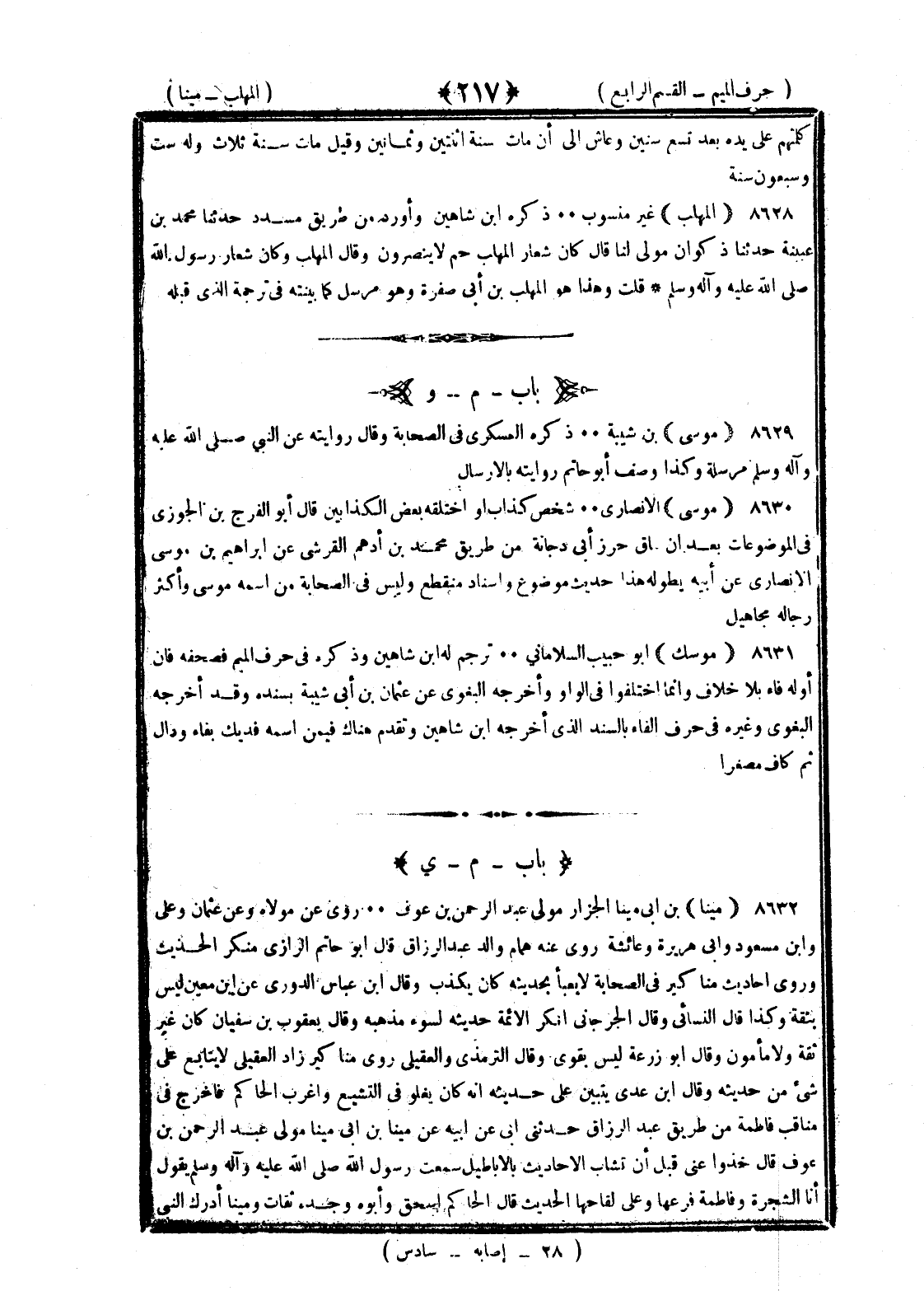 <217> كلمتهم على يده بعد تسع سنين وعاش إلى أن مات سنة اثنتين وثمانين وقيل مات سنة ثلاث وله ست وسبعون سنة المهلب غير منسوب ذكره بن شاهين وأود من طريق مسدد حدثنا محمد بن عيينة حدثنا ذكوان مولى لنا قال كان شعار المهلب حم لا ينصرون وقال المهلب وكان شعار رسول الله صلى الله عليه وسلم قلت وهذا هو المهلب بن أبي صفرة وهو مرسل كما بينته في ترجمة الذي قبله الميم بعدها الواو موسى بن شيبة ذكره العسكري في الصحابة وقال روايته عن النبي صلى الله عليه وسلم مرسلة وكذا وصف أبو حاتم روايته بالإرسال موسى الأنصاري شخص كذاب أو اختلقه بعض الكذابين قال أبو الفرج بن الجوزي في الموضوعات بعد أن ساق حرز أبي دجانة من طريق محمد بن أدهم القرشي عن إبراهيم بن موسى الأنصاري عن أبيه بطوله هذا حديث موضوع وإسناده منقطع وليس في الصحابة من اسمه موسى وأكثر رجاله مجاهيل مويك أبو حبيب السلاماني ترجم له بن شاهين وذكره في حرف الميم فصحفه فإن أوله فاء بلا خلاف وإنما اختلفوا في الواو وأخرجه البغوي عن عثمان بن أبي شيبة بسنده وقد أخرجه البغوي وغيره في حرف الفاء بالسند الذي أخرجه بن شاهين وتقدم هناك فيمن اسمه فديك بفاء ودال ثم كاف مصغرا الميم بعدها الياء مينا بن أبي مينا الجزار مولى عبد الرحمن بن عوف روى عن مولاه وعن عثمان وعلي وابن مسعود وأبي هريرة وعائشة روى عنه همام والد عبد الرزاق قال أبو حاتم الرازي منكر الحديث وروى أحاديث مناكير في الصحابة لا يعبأ بحديثه كان يكذب وقال عباس الدوري عن بن معين ليس بثقة وكذا قال النسائي وقال الجوزجاني أنكر الأئمة حديثه لسوء مذهبه وقال يعقوب بن سفيان كان غير ثقة ولا مأمون وقال أبو زرعة ليس بقوي وقال الترمذي والعقيلي روى مناكير زاد العقيلي لا يتابع على شيء من حديثه وقال بن عدي يتبين على حديثه أنه كان يغلو في التشيع وأغرب الحاكم فأخرج في مناقب فاطمة من طريق عبد الرزاق حدثني أبي عن أبيه عن مينا بن أبي مينا مولى عبد الرحمن بن عوف قال خذوا عني قبل أن تشاب الأحاديث بالأباطيل سمعت رسول الله صلى الله عليه وسلم يقول أنا الشجرة وفاطمة فرعها وعلي لقاحها الحديث قال الحاكم إسحاق وأبوه وجده ثقات ومينا أدرك النبي §