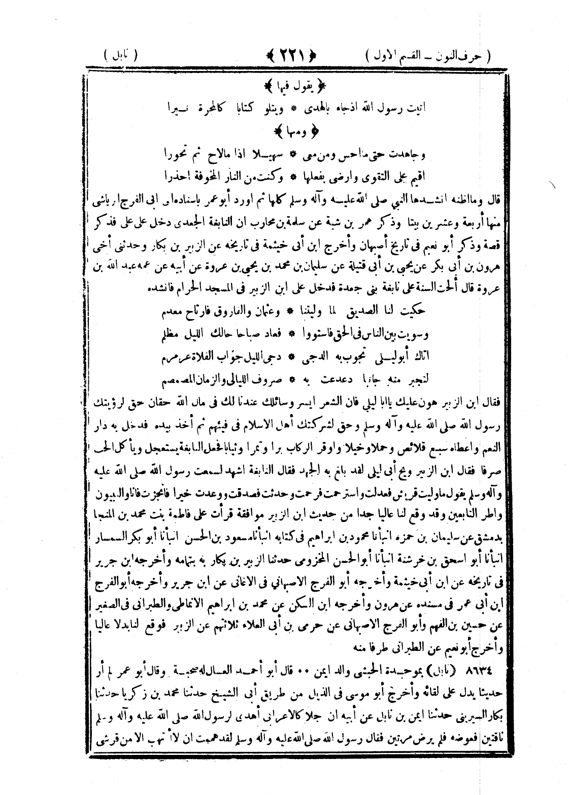 <221> يقول فيها أتيت رسول الله إذ جاء بالهدى ويتلو كتاب كالمجرة نيرا ومنها وجاهدت حتى ما أحسن ومن معي سهيلا إذا ما لاح ثم تحورا أقيم على التقوى وأرضى بفعلها وكنت من النار المخوفة أحذرا قال وما أظنه إلا أنشدها النبي صلى الله عليه وسلم كلها ثم أورد أبو عمر بإسناده إلى أبي الفرج الرياشي منها أربعة وعشرين بينا وذكر عمر بن شبة عن مسلمة بن محارب أن النابغة الجعدي دخل على علي فذكر قصة وذكر أبو نعيم في تاريخ أصبهان وأخرج بن أبي خيثمة في تاريخه عن الزبير بن بكار وحدثني أخي هارون بن أبي بكر عن يحيى بن أبي قتيلة عن سليمان بن محمد بن يحيى بن عروة عن أبيه عن عمه عبد الله بن عروة قال ألحت السنة على نابغة بني جعدة فدخل على بن الزبير في المسجد الحرام فأنشده حكيت لنا الصديق لما وليتنا وعثمان والفاروق فارتاح معدم وسويت بين الناس في الحق فاستووا فعاد صباحا حالك الليل مظلم أتاك أبو ليلى تجوب به الدجى دجى الليل جواب الفلاة عرمرم لتجبر منه جانبا دعدعت به صروف الليالي والزمان المصمم فقال بن الزبير هون عليك يا أبا ليلى فإن الشعر أيسر وسائلك عندنا لك في مال الله حقان حق لرؤيتك رسول الله صلى الله عليه وسلم وحق لشركتك أهل الإسلام في فيئهم ثم أخذ بيده فدخل به دار النعم وأعطاه سبع قلائص وحملا وخيلا وأوقر الركاب برا وتمرا وثيابا فجعل النابغة يستعجل ويأكل الحب صرفا فقال بن الزبير ويح أبي ليلى لقد بلغ به الجهد فقال النابغة أشهد لسمعت رسول الله صلى الله عليه وسلم يقول ما وليت قريش فعدلت واسترحمت فرحمت وحدثت فصدقت ووعدت خيرا فأنجرت فأنا والنبيون وأطر التابعين وقد وقع لنا عاليا من حديث بن الزبير موافقة قرأت على فاطمة بنت محمد بن المنجي بدمشق عن سليمان بن حمزة أنبأنا محمود بن إبراهيم في كتابه أنبأنا مسعود بن الحسن أنبأنا أبو بكر السمسار أنبأنا أبو إسحاق بن خرشة أنبأنا أبو الحسن المخزومي حدثنا الزبير بن بكار به بتمامه وأخرجه بن جرير في تاريخه عن بن أبي خيثمة وأخرجه أبو الفرج الأصبهاني في الأغاني عن بن جرير وأخرجه بن أبي عمر في مسنده عن هارون وأخرجه بن السكن عن محمد بن إبراهيم الأنماطي والطبراني في الصغير عن حسين بن الفهم وأبو الفرج الأصبهاني عن حرمي بن العلاء ثلاثتهم عن الزبير فوقع لنا بدلا عاليا وأخرج أبو نعيم عن الطبراني طرفا منه نابل بموحدة الحبشي والد أيمن قال أبو أحمد العسال له صحبة وقال أبو عمر لم أر حديثا يدل على لقائه وأخرج أبو موسى في الذيل من طريق أبي الشيخ حدثنا محمد بن زكريا حدثنا بكار السيريني حدثنا أيمن بن نابل عن أبيه أن رجلا كالأعرابي أهدى لرسول الله صلى الله عليه وسلم ناقتين فعوضه فلم يرض مرتين فقال رسول الله صلى الله عليه وسلم لقد هممت ألا أتهب إلا من قرشي §