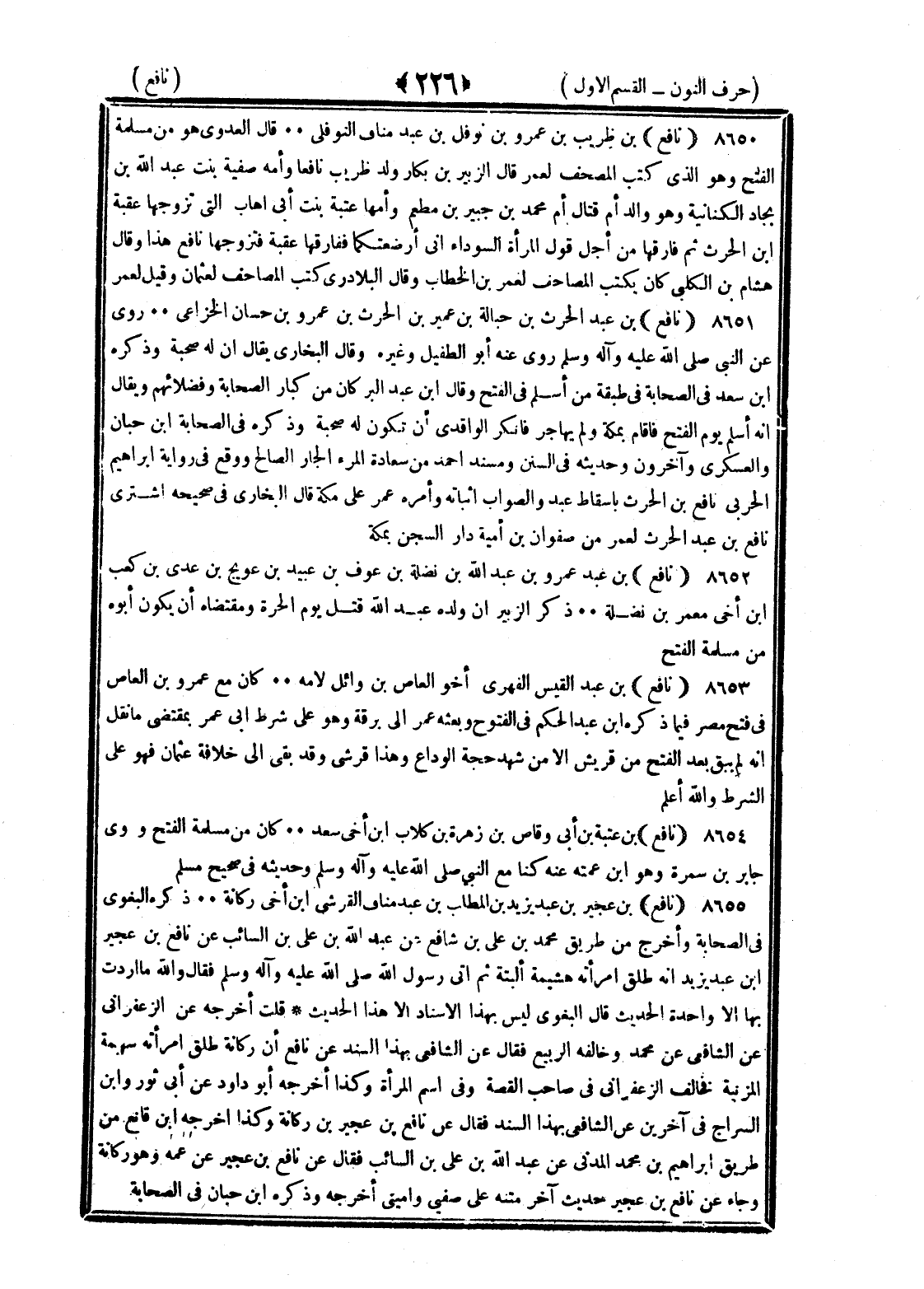 <226> نافع بن ظريب بن عمرو بن نوفل بن عبد مناف النوفلي قال العدوي هو من مسلمة الفتح وهو الذي كتب المصحف لعمر قال الزبير بن بكار ولد ظريب نافعا وأمه صفية بنت عبد الله بن بجاد الكنانية وهو والد أم قتال أم محمد بن جبير بن مطعم وأمها عتبة بنت أبي إهاب التي تزوجها عقبة بن الحارث ثم فارقها من أجل قول المرأة السوداء إني أرضعتكما ففارقها عقبة فتزوجها نافع هذا وقال هشام بن الكلبي كان يكتب المصاحف لعمر بن الخطاب وقال البلاذري كتب المصاحف لعثمان وقيل لعمر نافع بن عبد الحارث بن حبالة بن عمير بن عبشان الخزاعي روى عن النبي صلى الله عليه وسلم روى عنه أبو الطفيل وغيره وقال البخاري يقال إن له صحبة وذكره بن سعد في الصحابة في طبقة من أسلم في الفتح وقال بن عبد البر كان من كبار الصحابة وفضلائهم ويقال إنه أسلم يوم الفتح فأقام بمكة ولم يهاجر فأنكر الواقدي أن تكون له صحبة وذكره في الصحابة بن حبان والعسكري وآخرون وحديثه في السنن ومسند أحمد من سعادة المرء الجار الصالح ووقع في رواية إبراهيم الحربي نافع بن الحارث بإسقاط عبد والصواب إثباته وأمره عمر على مكة قال البخاري في صحيحه اشترى نافع بن عبد الحارث لعمر من صفوان بن أمية دار السجن بمكة نافع بن عبد عمرو بن عبد الله بن نضلة بن عوف بن عبيد بن عويج بن عدي بن كعب بن أخي معمر بن نضلة ذكر الزبير أن ولده عبد الله قتل يوم الحرة ومقتضاه أن يكون أبوه من مسلمة الفتح نافع بن عبد القيس الفهري أخو العاص بن وائل لأمه كان مع عمرو بن العاص في فتح مصر فيما ذكره بن عبد الحكم في الفتوح وبعثه عمرو إلى برقة وهو على شرط أبي عمر بمقتضى ما نقل أنه لم يبق بعد الفتح من قريش إلا من شهد حجة الوداع وهذا قرشي وقد بقي إلى خلافة عثمان فهو على الشرط والله أعلم نافع بن عتبة بن أبي وقاص بن زهرة بن كلاب بن أخي سعد كان من مسلمة الفتح روى جابر بن سمرة وهو بن عمته عنه كنا مع النبي صلى الله عليه وسلم وحديثه في صحيح مسلم نافع بن عجير بن عبد يزيد بن المطلب بن عبد مناف القرشي بن أخي ركانة ذكره البغوي في الصحابة وأخرج من طريق محمد بن علي بن شافع عن عبد الله بن علي بن السائب عن نافع بن عجير بن عبد يزيد أنه طلق امرأته هشيمة البتة ثم أتى رسول الله صلى الله عليه وسلم فقال والله ما أردت بها إلا واحدة الحديث قال البغوي ليس بهذا الإسناد إلا هذا الحديث قلت أخرجه عن الزعفراني عن الشافعي عن محمد وخالفه الربيع فقال عن الشافعي وأخرجه أيضا من طريق الحميدي عن الشافعي بهذا السند عن نافع أن ركانة طلق امرأته شهيبة فخالف الزعفراني في صاحب القصة وفي اسم المرأة وكذا أخرجه أبو داود عن أبي ثور وابن السراج في آخرين عن الشافعي بهذا السند فقال عن نافع بن عجير بن ركانة وكذا أخرجه بن قانع من طريق إبراهيم بن محمد المدني عن عبد الله بن علي بن السائب فقال عن نافع بن عجير عن عمه وهو ركانة وجاء عن نافع بن عجير حديث آخر متنه علي صفيي وأميني أخرجه وذكره بن حبان في الصحابة §