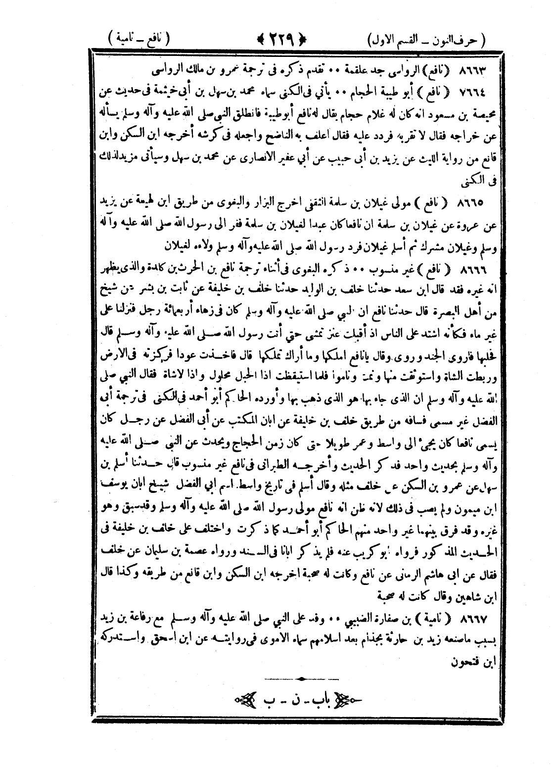 <229> نافع الرؤاسي جد علقمة تقدم ذكره في ترجمة عمرو بن مالك الرؤاسي نافع أبو طيبة الحجام يأتي في الكنى سماه محمد بن سهل بن أبي خيثمة في حديث عن محيصة بن مسعود أنه كان له غلام حجام يقال له نافع أبو طيبة فانطلق إلى النبي صلى الله عليه وسلم يسأله عن خراجه فقال لا تقربه فردد عليه فقال اعلف به الناضح واجعله في كرشه أخرجه بن السكن وابن قانع من رواية الليث عن يزيد بن أبي حبيب عن أبي عفير الأنصاري عن محمد بن سهل وسيأتي مزيد لذلك في الكنى نافع مولى غيلان بن سلمة الثقفي أخرج البزار والبغوي من طريق بن لهيعة عن يزيد بن عروة عن غيلان بن سلمة أن نافعا كان عبدا لغيلان بن سلمة ففر إلى رسول الله صلى الله عليه وسلم وغيلان مشرك ثم أسلم غيلان فرد رسول الله صلى الله عليه وسلم ولاءه لغيلان وروى بن سعد نافع غير منسوب ذكره البغوي في أثناء ترجمة نافع بن الحارث بن كندة والذي يظهر أنه غيره فقد قال بن سعد حدثنا خلف بن خليفة عن أبان بن بشير عن شيخ من أهل البصرة قال حدثنا نافع أن النبي صلى الله عليه وسلم كان في زهاء أربعمائة رجل فنزلنا على غير ماء فكأنه اشتد على الناس غذ أقبلت عنز تمشي حتى أتت رسول الله صلى الله عليه وسلم قال فحلبها فأروى الجند وروى وقال يا نافع املكها وما أراك تملكها قال فأخذت عودا فركزته في الأرض وربطت الشاة واستوثقت منها ونمت وناموا فلما استيقظت إذا الحبل محلول وإذ لا شاة فقال النبي صلى الله عليه وسلم إن الذي جاء بها هو الذي ذهب بها وأورده الحاكم أبو أحمد في الكنى في ترجمة أبي الفضل غير مسمى فساقه من طريق خلف بن خليفة عن أبان المكتب عن أبي الفضل عن رجل كان يسمى نافعا كان يجيء إلى واسط وعمر طويلا حتى كان زمن الحجاج ويحدث عن النبي صلى الله عليه وسلم بحديث واحد فذكر الحديث وأخرجه الطبراني في نافع غير منسوب قال حدثنا أسلم بن سهل عن عمر بن السكن عن خلف مثله وقال أسلم في تاريخ واسط اسم أبي الفضل شيخ أبان يوسف بن ميمون ولم يصب في ذلك لأنه ظن أنه نافع مولى رسول الله صلى الله عليه وسلم وقد سبق وهو غيره وقد فرق بينهما غير واحد منهم الحاكم أبو أحمد كما ذكرت واختلف على خلف بن خليفة في الحديث المذكور فرواه أبو كريب عنه فلم يذكر أبان في السند ورواه عصمة بن سليمان عن خلف فقال عن أبي هاشم الرماني عن نافع وكانت له صحبة أخرجه بن السكن وابن قانع من طريقه وكذا قال بن شاهين وقال كانت له صحبة نامية بن صفاره الضبعي وفد على النبي صلى الله عليه وسلم مع رفاعة بن زيد بسبب ما صنعه زيد بن حارثة بجذام بعد إسلامهم سماه الأموي في روايته عن بن إسحاق واستدركه بن فتحون النون بعدها الباء §