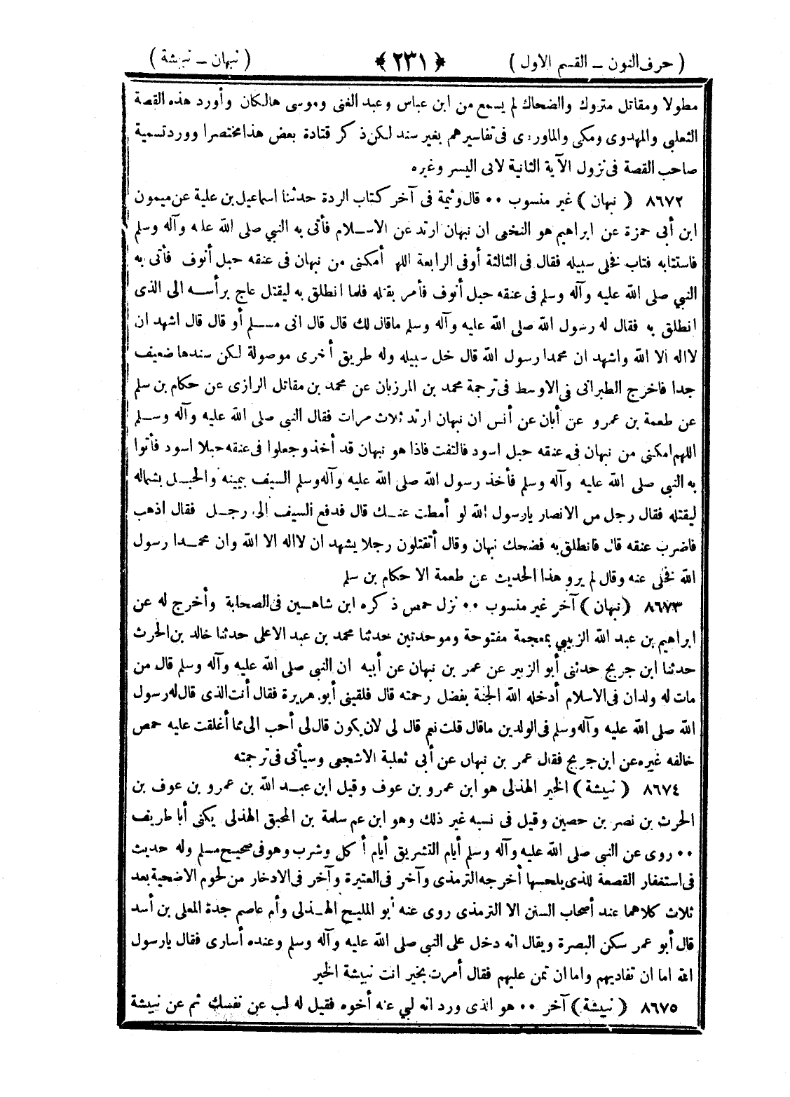 <231> مطولا ومقاتل متروك والضحاك لم يسمع من بن عباس وعبد الغني وموسى هالكان وأورد هذه القصة الثعلبي والمهدوي ومكي والماوردي في تفسيرهم بغير سند لكن ذكر قتادة بعض هذا مختصرا وورد تسمية صاحب القصة في نزول الآية الثانية لأبي اليسر وغيره نبهان غير منسوب قال وثيمة في آخر كتاب الردة حدثنا إسماعيل بن علية عن ميمون أبي حمزة عن إبراهيم هو النخعي أن نبهان ارتد عن الإسلام فأتى به النبي صلى الله عليه وسلم فاستتابه فتاب فخلى سبيله ثم إرتد عن الإسلام فأتي به النبي صلى الله عليه وسلم فاستتابه فتاب فخلى سبيله فقال في الثالثة أو في الرابعة اللهم أمكني من نبهان في عنقه حبل أنوف فأتي به النبي صلى الله عليه وسلم في عنقه حبل أنوف فأمر بقتله فلما انطلق به ليقتل عاج برأسه إلى الذي انطلق به فقال له رسول الله صلى الله عليه وسلم ما قال لك قال قال إني مسلم أقول أشهد أن لا إله إلا الله وأشهد أن محمدا رسول الله قال خل سبيله وله طريق أخرى موصولة لكن سندها ضعيف جدا فأخرج الطبراني في الأوسط في ترجمة محمد بن المرزباني عن محمد بن مقاتل الرازي عن حكام بن سلم عن طعمة بن عمرو عن أبان عن أنس أن نبهان ارتد ثلاث مرات فقال النبي صلى الله عليه وسلم اللهم أمكني من نبهان في عنقه حبل أسود فالتفت فإذا هو نبهان قد أخذ وجعلوا في عنقه حبلا أسود فأتوا به النبي صلى الله عليه وسلم فأخذ رسول الله صلى الله عليه وسلم السيف بيمينه والحبل بشماله ليقتله فقال رجل من الأنصار يا رسول الله لو أمطت عنك قال فدفع السيف إلى رجل فقال اذهب فاضرب عنقه قال فانطلق به فضحك نبهان وقال أتقتلون رجلا يشهد أن لا أله إلا الله وأن محمدا رسول الله فخلى عنه وقال لم يرو هذا الحديث عن طعمة إلا حكام بن سلم نبهان آخر غير منسوب نزل حمص ذكره بن شاهين في الصحابة وأخرج له عن إبراهيم بن عبد الله الزبيبي بمعجمة مفتوحة وموحدتين حدثنا محمد بن عبد الأعلى حدثنا خالد بن الحارث حدثنا بن جريج حدثني أبو الزبير عن عمر بن نبهان عن أبيه أن النبي صلى الله عليه وسلم قال من مات له ثلاث ولدان في الإسلام أدخله الله الجنة بفضل رحمته قال فلقيني أبو هريرة فقال أنت الذي قال له رسول الله صلى الله عليه وسلم في الولدان ما قال قلت نعم قال لي لأن يكون قال لي أحب إلي مما أغلقت عليه حمص خالفه غيره عن بن جريج فقال عمر بن نبهان عن أبي ثعلبة الأشجعي وسيأتي في ترجمته نبيشة الخير الهذلي هو بن عمرو بن عوف وقيل بن عبد الله بن عمرو بن عوف بن الحارث بن نصر بن حصين وقيل في نسبه غير ذلك وهو بن عم سلمة بن المحبق الهذلي يكنى أبا طريف روى عن النبي صلى الله عليه وسلم أيام التشريق أيام أكل وشرب وهو في صحيح مسلم وله حديث في استغفار القصة للذي يلحسها أخرجه الترمذي وآخر في العتيرة وآخر في الادخار من لحوم الأضحية بعد ثلاث كلاهما عند أصحاب السنن إلا الترمذي روى عنه أبو المليح الهذلي وأم عاصم جدة المعلى بن أسد قال أبو عمر سكن البصرة ويقال إنه دخل على النبي صلى الله عليه وسلم وعنده أسارى فقال يا رسول الله إما أن تفاديهم وإما أن تمن عليهم فقال أمرت بخير أنت نبيشة الخير نبيشة آخر هو الذي ورد أنه لبى عنه أخوه فقيل له لب عن نفسك ثم عن نبيشة §