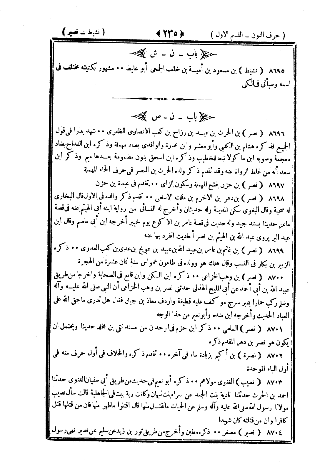 <235> النون بعدها الشين والصاد نشيد بن مسعود بن أمية بن خلف الجمحي أبو غليظ مشهور بكنيته مختلف في اسمه وسيأتي في الكنى نصر بن الحارث بن عبد رزاح بن كعب الأنصاري الظفري شهد بدار في قول الجميع فذكره هشام بن الكلبي وأبو معشر وابن عمارة والواقدي بصاد مهملة وذكره بن القداح لضاد معجمة وصوبه بن ماكولا تبعا للخطيب وذكره بن إسحاق بنون مضمومة بعدها ميم وذكر بن سعد أنه من غلط الرواة عنه وقد تقدم ذكر ولده الحارث بن النضر في حرف الحاء المهملة نصر بن حزن بفتح المهملة وسكون الزاي تقدم في عبدة بن حزن نصر بن دهر بن الأخرم بن مالك الأسلمي تقدم ذكر والده في الأول قال البخاري له صحبة وقال البغوي سكن المدينة وله حديثان وأخرج له النسائي من رواية ابنه أبي الهيثم عنه في قصة ماعز حديثا بسند جيد وله حديث في قصة عامر بن الأكوع يوم خيبر أخرجه بن أبي عاصم وقال بن عبد البر يروي عبد الله بن الهيثم بن نصر أحاديث انفرد بها عنه نصر بن غانم بن عامر بن عبد الله بن عبيد بن عويج بن عدي بن كعب العدوي ذكره الزبير بن بكار في النسب وقال هلك هو وولده في طاعون عمواس سنة ثمان عشرة من الهجرة نصر بن وهب الخزاعي ذكره بن السكن وابن قانع في الصحابة وأخرجا من طريق عبيد الله بن أبي حميد عن أبي المليح الهذلي حدثني نصر بن وهب الخزاعي أن النبي صلى الله عليه وسلم ركب حمارا بغير سرج موكف عليه قطيفة وأردف معاذ بن جبل فقال هل تدري ما حق الله على العباد الحديث وأخرجه بن منده وأبو نعيم من هذا الوجه نصر السلمي ذكر له بن حزم في الوحدان من مسند بقي بن مخلد حديثا ويحتمل أن يكون هو نصر بن دهر المقدم ذكره نصرة بن أكثم بزيادة هاء في آخره تقدم ذكره والخلاف في أول حرف منه في أول الباء الموحدة نصيب الغنوي مولاهم ذكره أبو نعيم في حديث من طريق أبي سفيان الغنوي حدثنا أحمد بن الحارث حدثتنا نادية بنت الجعد عن سراء بنت نبهان وكانت ربة بيت في الجاهلية قالت سأل نصيب مولانا رسول الله صلى الله عليه وسلم عن الحيات ما نقتل منها قال اقتلوا ما ظهر منها فإن من قتلها قتل كافرا وإن من قتلته كان شهيدا نصير مصغر ذكره مطين وأخرج من طريق ثور بن زيد عن سليم عن نصير نهى رسول §