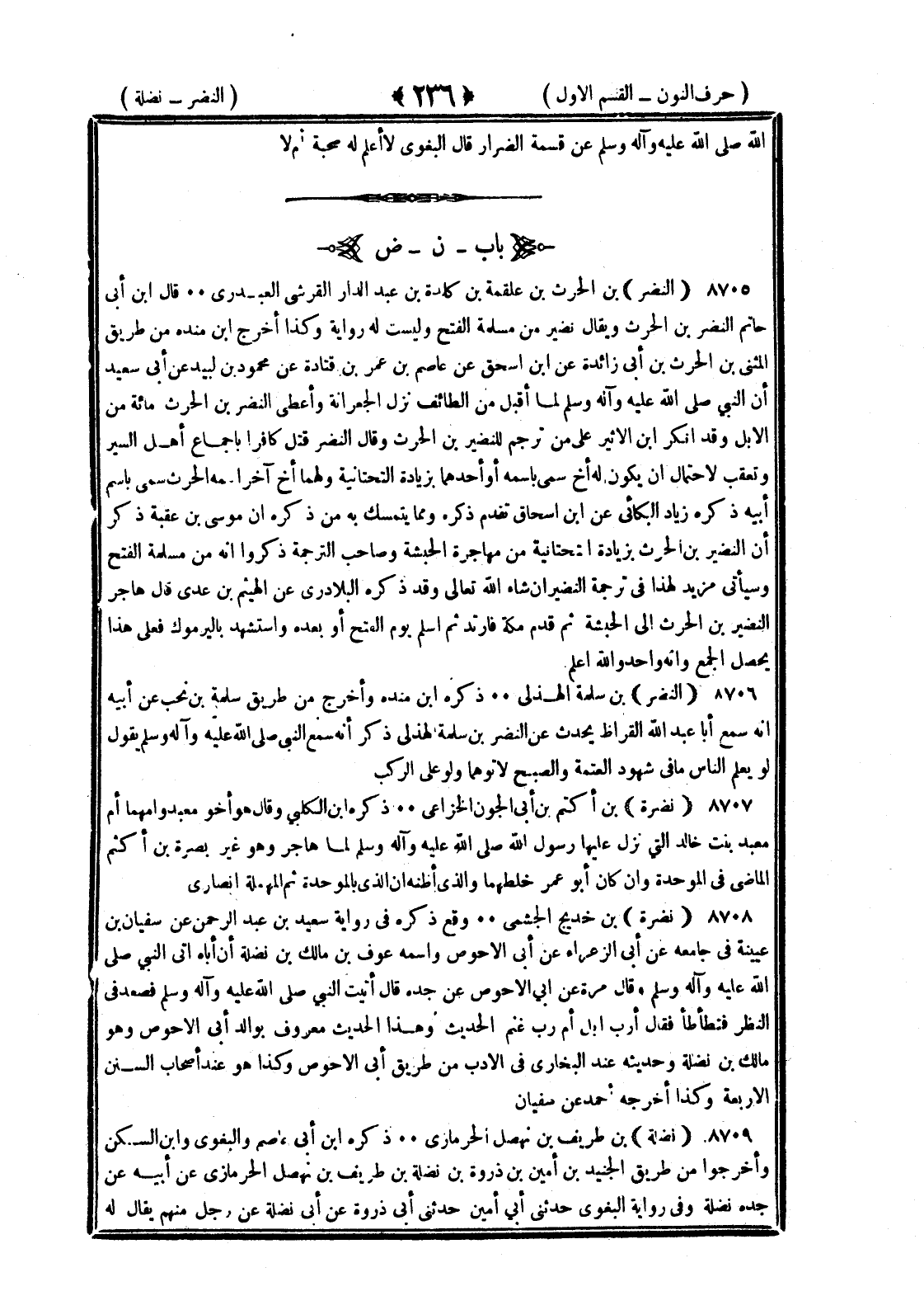 <236> الله صلى الله عليه وسلم عن قسمة الضرار قال البغوي لا أعلم له صحبة أم لا النون بعدها الضاد النضر بن الحارث بن علقمة بن كندة بن عبد الدار القرشي العبدري قال بن أبي حاتم النضر بن الحارث ويقال نضير من مسلمة الفتح وليست له رواية وكذا أخرج بن مندة من طريق المثنى بن الحارث بن أبي زائدة عن بن إسحاق عن عاصم بن عمر بن قتادة عن محمود بن لبيد عن أبي سعيد أن النبي صلى الله عليه وسلم لما أقبل من الطائف نزل الجعرانة وأعطى النضر بن الحارث مائة من الإبل وقد أنكر بن الأثير على من ترجم للنضير بن الحارث وقال النضر قتل كافرا بإجماع أهل السير وتعقب لاحتمال أن يكون له أخ سمي باسمه أو أحدهما بزيادة تحتانية ولهما أخ آخر اسمه الحارث سمي باسم أبيه ذكره زياد البكائي عن بن إسحاق تقدم ذكره ومما يتمسك به من ذكره أن موسى بن عقبة ذكر أن النضير بن الحارث بزيادة التحتانية من مهاجرة الحبشة وصاحب الترجمة ذكروا أنه من مسلمة الفتح وسيأتي مزيد لهذا في ترجمة النضير إن شاء الله تعالى وقد ذكره البلاذري عن الهيثم بن عدي قال هاجر النضير بن الحارث إلى الحبشة ثم قدم مكة فارتد ثم أسلم يوم الفتح أو بعده واستشهد باليرموك فعلى هذا يحصل الجمع وأنه واحد والله أعلم النضر بن سلمة الهذلي ذكره بن منده وأخرج من طريق سلمة بن سلمة بن نجب عن أبيه أنه سمع أبا عبد الله القراظ يحدث عن النضر بن سلمة الهذلي ذكر أنه سمع النبي صلى الله عليه وسلم يقول لو يعلم الناس ما في شهود العتمة والصبح لأتوهما ولو على الركب نضرة بن أكثم بن أبي الجون الخزاعي ذكره بن الكلبي وقال هو أخو معبد وأمهما أم معبد بنت خالد التي نزل عليها رسول الله صلى الله عليه وسلم لما هاجر وهو غير بصرة بن أكثم الماضي في الموحدة وإن كان أبو عمر خلطهما والذي أظنه أن الذي بالموحدة ثم المهملة أنصاري نضرة بن خديج الجشمي ووقع ذكره في رواية سعيد بن عبد الرحمن عن سفيان بن عيينة في جامعه عن أبي الزعراء عن أبي الأحوص واسمه عوف بن مالك بن نضلة أن أباه أتى النبي صلى الله عليه وسلم وقال مرة عن أبي الأحوص عن جده قال أتيت النبي صلى الله عليه وسلم فصعد في النظر وطأطا فقال أرب إبل أم رب غنم الحديث وهذا الحديث معروف بوالد أبي الأحوص وهو مالك بن نضلة وحديثه عند البخاري في الأدب من طريق أبي الأحوص وكذا هو عند أصحاب السنن الأربعة وكذا أخرجه أحمد عن سفيان نضلة بن طريف بن نهصل الحرمازي ذكره بن أبي عاصم والبغوي وابن السكن وأخرجوا من طريق الجنيد بن أمين بن ذروة بن نضلة بن طريف بن نهصل الحرمازي عن أبيه عن جده نضلة وفي رواية البغوي حدثني أبي أمين حدثني أبي ذروة عن أبي نضلة عن رجل منهم يقال له §
