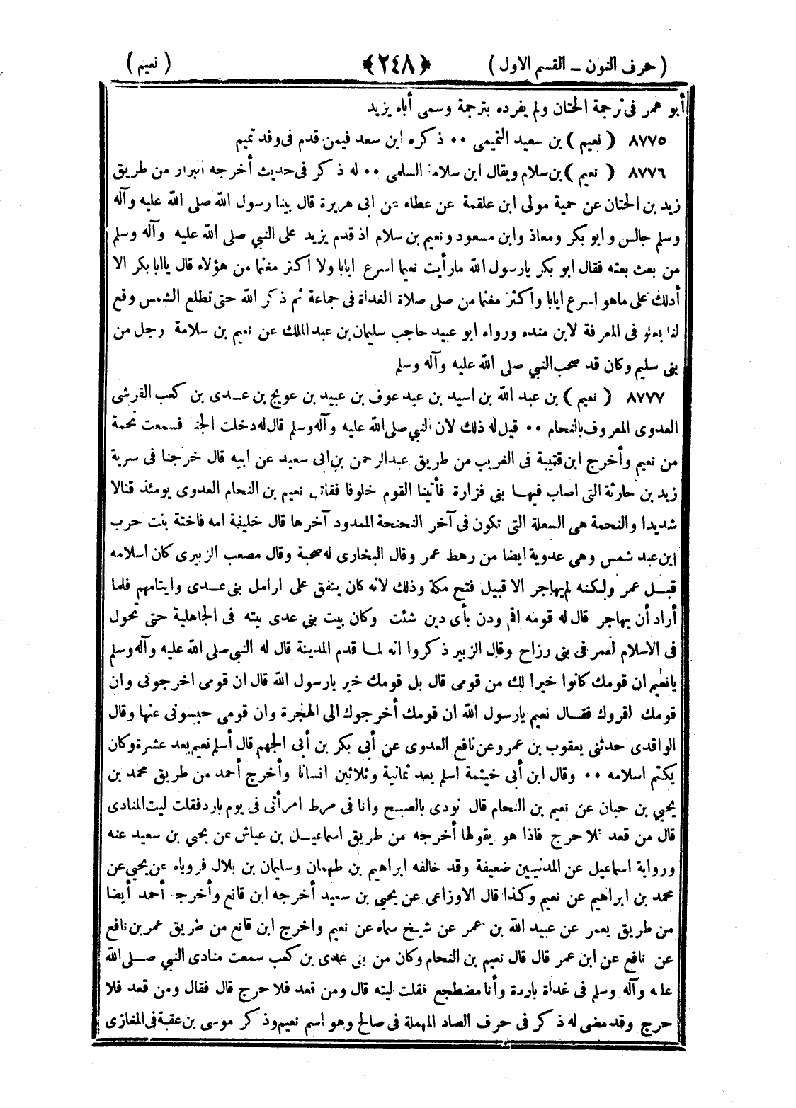 <248> أبو عمر في ترجمة الحتات ولم يفرده بترجمة وسمى أباه يزيد نعيم بن سعيد التميمي ذكره بن سعد فيمن قدم في وفد تميم على النبي صلى الله عليه وسلم نعيم بن سلام ويقال بن سلامة السلمي له ذكر في حديث أخرجه البزار من طريق زيد بن الحباب عن حميد مولى بن علقمة عن عطاء عن أبي هريرة قال بينا رسول الله صلى الله عليه وسلم جالس وأبو بكر وعمر ومعاذ وابن مسعود ونعيم بن سلام إذ قدم بريد على النبي صلى الله علي وآله وسلم من بعث بعثه فقال أبو بكر يا رسول الله ما رأيت نعيما أسرع إيابا ولا أكثر مغنما من هؤلاء قال يا أبا بكر ألا أدلك على ما هو أسرع إيابا وأكثر مغنما من صلى صلاة الغداة في جماعة ثم ذكر الله حتى تطلع الشمس وقع لنا بعلو في المعرفة لابن منده ورواه أبو عبيد حاجب سليمان بن عبد الملك عن نعيم بن سلامة رجل من بني سليم وكان قد صحب النبي صلى الله عليه وسلم نعيم بن عبد الله بن أسيد بن عبد بن عوف بن عويج بن عدي بن كعب القرشي العدوي المعروف بالنحام قيل له ذلك لأن النبي صلى الله عليه وسلم قال له دخلت الجنة فسمعت نحمة من نعيم وأخرج بن قتيبة في الغريب من طريق عبد الرحمن بن أبي سعيد عن أبيه قال خرجنا في سرية زيد بن حارثة التي أصاب فيها بني فزارة فأتينا القوم خلوفا فقاتل نعيم بن النحام العدوي يومئذ قتالا شديدا والنحمة هي السعلة التي تكون في آخر النحنحة الممدود آخرها قال خليفة أمه فاختة بنت حرب بن عبد شمس وهي عدوية أيضا من رهط عمرو قال البخاري له صحبة وقال مصعب الزبيري كان إسلامه قبل عمر ولكنه لم يهاجر إلا قبيل فتح مكة وذلك لأنه كان ينفق على أرامل بني عدي وأيتامهم فلما أراد أن يهاجر قال له قومه أقم ودن بأي دين شئت وكان بيت بنى عدي بيته في الجاهلية حتى تحول في الإسلام لعمر في بني رزاح وقال الزبير ذكروا أنه لما قدم المدينة قال له النبي صلى الله عليه وسلم يا نعيم إن قومك كانوا خيرا لك من قومي قال بل قومك خير يا رسول الله قال إن قومي أخرجوني وإن قومك أقروك فقال نعيم يا رسول الله إن قومك أخرجوك إلى الهجرة وإن قومي حبسوني عنها وقال الواقدي حدثني يعقوب بن عمرو عن نافع العدوي عن أبي بكر بن أبي الجهم قال أسلم نعيم بعد عشرة وكان يكتم إسلامه وقال بن أبي خيثمة أسلم بعد ثمانية وثلاثين إنسانا وأخرج أحمد من طريق محمد بن يحيى بن حبان عن نعيم بن النحام قال نودي بالصبح وأنا في مرط امرأتي في يوم بارد فقلت ليت المنادى قال من قعد فلا حرج فإذا هو يقوله أخرجه من طريق إسماعيل بن عياش عن يحيى بن سعيد عنه ورواية إسماعيل عن المدنيين ضعيفة وقد خالفه إبراهيم بن طهمان وسليمان بن بلال فروياه عن يحيى عن محمد بن إبراهيم عن نعيم وكذا قال الأوزاعي عن يحيى بن سعيد أخرجه بن قانع وأخرجه أحمد أيضا من طريق معمر عن عبيد الله بن عمر عن شيخ سماه عن نعيم وأخرج بن قانع من طريق عمر بن نافع عن نافع عن بن عمر قال قال نعيم بن النحام وكان من بني عدي بن كعب سمعت منادي النبي صلى الله عليه وسلم في غداة باردة وأنا مضطجع فقلت ليته قال ومن قعد فلا حرج قال فقال ومن قعد فلا حرج وقد مضى له ذكر في حرف الصاد المهملة في صالح وهو اسم نعيم وذكر موسى بن عقبة في المغازي §