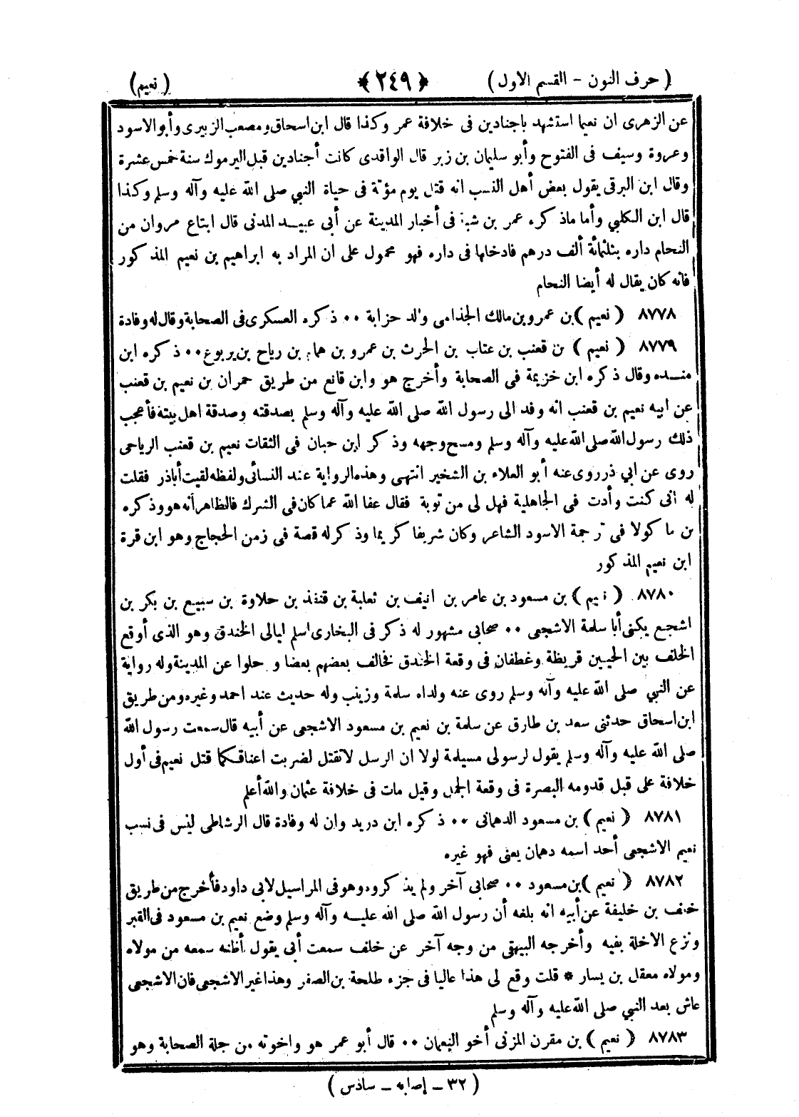 <249> عن الزهري أن نعيما استشهد بأجنادين في خلافة عمر وكذا قال بن إسحاق ومصعب الزبيري وأبو الأسود وعروة وسيف في الفتوح وأبو سليمان بن زير قال الواقدي كانت أجنادين قبل اليرموك سنة خمس عشرة وقال بن البرقي يقول بعض أهل النسب إنه قتل يوم مؤتة في حياة النبي صلى الله عليه وسلم وكذا قال بن الكلبي وأما ما ذكره عمر بن شبة في أخبار المدينة عن أبي عبيد المدني قال ابتاع مروان من النحام داره بثلثمائة ألف درهم فأدخلها في داره فهو محمول على أن المراد به إبراهيم بن نعيم المذكور فإنه كان يقال له أيضا النحام نعيم بن عمرو بن مالك الجذامي والد حزابة ذكره العسكري في الصحابة وقال له وفادة نعيم بن قعنب بن عتاب بن الحارث بن عمرو بن همام بن رياح بن يربوع ذكره بن منده وقال ذكره بن خزيمة في الصحابة وأخرج هو وابن قانع من طريق حمران بن نعيم بن قعنب عن أبيه نعيم بن قعنب أنه وفد الى رسول الله صلى الله عليه وسلم بصدقته وصدقة أهل بيته فأعجب ذلك رسول الله صلى الله عليه وسلم ومسح وجهه وذكر بن حبان في الثقات نعيم بن قعنب الرياحي روى عن أبي ذر روى عنه أبو العلاء بن الشخير انتهى وهذه الرواية عند النسائي ولفظه لقيت أبا ذر فقلت له اني كنت وأدت في الجاهلية فهل لي من توبة فقال عفا الله عما كان في الشرك فالظاهر أنه هو وذكره بن ماكولا في ترجمة الأسود الشاعر وكان شريفا كريما وذكر له قصة في زمن الحجاج وهو بن قرة بن نعيم المذكور نعيم بن مسعو بن عامر بن أنيف بن ثعلبة بن قنفذ بن خلاوة بن سبيع بن بكر بن أشجع يكنى أبا سلمة الأشجعي صحابي مشهور له ذكر في البخاري أسلم ليالي الخندق وهو الذي أوقع الخلف بين الحيين قريظة وغطفان في وقعة الخندق فخالف بعضهم بعضا ورحلوا عن المدينة وله رواية عن النبي صلى الله عليه وسلم روى عنه ولداه سلمة وزينب وله حديث عند أحمد وغيره ومن طريق بن إسحاق حدثني سعد بن طارق عن سلمة بن نعيم بن مسعود الأشجعي عن أبيه قال سمعت رسول الله صلى الله عليه وسلم يقول لرسولي مسيلمة لولا أن الرسل لا تقتل لضربت أعناقكما قتل نعيم في أول خلافة علي قبل قدومه البصرة في وقعة الجمل وقيل مات في خلافة عثمان والله أعلم نعيم مسعود الدهماني ذكره بن دريد وأن له وفادة قال الرشاطي ليس في نسب نعيم الأشجعي أحد اسمه دهمان يعني فهو غيره نعيم بن مسعود صحابي آخر ولم يذكروه وهو في المراسيل لأبي داود فأخرج من طريق خلف بن خليفة عن أبيه أنه بلغه أن رسول الله صلى الله عليه وسلم وضع نعيم بن مسعود في القير ونزع الأخلة بفيه وأخرجه البيهقي من وجه آخر عن خلف سمعت أبي يقول أظنه سمعه من مولاه ومولاه معقل بن يسار قلت وقع لي هذا عاليا في جزء طلحة بن الصقر وهذا غير الأشجعي فان الأشجعي عاش بعد النبي صلى الله عليه وسلم نعيم بن مقرن المزني أخو النعمان قال أبو عمر هو وإخوته من جلة الصحابة وهو §