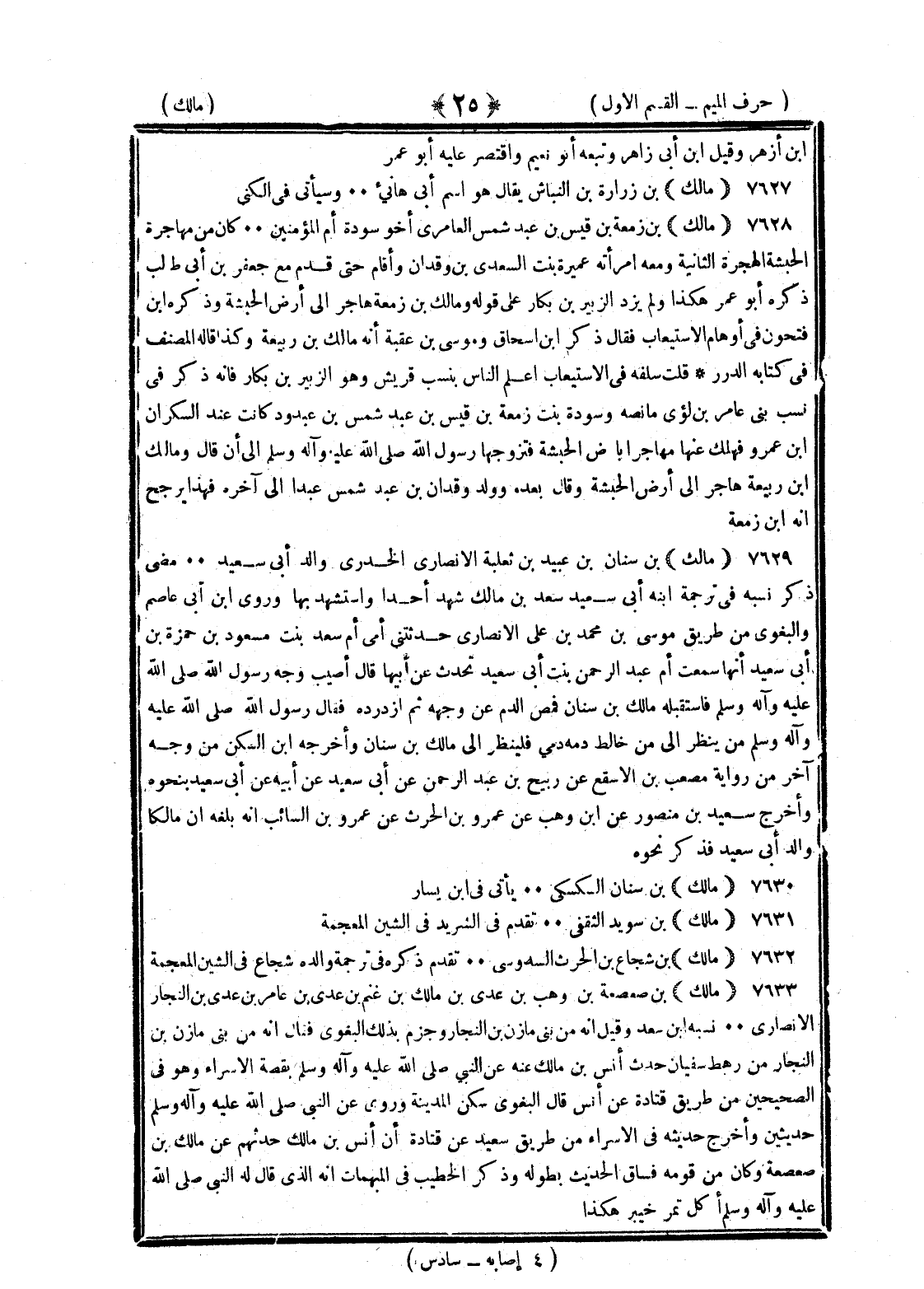 <25> بن ازهر وقيل بن أبي زاهر وتبعه بن نعيم واقتصر عليه أبو عمر مالك بن زرارة بن النباش يقال هو اسم أبي هانئ وسيأتي في الكنى مالك بن زمعة بن قيس بن عبد شمس العامري أخو سودة أم المؤمنين كان من مهاجرة الحبشة الثانية ومعه امرأته عميرة بنت السعدي بن وقدان واقام حتى قدم مع جعفر بن أبي طالب ذكره أبو عمر هكذا ولم يزد الزبير بن بكار على قوله ومالك بن زمعة هاجر إلى أرض الحبشة وذكره بن فتحون في أوهام الاستيعاب فقال ذكر بن إسحاق وموسى بن عقبة انه مالك بن ربيعة وكذا قاله المصنف في كتابه الدرر قلت سلفه في الاستيعاب اعلم الناس بنسب قريش وهو الزبير بن بكار فإنه ذكر في نسب بني عامر بن لؤي ما نصه وسودة بنت زمعة بن قيس بن عبد شمس بن عبد ود كانت عند السكران بن عمرو فهلك عنها مهاجرا بأرض الحبشة فتزوجها رسول الله صلى الله عليه وسلم الى ان قال ومالك بن زمعة هاجر الى أرض الحبشة وقال بعده وولد وقدان بن عبد شمس عبدا الى آخره فهذا يرجح انه بن زمعة مالك بن سنان بن عبيد بن ثعلبة الأنصاري الخدري والد أبي سعيد مضى ذكر نسبه في ترجمة ابنه أبي سعيد سعد بن مالك شهد أحدا واستشهد بها وروى بن أبي عاصم والبغوي من طريق موسى بن محمد بن علي الأنصاري حدثتني أمي أم سعد بنت مسعود بن حمزة بن أبي سعيد انها سمعت أم عبد الرحمن بنت أبي سعيد تحدث عن أبيها قال أصيب وجه رسول الله صلى الله عليه وسلم فاستقبله مالك بن سنان فمص الدم عن وجهه ثم ازدرده فقال رسول الله صلى الله عليه وسلم من ينظر الى من خالط دمه دمى فلينظر الى مالك بن سنان وأخرجه بن السكن من وجه آخر من رواية مصعب بن الأسقع عن ربيح بن عبد الرحمن بن أبي سعيد عن أبيه عن أبي سعيد بنحوه واخرج سعيد بن منصور عن بن وهب عن عمرو بن الحارث عن عمرو بن السائب انه بلغه ان مالكا والد أبي سعيد فذكر نحوه مالك بن سنان السكسكي يأتي في بن يسار مالك بن سويد الثقفي تقدم في الشريد في الشين المعجمة مالك بن شجاع بن الحارث السدوسي تقدم ذكره في ترجمة والده شجاع في الشين المعجمة مالك بن صعصعة بن وهب بن عدي بن مالك بن غنم بن عدي بن عامر بن عدي بن النجار الأنصاري نسبه بن سعد وقيل انه من بني مازن بن النجار وجزم بذلك البغوي فقال انه من بني مازن بن النجار رهط سفيان حدث أنس بن مالك عنه عن النبي صلى الله عليه وسلم بقصة الإسراء وهو في الصحيحين من طريق قتادة عن أنس قال البغوي سكن المدينة وروى عن النبي صلى الله عليه وسلم حديثين واخرج حديثه في الإسراء من طريق سعيد بن قتادة ان أنس بن مالك حدثهم عن مالك بن صعصعة وكان من قومه فساق الحديث بطوله وذكر الخطيب في المبهمات انه الذي قال له النبي صلى الله عليه وسلم أكل تمر خيبر هكذا §