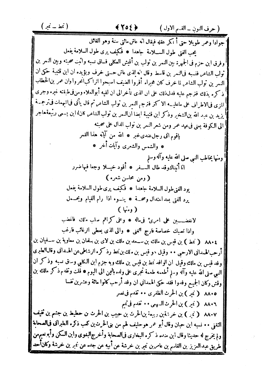 <254> جوادا وعمر طويلا حتى أنكر عقله فيقال انه عمر مائتي سنة وهو القائل يحب الفتى طول السلامة جاهدا فكيف يرى طول السلامة يفعل وفرق بن حزم في الجمهرة بين النمر بن تولب بن أقيش العكلي فساق نسبه وأثبت صحبته وبين النمر بن تولب الشاعر فنسبه في النمر بن قاسط وقال انه الذي عاش حتى خرف ويؤيده أن بن قتيبة حكى أن النمر بن تولب الشاعر لما خرف كان هجيراه اقروا الضيف أصبحوا الراكب انحروا وان عمر بن الخطاب ذكره بذلك فترحم عليه فدل ذلك على ان الذي تأخر الى أن لقيه أبو العلاء ومن في طبقته غيره وجرى المزي في الأطراف على ما عليه الأكثر فترجم النمر بن تولب الشاعر ثم قال يأتي في المبهمات في ترجمة يزيد بن عبد الله بن الشخير وذكر بن قتيبة أيضا أن النمر بن تولب الشاعر كان له بن يسمى ربيعة هاجر الى الكوفة يعني في عهد عمر ومن شعر النمر بن تولب الدال على صحبته يا قوم اني رجل عندي خبر لله من آياته هذا القمر والشمس والشعرى وآيات أخر ومنها يخاطب النبي صلى الله عليه وسلم انا أتيناك وقد طال السفر أقود خيلا رجعا فيها ضرر ومن محاسن شعره يود الفتى طول السلامة جاهدا فكيف يرى طول السلامة يفعل يرد الفتى بعد اعتدال وصحة ينوء إذا رام القيام ويحمل ومنها لا تغضبن على امرئ في ماله وعلى كرائم صلب مالك فاغضب وإذا تصبك خصاصة فارج الغنى والى الذي يعطي الرغائب فارغب نمط بن قبس بن مالك بن سعد بن مالك بن لأى بن سلمان بن معاوية بن سفيان بن أرحب الهمداني الأرحبي وقيل هو قيس بن مالك بن نمط وذكره الرشاطي عن الهمداني وقال الطبري وفد قيس بن مالك وقيل ان الوافد نمط بن قيس بن مالك وبه جزم بن الكلبي وساق نسبه وذكر أن النبي صلى الله عليه وسلم أطعمه طعمة تجري على ولده باليمن الى اليوم قلت وتقدم ذكر مالك بن وقش وكأن الجميع وفدوا فقد حكى الهمداني أن وفد أرحب كانوا مائة وعشرين نفسا نمير بن الحارث الظفري تقدم في نصر نمير بن الحارث السهمي تقدم في تميم نمير بن خرشة بن ربيعة بن الحارث بن حبيب بن الحارث بن حطيط بن جشم بن ثقيف الثقفي نسبه بن حبان وقال أبو عمر هو حليف لهم من بني الحارث بن كعب ذكره الطبراني في في الصحابة ولم يخرج له حديثا وقال بن منده ذكره البخاري في الصحابة وأخرج البغوي وابن السكن وأبو نعيم من طريق عبد العزيز بن القاسم بن عامر بن نمير بن خرشة عن جده عن نمير بن خرشة وكان أحد §