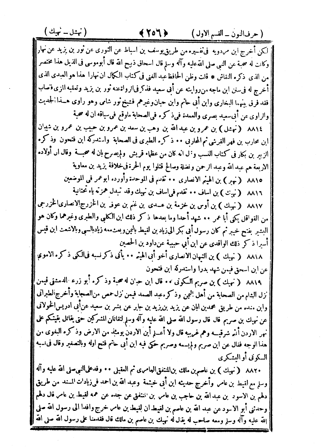 <256> لكن أخرج بن مردويه في تفسيره من طريق يوسف بن أسباط عن الثوري عن ثور بن يزيد عن نهار وكانت له صحبة عن النبي صلى الله عليه وسلم قال إسحاق ذبيح الله قال أبو موسى في الذيل هذا مختصر من الذي ذكره النقاش قلت وظن الحافظ عبد الغني في كتاب الكمال أن نهارا هذا هو العبدي الذي أخرج له في سنن بن ماجة من روايته عن أبي سعيد فذكر في الرواة عنه ثور بن يزيد وتعقبه المزي فأصاب فقد فرق بينهما البخاري وابن أبي حاتم وابن حبان وغيرهم فشيخ ثور شامي وهو راوي هذا الحديث والراوي عن أبي سعيد بصري والعمدة في ذكره في الصحابة ما وقع في سياقه أن له صحبة نهشل بن عمرو بن عبد الله بن وهب بن سعد بن عمرو بن حبيب بن عمرو بن شيبان بن محارب بن فهر القرشي ثم المحاربي ذكره الطبري في الصحابة واستدركه بن فتحون وذكره الزبير بن بكار في كتاب النسب وقال إنه كان من عظماء قريش ولم يصرح بأن له صحبة وقال ان أولاده الأربعة هم عبد الله وعبد الرحمن ونضلة وصالح قتلوا يوم الحرة في خلافة يزيد بن معاوية نهير بن الهيثم الأنصاري تقدم في الموحدة وأورده أبو عمر في الموضعين نهيك بن أساف تقدم في أساف بن نهيك وقد تبدل همزته ياء تحتانية نهيك بن أوس بن خزمة بن عدي بن أبي غنم بن عوف بن الخزرج الأنصاري الخزرجي من القوافل يكنى أبا عمر شهد أحدا وما بعدها ذكر ذلك بن الكلبي والطبري وغيرهما وكان هو البشير بفتح خيبر ثم كان رسول أبي بكر الى زياد بن لبيد باليمن وبعث معه زياد بالسبى وبالأشعث بن قيس أسيرا ذكر ذلك الواقدي عن بن أبي حبيبة عن داود بن الحصين نهيك بن التيهان الأنصاري أخو أبي الهيثم يأتي ذكر نسبه في الكنى ذكره الأموي عن بن إسحاق فيمن شهد بدرا واستدركه بن فتحون نهيك بن صريم السكوني قال بن حبان له صحبة وذكره أبو زرعة الدمشقي فيمن نزل الشام من الصحابة من أهل اليمن وذكره عبد الصمد فيمن نزل حمص من الصحابة وأخرج الطبراني وابن منده من طريق محمد بن أبان عن يزيد بن يزيد بن جابر عن بسر بن سعيد عن أبي إدريس الخولاني عن نهيك بن صريم قال قال رسول الله صلى الله عليه وسلم لتقاتلن المشركين حتى تقاتل بقيتكم على نهر الأردن الدجال أنتم شرقية وهم غربية قال ولا أعلم أين الأردن يومئذ من الأرض وذكره البغوي من هذا الوجه فقال عن بن صريم ولم يسمه وصريم حكى فيه بن أبي حاتم فتح أوله وبالتصغير وقال في نسبه السكوني أو اليشكري نهيك بن عاصم بن مالك بن المنتفق العامري ثم العقيلي وفد على النبي صلى الله عليه وسلم مع لقيط بن عامر وأخرج حديثه بن أبي خيثمة وعبد الله بن أحمد في زيادات المسند من طريق دلهم بن الأسود بن عبد الله بن حاجب بن عامر بن المنتفق عن جده عن عمه لقيط بن عامر قال دلهم وحدثني أبو الأسود عن عبد الله بن عاصم بن لقيط أن لقيط بن عامر خرج وافدا الى رسول الله صلى الله عليه وسلم ومعه صاحب له يقال له نهيك بن عاصم بن مالك قال فقدمنا على رسول الله صلى الله §