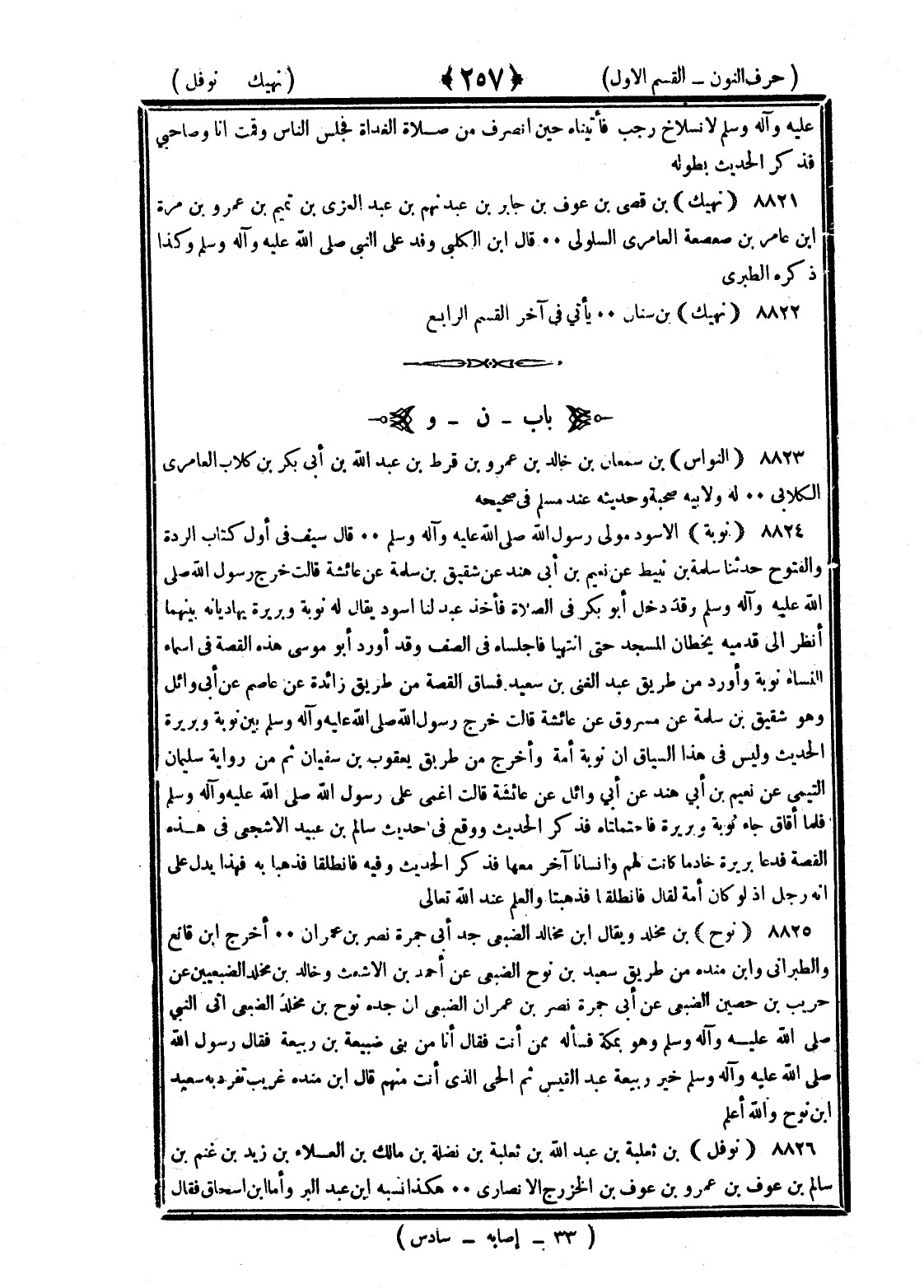 <257> عليه وسلم لانسلاخ رجب فأتيناه حين انصرف من صلاة الغداة فجلس الناس وقمت أنا وصاحبي فذكر الحديث بطوله نهيك بن قصي بن عوف بن جابر بن عبد نهم بن عبد العزى بن تميمة بن عمرو بن مرة بن عامر بن صعصعة العامري السلولي قال بن الكلبي وفد على النبي صلى الله عليه وسلم وكذا ذكره الطبري نهيك بن مساحق يأتي في آخر القسم الرابع النون بعدها الواو النواس بن سمعان بن خالد بن عمرو بن قرط بن عبد الله بن أبي بكر بن كلاب العامري الكلابي له ولأبيه صحبة وحديثه عند مسلم في صحيحه نوبة الأسود مولى رسول الله صلى الله عليه وسلم قال سيف في أول كتاب الردة والفتوح حدثنا سلمة بن نبيط عن نعيم بن أبي هند عن شقيق بن سلمة عن عائشة قالت خرج رسول الله صلى الله عليه وسلم وقد دخل أبو بكر في الصلاة فأجد عبد لنا أسود يقال له نوبة وبريرة يهاديانه بينهما أنظر الى قدميه يخطان المسجد حتى انتهيا فأجلساه في الصف وقد أورد أبو موسى هذه القصة في أسماء النساء نوبة وأورد من طريق عبد الغني بن سعيد فساق القصة من طريق زائدة عن عاصم عن أبي وائل وهو شقيق بن سلمة عن مسروق عن عائشة قالت خرج رسول الله صلى الله عليه وسلم بين نوبة وبريرة الحديث وليس في هذا السياق أن نوبة أمة وأخرج من طريق يعقوب بن سفيان ثم من رواية سليمان التيمي عن نعيم بن أبي هند عن أبي وائل عن عائشة قالت أغمي على رسول الله صلى الله عليه وسلم فلما أفاق جاء نوبة وبريرة فاحتملتاه فذكر الحديث ووقع في حديث سالم بن عبيد الأشجعي في هذه القصة فدعا بريرة خادما كانت لهم وانسانا آخر معها فذكر الحديث وفيه فانطلقا فذهبا به فهذا يدل على أنه رجل إذ لو كان أمة لقال فانطلقتا فذهبتا والعلم عند الله تعالى نوح بن مخلد الضبعي جد أبي جمرة نصر بن عمران أخرج بن قانع والطبراني وابن منده من طريق سعيد بن نوح الضبعي عن أحمد بن الأشعث وخالد بن مخلد الضبعيين عن حرب بن حصن الضبعي عن أبي جمرة نصر بن عمران الضبعي أن جده نوح بن مخلد الضبعي أتى النبي صلى الله عليه وسلم وهو بمكة فسأله ممن أنت فقال أنا من بني ضبيعة بن ربيعة فقال رسول الله صلى الله عليه وسلم خير ربيعة عبد القيس ثم الحي الذي أنت منهم قال بن منده غريب تفرد به سعيد بن نوح والله أعلم نوفل بن ثعلبة بن عبد الله بن ثعلبة بن نضلة بن مالك بن العلان بن زيد بن غنم بن سالم بن عوف بن عمرو بن عوف بن الخزرج الأنصاري هكذا نسبه بن عبد البر وأما بن إسحاق فقال §