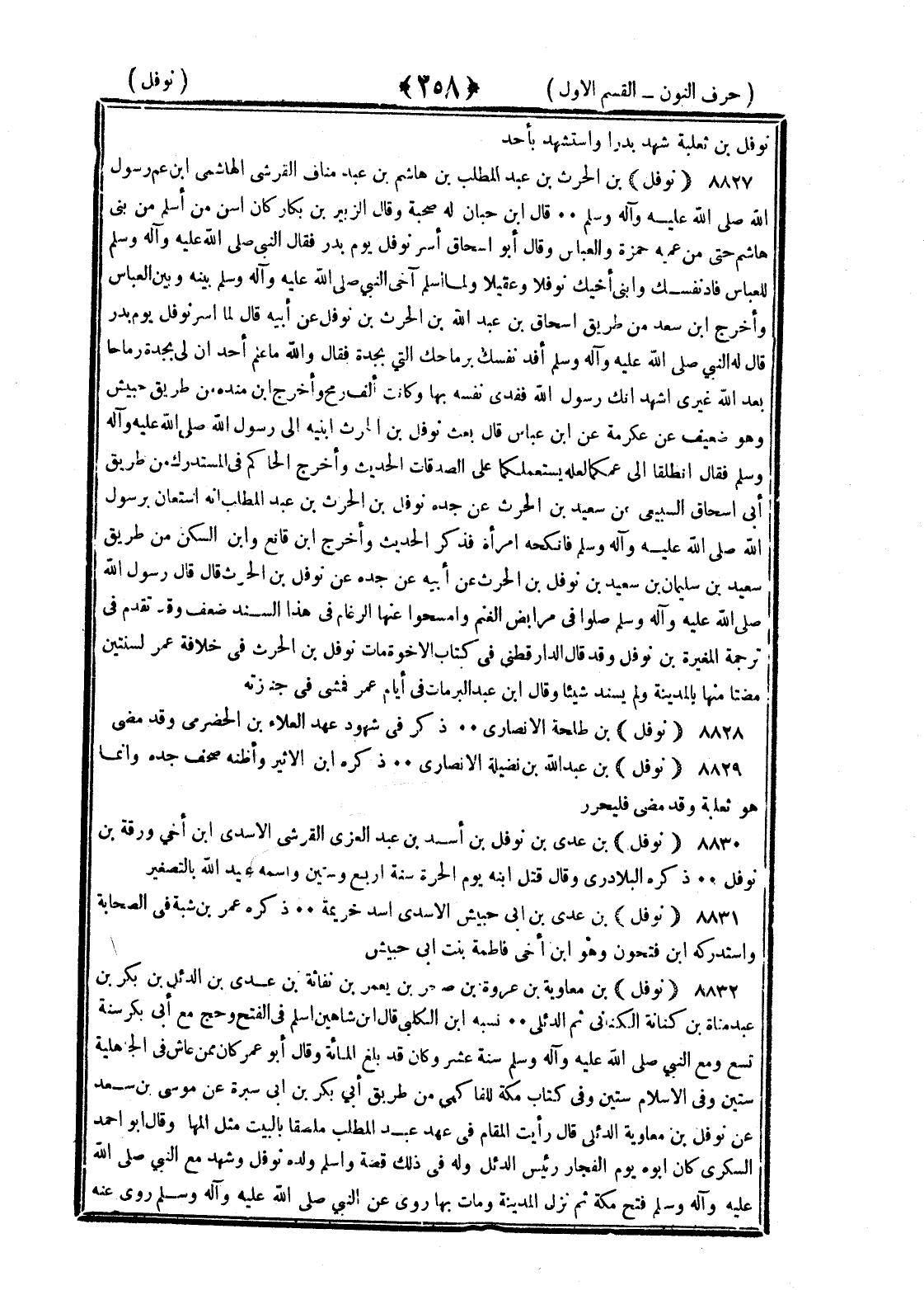 <258> نوفل بن ثعلبة شهد بدرا واستشهد بأحد نوفل بن الحارث بن عبد المطلب بن هاشم بن عبد مناف القرشي الهاشمي بن عم رسول الله صلى الله عليه وسلم قال بن حبان له صحبة وقال الزبير بن بكار كان أسن من أسلم من بني هاشم حتى من عميه حمزة والعباس وقال بن إسحاق أسر نوفل يوم بدر فقال النبي صلى الله عليه وسلم للعباس فاد نفسك وابني أخيك نوفلا وعقيلا ولما أسلم آخى النبي صلى الله عليه وسلم بينه وبين العباس وأخرج بن سعد من طريق إسحاق بن عبد الله بن الحارث بن نوفل عن أبيه قال لما أسر نوفل يوم بدر قال له النبي صلى الله عليه وسلم أفد نفسك برماحك التي بجدة فقال والله ما علم أحد أن لي بجدة رماحا بعد الله غيري أشهد أنك رسول الله ففدى نفسه بها وكانت ألف رمح وأخرج بن منده من طريق حبيش وهو ضعيف عن عكرمة عن بن عباس قال بعث نوفل بن الحارث ابنيه الى رسول الله صلى الله عليه وسلم فقال انطلقا الى عمكما لعله يستعملكما على الصدقات الحديث وأخرج الحاكم في المستدرك من طريق إسحاق السبيعي عن سعيد بن الحارث عن جده نوفل بن الحارث بن عبد المطلب أنه استعان برسول الله صلى الله عليه وسلم فأنكحه امرأة فذكر الحديث وأخرج بن قانع وابن السكن من طريق سعيد بن سليمان بن سعيد بن نوفل بن الحارث عن أبيه عن جده عن نوفل بن الحارث قال قال رسول الله صلى الله عليه وسلم صلوا في مرابض الغنم وامسحوا عنها الرغام في هذا السند ضعف وقد تقدم في ترجمة المغيرة بن نوفل وقد قال الدارقطني في كتاب الاخوة مات نوفل بن الحارث في خلافة عمر لسنتين مضتا منها بالمدينة ولم يسند شيئا وقال بن عبد البر مات في أيام عمر فمشى في جنازته نوفل بن طلحة الأنصاري ذكر في شهود عهد العلاء بن الحضرمي وقد مضى نوفل بن عبد الله بن نضلة الأنصاري ذكره بن الأثير وأظنه صحف جده وانما هو ثعلبة وقد مضى فليحرر نوفل بن عدي بن نوفل بن أسد بن عبد العزى القرشي الأسدي بن أخي ورقة بن نوفل ذكره البلاذري وقال قتل ابنه يوم الحرة سنة أربع وستين واسمه عبيد الله بالتصغير نوفل بن عدي بن أبي حبيش الأسدي أسد خزيمة ذكره عمر بن شبة في الصحابة واستدركه بن فتحون وهو بن أخي فاطمة بنت أبي حبيش نوفل بن معاوية بن عروة بن صخر بن يعمر بن نفاثة بن عدي بن الدئل بن بكر بن عبد مناة بن كنانة الكناني ثم الديلي نسبه بن الكلبي قال بن شاهين أسلم في الفتح وحج مع أبي بكر سنة تسع ومع النبي صلى الله عليه وسلم سنة عشر وكان قد بلغ المائة وقال أبو عمر كان ممن عاش في الجاهلية ستين وفي الإسلام ستين وفي كتاب مكة الفاكهي من طريق أبي بكر بن أبي سبرة عن موسى بن سعد عن نوفل بن معاوية الدئلي قال رأيت المقام في عهد عبد المطلب ملصقا بالبيت مثل المهاة قال أبو أحمد العسكري كان أبوه يوم الفجار رئيس الدئل وله في ذلك قصة وأسلم ولده نوفل وشهد مع النبي صلى الله عليه وسلم فتح مكة ثم نزل المدينة ومات بها روى عن النبي صلى الله عليه وسلم روى عنه §