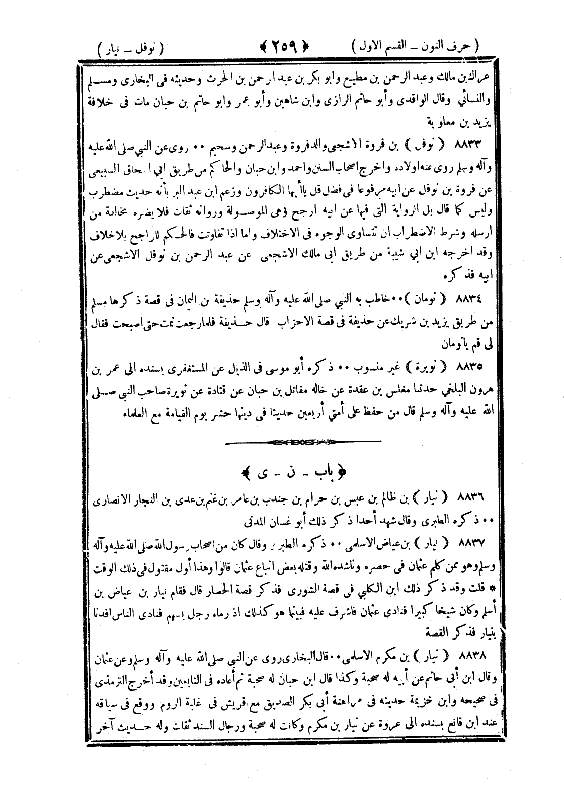 <259> عراك بن مالك وعبد الرحمن بن مطيع وأبو بكر بن عبد الرحمن بن الحارث وحديثه في البخاري ومسلم والنسائي وقال الواقدي وأبو حاتم الرازي وابن شاهين وأبو عمر وأبو حاتم وابن حبان مات في خلافة يزيد بن معاوية نوفل بن فروة الأشجعي والد فروة وعبد الرحمن وسحيم روى عن النبي صلى الله عليه وسلم روى عنه أولاده وأخرج أصحاب السنن وأحمد بن حبان والحاكم من طريق أبي إسحاق السبيعي عن فروة بن نوفل عن أبيه مرفوعا في فضل قل يأيها الكافرون وزعم بن عبد البر بأنه حديث مضطرب وليس كما قال بل الرواية التي فيها عن أبيه أرجح وهي الموصولة رواته ثقات فلا يضره مخالفة من أرسله وشرط الاضطراب أن تتساوى الوجوه في الاختلاف وأما إذا تفاوتت فالحكم للراجح بلا خلاف وقد أخرجه بن أبي شيبة من طريق أبي مالك الأشجعي عن عبد الرحمن بن نوفل الأشجعي عن أبيه فذكره نومان خاطب به النبي صلى الله عليه وسلم حذيفة بن اليمان في قصة ذكرها مسلم من طريق يزيد بن شريك عن حذيفة في قصة الأحزاب قال حذيفة فلما رجعت نمت حتى أصبحت فقال لي قم يا نومان نويرة غير منسوب ذكر أبو موسى في الذيل عن المستغفري بسنده الى عمر بن هارون البلخي حدثنا مغلس بن عقدة عن خاله مقاتل بن حيان عن قتادة عن نويرة صاحب النبي صلى الله عليه وسلم قال من حفظ على أمتي أربعين حديثا في دينها حشر يوم القيامة مع العلماء النون بعدها الياء نيار بن ظالم بن عبس بن حرام بن جندب بن عامر بن غنم بن عدي بن النجار الأنصاري ذكره الطبري وقال شهد أحدا ذكر ذلك أبو غسان المدني نيار بن عياض الأسلمي ذكره الطبري وقال كان من أصحاب رسول الله صلى الله عليه وسلم وهو ممن كلم عثمان في حصره وناشده الله وقتله بعض أتباع عثمان قالوا وهذا أول مقتول في ذلك الوقت قلت وقد ذكر ذلك بن الكلبي في قصة الشورى فذكر قصة الحصار قال فقام نيار بن عياض بن أسلم وكان شيخا كبيرا فنادى عثمان فأشرف عليه فبينما هو كذلك إذ رماه رجل بسهم فنادى الناس أقدنا بنيار فذكر القصة نيار بن مكرم الأسلمي قال البخاري روى عن النبي صلى الله عليه وسلم وعن عثمان وقال بن أبي حاتم عن أبيه له صحبة وكذا قال بن حبان له صحبة ثم أعاده في التابعين وقد أخرج الترمذي في صحيحه وابن خزيمة حديثه في مراهنة أبي بكر الصديق مع قريش في غلبة الروم ووقع في سياقه عند بن قانع بسنده الى عروة عن نيار بن مكرم وكانت له صحبة ورجال السند ثقات وله حديث آخر §
