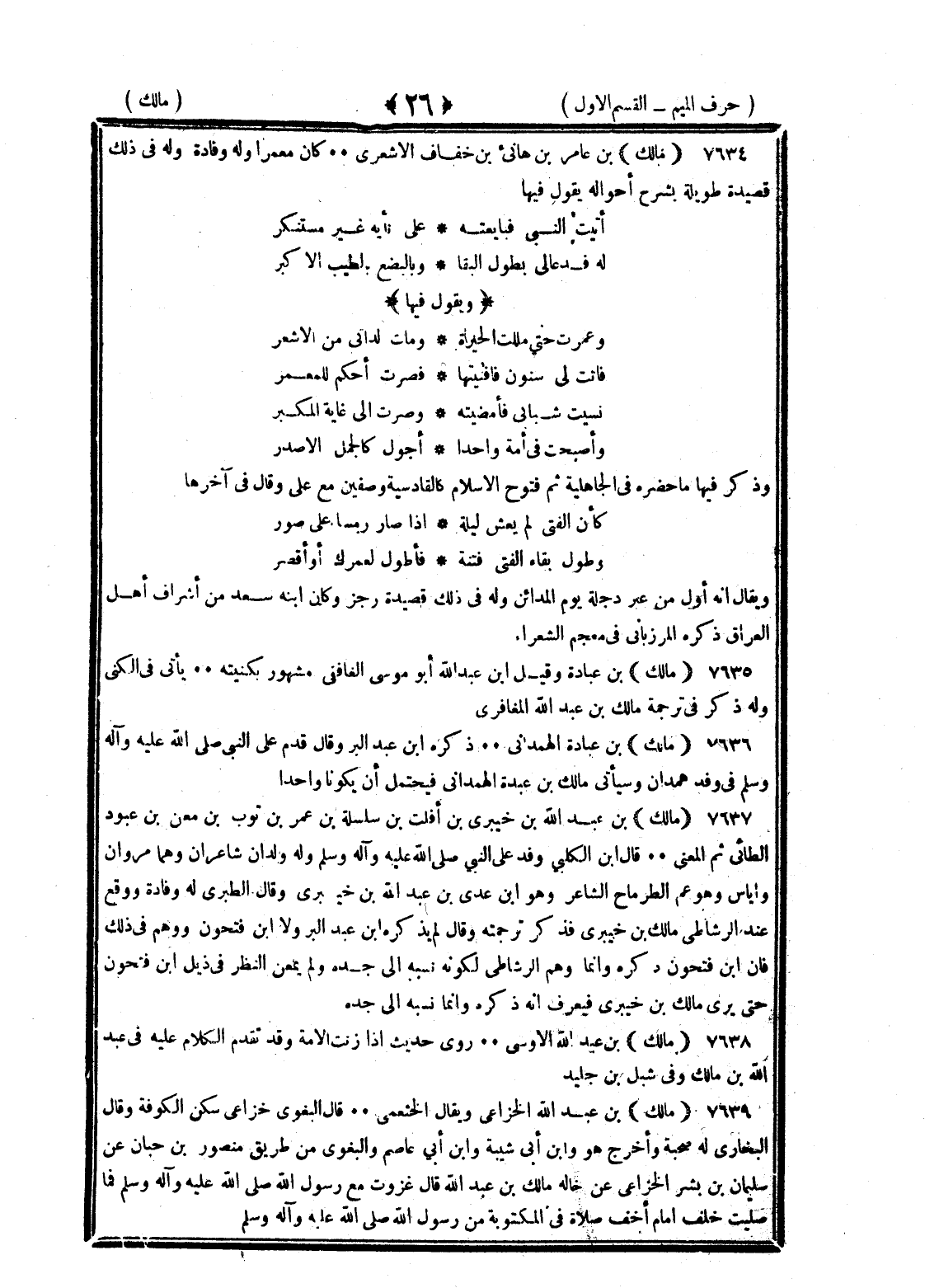 <26> مالك بن عامر بن هانئ بن خفاف الأشعري كان معمرا وله وفادة وله في ذلك قصيدة طويلة يشرح أحواله يقول فيها أتيت النبي فبايعته على نأيه غير مستنكر له فدعا لي بطول البقا وبالبضع بالطيب الأكبر ويقول فيها وعمرت حتى مللت الحياة ومات لداتي من الاشعر اتت لي سنون فافنيتها فصرت احكم للمعمر لبست شبابي فأنضيته وصرت الى غاية المكبر وأصبحت في امة واحدا أجول كالجمل الأصدر وذكر فيها ما حضره في الجاهلية ثم فتوح الإسلام كالقادسية وصفين مع على وقال في آخرها كأن الفتى لم يعش ليلة إذا صار رمسا على صوأر وطول بقاء الفتى فتنة فاطول لعمرك أو اقصر ويقال انه أول من عبر دجلة يوم المدائن وله في ذلك قصيدة رجز وكان ابنه سعد من اشراف أهل العراق ذكره المرزباني في معجم الشعراء مالك بن عبادة وقيل بن عبد الله أبو موسى الغافقي مشهور بكنيته يأتي في الكنى وله ذكر في ترجمة مالك بن عبد الله المعافري مالك بن عبادة الهمداني ذكره بن عبد البر وقال قدم على النبي صلى الله عليه وسلم في وفد همدان وسيأتي مالك بن عبدة الهمداني فيحتمل ان يكونا واحدا مالك بن عبد الله بن خيبري بن أفلت بن سلسلة بن عمرو بن سلسلة بن غنم بن ثوب بن معن بن عتود الطائي ثم المغني قال بن الكلبي وفد على النبي صلى الله عليه وسلم وله ولدان شاعران وهما مروان وإياس وهو عم الطرماح الشاعر وهو بن عدي بن عبد الله بن خيبري وقال الطبري له وفادة ووقع عند الرشاطي مالك بن خيبري فذكر ترجمته وقال لم يذكره بن عبد البر ولا بن فتحون ووهم في ذلك فان بن فتحون ذكره وانما وهم الرشاطي لكونه نسبه الى جده ولم يمعن النظر في ذيل بن فتحون حتى يرى مالك بن خيبري فيعرف انه ذكره وانما نسبه الى جده مالك بن عبد الله الأوسي روى حديث إذا زنت الأمة وقد تقدم الكلام عليه في عبد الله بن مالك وفي شبل بن خليد مالك بن عبد الله الخزاعي ويقال الخثعمي قال البغوي خزاعي سكن الكوفة وقال البخاري له صحبة واخرج هو وابن أبي شيبة وابن أبي عاصم والبغوي من طريق منصور بن حبان عن سليمان بن بشر الخزاعي عن خاله مالك بن عبد الله قال غزوت مع رسول الله صلى الله عليه وسلم فما صليت خلف امام أخف صلاة في المكتوبة من رسول الله صلى الله عليه وسلم §