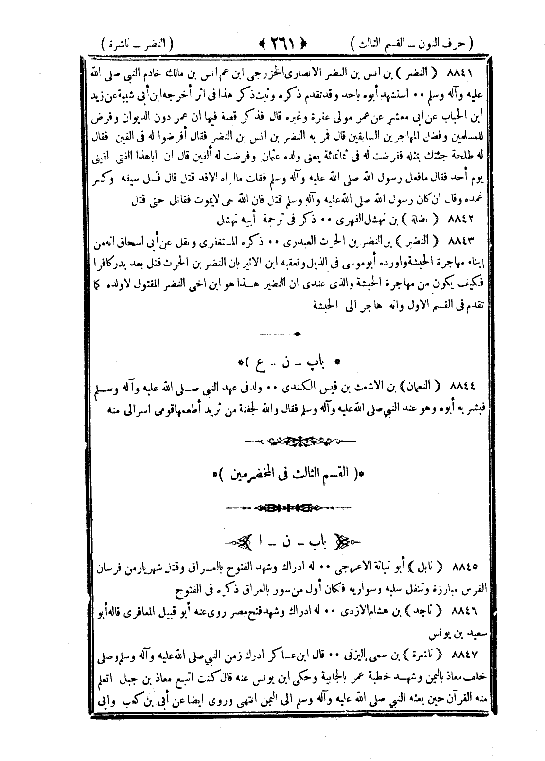 <261> النضر بن أنس بن النضر الأنصاري الخزرجي بن عم أنس بن مالك خادم النبي صلى الله عليه وسلم استشهد أبوه بأحد وقد تقدم ذكره وثبت ذكر هذا في أثر أخرجه بن أبي شيبة عن زيد بن الحباب عن أبي معشر عن عمر مولى عفرة وغيره قال فذكر قصة فيها أن عمر دون الديوان وفرض للمسلمين وفضل المهاجرين السابقين قال فمر به النضر فقال افرضوا له في ألفين فقال له طلحة جئتك بمثله ففرضت له في ثمانمائة يعني ولده عثمان وفرضت له ألفين قال إن أبا هذا الفتى لقيني يوم أحد فقال ما فعل رسول الله صلى الله عليه وسلم فقلت ما أراه إلا قد قتل قال فسل سيفه وكسر غمده وقال إن كان رسول الله صلى الله عليه وسلم قتل فان الله حي لا يموت فقاتل حتى قتل نضلة بن نهشل الفهري ذكر في ترجمة أبيه نهشل النضير بن النضر بن الحارث العبدري ذكره المستغفري ونقل عن أبي إسحاق أنه من أبناء مهاجرة الحبشة وأورده أبو موسى في الذيل وتعقبه بن الأثير بأن النضر بن الحارث قتل بعد بدر كافرا فكيف يكون من مهاجرة الحبشة والذي عندي أن النضير هذا هو بن أخي النضر المقتول لا ولده كما تقدم في القسم الأول وأنه هاجر الى الحبشة النون بعدها العين النعمان بن الأشعث بن قيس الكندي ولد في عهد النبي صلى الله عليه وسلم فبشر به أبوه وهو عند النبي صلى الله عليه وسلم فقال والله لجفنة من ثريد أطعمها قومي أسر الي منه القسم الثالث في المخضرمين بعدها الألف نابل أبو نباتة الأعرجي له إدراك وشهد الفتوح بالعراق وقتل شهربا من فرسان الفرس مبارزة ونفل سلبه وسواريه فكان من أول من سور بالعراق ذكروه في الفتوح ناجد بن هشام الأزدي له إدراك وشهد فتح مصر روى عنه أبو قبيل المعافري قاله أبو سعيد بن يونس ناشرة بن سمى اليزني قال بن عساكر أدرك زمن النبي صلى الله عليه وسلم وصلى خلف معاذ باليمن وشهد خطبة عمر بالجابية وحكى بن يونس عنه قال كنت أتبع معاذ بن جبل أتعلم منه القرآن حين بعثه النبي صلى الله عليه وسلم الى اليمن انتهى وروى أيضا عن أبي بن كعب وأبي §