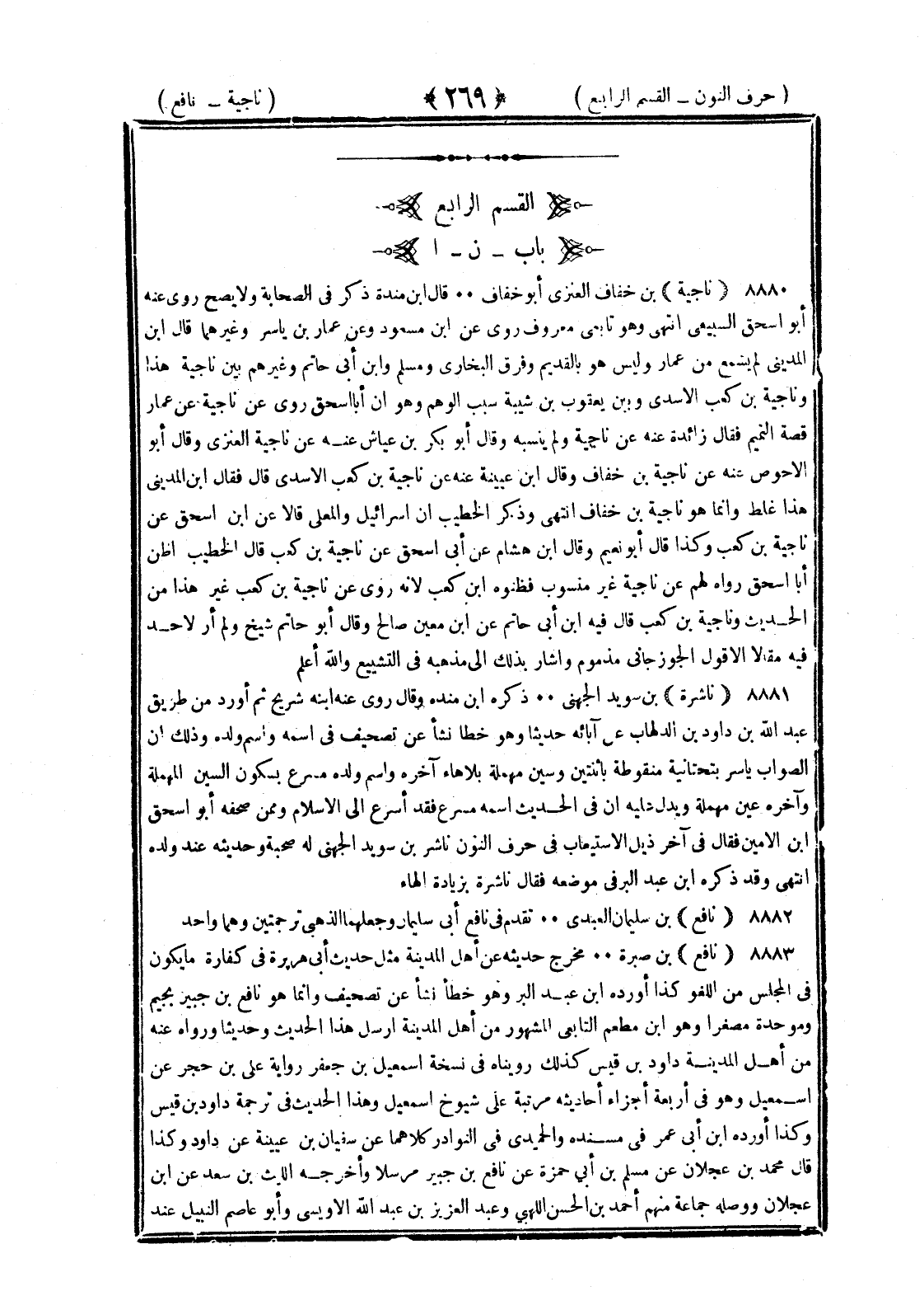 <269> القسم الرابع بعدها الألف ناجية بن خفاف العنزي أبو خفاف قال بن منده ذكر في الصحابة ولا يصح روى عنه أبو إسحاق السبيعي انتهى وهو تابعي معروف روى عن بن مسعود وعن عمار بن ياسر وغيرهما قال بن المديني لم يسمع من عمار وليس هو بالقديم وفرق البخاري ومسلم وابن أبي حاتم وغيرهم بين ناجية هذا وناجية بن كعب الأسدي ويعقوب بن شيبة سبب الوهم وهو أن أبا إسحاق روى عن ناجية عن عمار قصة التيمم فقال زائدة عن بن ناجية ولم ينسبه وقال أبو بكر بن عياش عنه عن ناجية العنزي وقال أبو الأحوص عنه عن ناجية بن خفاف وقال بن عيينة عنه عن ناجية بن كعب الأسدي قال فقال بن المديني هذا غلط وانما هو ناجية بن خفاف انتهى وذكر الخطيب أن إسرائيل والمعلى قالا عن بن إسحاق عن ناجية بن كعب وكذا قال أبو نعيم وقال بن هشام عن أبي إسحاق عن ناجية بن كعب قال الخطيب أظن أبا إسحاق رواه لهم عن ناجية غير منسوب فظنوه بن كعب لأنه روى عن ناجية بن كعب غير هذا من الحديث وناجية بن كعب قال فيه بن أبي خيثمة عن بن معين صالح وقال أبو حاتم شيخ ولم أر لأحد فيه مقالا الا قول الجوزجاني مذموم وأشار بذلك الى مذهبه في التشيع والله أعلم ناشرة بن سويد الجهني ذكره بن منده وقال روى عنه ابنه مريح ثم أورد من طريق عبد الله بن داود بن الدلهاب وعن آبائه حديثا وهو خطأ نشأ عن تصحيف في اسمه واسم ولده وذلك أن الصواب ياسر بتحتانية منقوطة باثنتين وسين مهملة بلا هاء آخره واسم ولده مسرع بسكون السين المهملة وآخره عين مهملة ويدل عليه أن في الحديث اسمه مسرع فقد أسرع الى الإسلام وممن صحفه أبو إسحاق بن الأمين فقال في آخر ذيل الاستيعاب في حرف النون ناشر بن سويد الجهني له صحبة وحديثه عند ولده انتهى وقد ذكره بن عبد البر في موضعه فقال ناشرة بزيادة الهاء نافع بن سليمان العبدي تقدم في نافع أبي سليمان وجعلهما الذهبي ترجمتين وهما واحد نافع بن صبرة مخرج حديثه عن أهل المدينة مثل حديث أبي هريرة في كفارة ما يكون في المجلس من اللغو كذا أورده بن عبد البر وهو خطأ نشأ عن تصحيف وانما هو نافع بن جبير بجيم وموحدة مصغرا وهو بن مطعم التابعي المشهور من أهل المدينة أرسل هذا الحديث ورواه عنه من أهل المدينة داود بن قيس كذلك رويناه في نسخة إسماعيل بن جعفر رواية علي بن حجر عن إسماعيل وهي في أربعة أجزاء أحاديثه مرتبة على شيوخ إسماعيل وهذا الحديث في ترجمة داود بن قيس وكذا أورده بن أبي عمر في مسنده والحميدي في النوادر وكلاهما عن سفيان بن عيينة عن داود وكذا قال محمد بن عجلان عن مسلم بن أبي حمزة عن نافع بن جبير مرسلا وأخرجه الليث بن سعد عن بن عجلان وصلح جماعة منهم أحمد بن الحسن اللهبي وعبد العزيز بن عبد الله الأويسي وأبو عاصم النبيل عند §