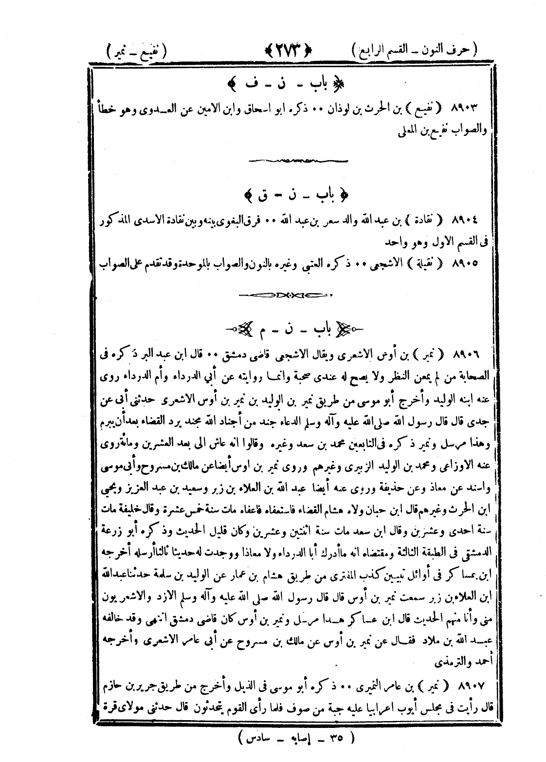 <273> النون بعدها الفاء والقاف نفيع بن الحارث بن لوذان ذكره أبو إسحاق وابن الأمين عن العدوي وهو خطأ والصواب نفيع بن المعلى نقادة بن عبد الله والد سعر بن عبد الله فرق البغوي بينه وبين نقادة الأسدي المذكور في القسم الأول وهو واحد نقيلة الأشجعي ذكره العتبي وغيره بالنون والصواب بالموحدة وقد تقدم على الصواب النون بعدها الميم نمير بن أوس الأشعري ويقال الأشجعي قاضي دمشق قال بن عبد البر ذكره في الصحابة من لم يمعن النظر ولا يصح له عندي صحبة وانما روايته عن أبي الدرداء وأم الدرداء روى عنه ابنه الوليد وأخرج أبو موسى من طريق نمير بن الوليد بن نمير بن أوس الأشعري حدثني أبي عن جدي قال قال رسول الله صلى الله عليه وسلم الدعاء جند من أجناد الله مجند يرد القضاء بعد أن يبرم وهذا مرسل ونمير ذكره في التابعين محمد بن سعد وغيره وقالوا انه عاش الى بعد العشرين ومائة روى عنه الأوزاعي ومحمد بن الوليد الزبيري وغيرهم وروى نمير بن أوس أيضا عن مالك بن مسروح وأبي موسى وأسند عن معاذ وعن حذيفة وروى عنه أيضا عبد الله بن العلاء بن زبر وسعيد بن عبد العزيز ويحيى بن الحارث وغيرهم قال بن حبان ولاه هشام القضاء فاستعفاه فأعفاه مات سنة خمس عشرة وقال خليفة مات سنة إحدى وعشرين وقال بن سعد مات سنة اثنتين وعشرين وكان قليل الحديث وذكره أبو زرعة الدمشقي في الطبقة الثالثة ومقتضاه أنه ما أدرك أبا الدرداء ولا معاذا ووجدت له حديثا ثالثا أرسله أخرجه بن عساكر في أوائل تبيين كذب المفترى من طريق هشام بن عمار عن الوليد بن سلمة حدثنا عبد الله بن العلاء بن زبر سمعت نمير بن أوس قال قال رسول الله صلى الله عليه وسلم الأزد والأشعريون مني وأنا منهم الحديث قال بن عساكر هذا مرسل ونمير بن أوس كان قاضي دمشق انتهى وقد خالفه عبد الله بن ملاذ فقال عن تمير بن أوس عن مالك بن مسروح عن أبي عامر الأشعري وأخرجه أحمد والترمذي نمير بن عامر النميري ذكره أبو موسى في الذيل وأخرج من طريق جرير بن حازم قال رأيت في مجلس أيوب أعرابيا عليه جبة من صوف فلما رأى القوم يتحدثون قال حدثني مولاي قرة §