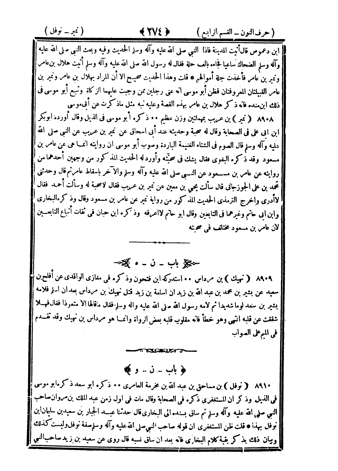 <274> بن دعموص قال أتيت المدينة فإذا النبي صلى الله عليه وسلم الحديث وفيه وبعث النبي صلى الله عليه وسلم الضحاك ساعيا فجاءه بألف حلة فقال له رسول الله صلى الله عليه وسلم أتيت هلال بن عامر ونمير بن عامر فأخذت جلة أموالهم قلت وهذا الحديث صحيح الا أن المراد بهلال بن عامر ونمير بن عامر القبيلتان المعروفتان فظن أبو موسى أنه عنى رجلين ممن وجبت عليهما الزكاة وتبع أبو موسى في ذلك بن منده فإنه ذكر هلال بن عامر بهذه القصة وعليه نبه مثل ما ذكرت عن أبي موسى نمير بن عريب بمهملتين وزن عظيم ذكره أبو موسى في الذيل وقال أورده أبو بكر بن أبي علي في الصحابة وقال له صحبة وحديثه عند أبي إسحاق عن نمير بن عريب عن النبي صلى الله عليه وسلم قال الصوم في الشتاء الغنيمة الباردة وصوب أبو موسى أن روايته إنما هي عن عامر بن مسعود وقد ذكره قبله البغوي فقال يشك في صحبته وأورد له الحديث المذكور من وجهين أحدهما من روايته عن عامر بن مسعود عن النبي صلى الله عليه وسلم والآخر بإسقاط عامر ثم قال وحدثني محمد بن علي الجوزجاني قال سألت يحيى بن معين عن نمير بن عريب فقال لا صحبة له وسألت أحمد فقال لا أدري وأخرج الترمذي الحديث المذكور من رواية نمير عن عامر بن مسعود وقال ذكره البخاري وابن أبي حاتم وغيرهما في التابعين وقال أبو حاتم لا أعرفه وذكره بن حبان في ثقات أتباع التابعين لأن عامر بن مسعود مختلف في صحبته النون بعدها الهاء نهيك بن مرداس استدركه بن فتحون وذكره في مغازي الواقدي عن أفلح بن سعيد عن بشير بن محمد بن عبد الله بن زيد أن أسامة بن زيد قتل نهيك بن مرداس بعد أن أسلم فلامه بشير بن سعد لوما شديدا ثم لامه رسول الله صلى الله عليه وسلم فقال ما قالها الا متعوذا فقال فهلا شققت عن قلبه انتهى وهو خطأ فإنه مقلوب قلبه بعض الرواة وانما هو مرداس بن نهيك وقد تقدم في الميم على الصواب النون بعدها الواو نوفل بن مساحق بن عبد الله بن مخرمة العامري أبو سعد ذكره أبو موسى في الذيل وذكر ان المستغفري ذكره في الصحابة وقال مات في أول زمن عبد الملك بن مروان صاحب النبي صلى الله عليه وسلم ثم ساق بسنده الى البخاري قال حدثنا عبد الجبار بن سعيد بن سليمان بن نوفل بهذا قلت ظن المستغفري أن قوله صاحب النبي صلى الله عليه وسلم صفة نوفل وليست كذلك وبيان ذلك بذكر بقية كلام البخاري فإنه بعد أن ساق نسبه قال روى عن سعيد بن زيد صاحب النبي §