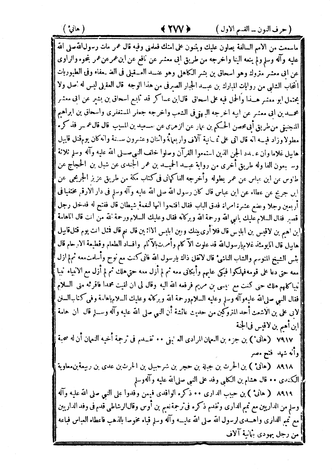 <277> ما سمعت من الأمم السالفة يصلون عليك ويثنون على أمتك فعلمني وفيه قال عمر مات رسول الله صلى الله عليه وسلم ولم ينعه إلينا وأخرجه من طريق أبي معشر عن نافع عن بن عمر عن عمر بنحوه والراوي عن أبي معشر متروك وهو إسحاق بن بشر الكاهلي وهو عند العقيلي في الضعفاء وفي الطيوريات انتخاب السلفي من روايات المبارك بن عبد الجبار الصيرفي من هذا الوجه قال العقيلي ليس له أصل ولا يحتمل أبو معشر هذا والحمل فيه على إسحاق قال بن عساكر قد تابع إسحاق بن بشير عن أبي معشر محمد بن أبي معشر عن أبيه أخرجه البيهقي في الشعب وأخرجه جعفر المستغفري وإسحاق بن إبراهيم المنجنيقي من طريق أبي محصن الحكم بن عمار عن الزهري عن سعيد بن المسيب قال قال عمر فذكره مطولا وزاد فيه انه قال أتى علي ثمانية آلاف وأربعمائة واثنتان وعشرون سنة وانه كان يوم قتل قابيل هابيل غلاما وان عدد الجن الذين استمعوا القرآن وصلوا خلف النبي صلى الله عليه وسلم ثلاثة وسبعون ألفا وله طريق أخرى من رواية عبد الحميد بن عمر الجندي عن شبل بن الحجاج عن طاوس عن بن عباس عن عمر بطوله وأخرجه الفاكهي في كتاب مكة من طريق عزيز الجريجي عن بن جريج عن عطاء عن بن عباس قال كان رسول الله صلى الله عليه وسلم في دار الأرقم مختفيا في أربعين رجلا وبضع عشرة امرأة فدق الباب فقال افتحوا انها لنغمة شيطان قال ففتح له فدخل رجل قصير فقال السلام عليك يا نبي الله ورحمة الله وبركاته فقال وعليك السلام ورحمة الله من أنت قال أنا هامة بن الهيم بن لاقيس بن إبليس قال فلا أرى بينك وبين إبليس الا اثنين قال نعم قال فمثل من أنت يوم قتل قابيل هابيل قال أنا يومئذ غلام يا رسول الله قد علوت الاكام وأمرت بالآثام وافساد الطعام وقطيعة الأرحام قال بئس الشيخ المتوسم والشاب الناشئ قال لا تقل ذاك يا رسول الله فاني كنت مع نوح وأسلمت معه ثم لم أزل معه حتى دعا على قومه فهلكوا فبكى عليهم وأبكاني معه ثم لم أزل معه حتى هلك ثم لم أزل مع الأنبياء نبيا نبيا كلهم هلك حتى كنت مع عيسى بن مريم فرفعه الله اليه وقال لي ان لقيت محمدا فأقرئه مني السلام فقال النبي صلى الله عليه وسلم وعليه السلام ورحمة الله وبركاته وعليك السلام يا همامة وفي كتاب السنن لأبي علي بن الأشعث أحد المتروكين من حديث عائشة أن النبي صلى الله عليه وسلم قال ان هامة بن هيم بن لاقيس في الجنة هانئ بن جزء بن النعمان المرادي القطيعي تقدم في ترجمة أخيه النعمان أن له صحبة وأنه شهد فتح مصر هانئ بن الحارث بن جبلة بن حجر بن شرحبيل بن الحارث بن عدي بن ربيعة بن معاوية الكندي قال هشام بن الكلبي وفد على النبي صلى الله عليه وسلم هانئ بن حبيب الداري ذكره الواقدي فيمن وفد على النبي صلى الله عليه وسلم من الداريين مع تميم الداري وتقدم ذكره في ترجمة نعيم بن أوس وقال الرشاطي قدم في وفد الداريين مع تميم الداري وأهدى لرسول الله صلى الله عليه وسلم قباء مخوصا بالذهب فأعطاه العباس فباعه من رجل يهودي بثمانية آلاف §