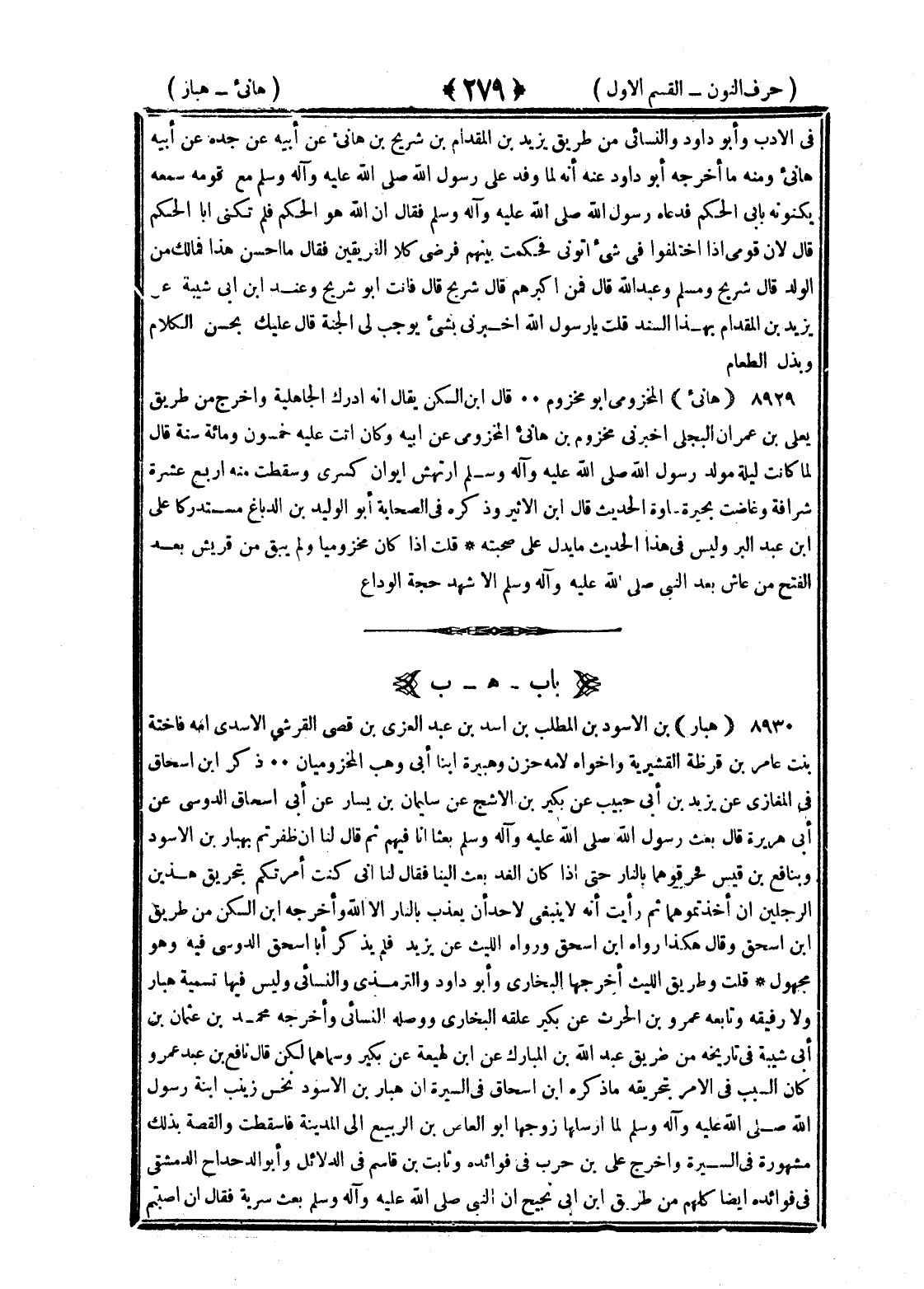 <279> في الأدب المفرد وأبو داود والنسائي من طريق يريد بن المقدام بن شريح بن هانئ عن أبيه عن جده عن أبيه هانئ ومنه ما أخرجه أبو داود عنه لما وفد على رسول الله صلى الله عليه وسلم مع قومه سمعهم يكنونه بأبي الحكم فدعاه رسول الله صلى الله عليه وسلم فقال ان الله هو الحكم فلم تكنى أبا الحكم قال لأن قومي إذا اختلفوا في شيء أتوني فحكمت بينهم فرضي كلا الفريقين فقال ما أحسن هذا فمالك من الولد قال شريح ومسلم وعبد الله قال فمن أكبرهم قال شريح قال فأنت أبو شريح وعند بن أبي شيبة عن يزيد بن المقدام بهذا السند قلت يا رسول الله أخبرني بشيء يوجب لي الجنة قال عليك بحسن الكلام وبذل الطعام هانئ المخزومي أبو مخزوم قال بن السكن يقال انه أدرك الجاهلية وأخرج من طريق يعلى بن عمران البجلي أخبرني مخزوم بن هانئ المخزومي عن أبيه وكان أتت عليه خمسون ومائة سنة قال لما كانت ليلة مولد رسول الله صلى الله عليه وسلم ارتج ايوان كسرى وسقطت منه أربع عشرة شرفة وغاضت بحيرة ساوة الحديث قال بن الأثير وذكره في الصحابة أبو الوليد بن الدباغ مستدركا على بن عبد البر وليس في هذا الحديث ما يدل على صحبته قلت إذا كان مخزوميا لم يبق من قريش بعد الفتح من عاش بعد النبي صلى الله عليه وسلم الا شهد حجة الوداع الهاء بعدها الباء هبار بن الأسود بن المطلب بن أسد بن عبد العزى بن قصي القرشي الأسدي أمه فاختة بنت عامر بن قرظة القشيرية وأخواه لأمه حزن وهبيرة ابنا أبي وهب المخزوميان ذكر بن إسحاق في المغازي عن يزيد بن أبي حبيب عن بكير بن الأشج عن سليمان بن يسار عن أبي إسحاق الدوسي عن أبي هريرة قال بعث رسول الله صلى الله عليه وسلم بعثا أنا فيهم ثم قال لنا ان ظفرتم بهبار بن الأسود وبنافع بن قيس فحرقوهما بالنار حتى إذا كان الغد بعث إلينا فقال لنا اني كنت أمرتكم بتحريق هذين الرجلين ان أخذتموهما ثم رأيت انه لا ينبغي لأحد أن يعذب بالنار الا الله وأخرجه بن السكن من طريق بن إسحاق وقال هكذا رواه بن إسحاق ورواه الليث عن يزيد فلم يذكر أبا إسحاق الدوسي فيه وهو مجهول قلت وطريق الليث أخرجها البخاري وأبو داود والترمذي والنسائي وليس فيها تسمية هبار ولا رفيقه وتابعه عمرو بن الحارث عن بكير علقه البخاري ووصله النسائي وأخرجه محمد بن عثمان بن أبي شيبة في تاريخه من طريق عبد الله بن المبارك عن بن لهيعة عن بكير وسماهما لكن قال نافع بن عبد عمرو وكان السبب في الأمر بتحريقه ما ذكره بن إسحاق في السيرة أن هبار بن الأسود نخس زينب ابنة رسول صلى الله عليه وسلم لما أرسلها زوجها أبو العاص بن الربيع الى المدينة فأسقطت والقصة بذلك مشهورة في السيرة وأخرج علي بن حرب في فوائده وثابت بن قيس في الدلائل وأبو الدحداح الدمشقي في فوائده أيضا كلهم من طريق بن أبي نجيح أن النبي صلى الله عليه وسلم بعث سرية فقال ان أصبتم §