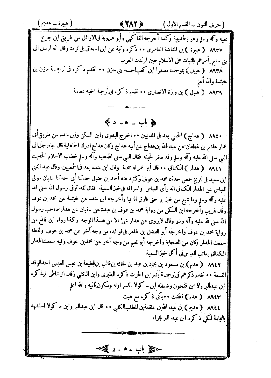 <282> عليه وسلم وهو بالحديبية وكذا أخرجه الفاكهي وأبو عروبة في الأوائل من طريق بن جريج هبيرة بن المفاضة العامري ذكره وثيمة عن بن إسحاق في الردة وقال انه أرسل الى بني سليم يأمرهم بالثبات على الإسلام حين ارتدت العرب هبيل بموحدة مصغرا بن كعب أحد بني مازن تقدم ذكره في ترجمة مازن بن خيثمة والله أعلم هبيل بن وبرة الأنصاري تقدم ذكره في ترجمة أخيه عصمة الهاء بعدها الدال هداج الحنفي يعد في المدنيين أخرج البغوي وابن السكن وابن منده من طريق أبي عمار هاشم بن غطفان عن عبد الله بن هداج عن أبيه هداج وكان هداج أدرك الجاهلية قال جاء رجل الى النبي صلى الله عليه وسلم وقد صفر لحيته فقال النبي صلى الله عليه وسلم خضاب الإسلام الحديث هدار الكناني قال أبو عمر له صحبة وقال بن منده يعد في الحمصيين وقال عبد الغني بن سعيد في تاريخ حمص حدثنا محمد بن عوف وكتبه عنه أحمد بن حنبل حدثنا أبي حدثنا سفيان مولى العباس عن الهدار الكناني أنه رأى العباس واسرافه في خبز السميذ فقال لقد توفي رسول الله صلى الله عليه وسلم وما شبع من خبز بر حتى فارق الدنيا وأخرجه بن منده عن خيثمة عن محمد بن عوف وقال غريب وأخرجه بن السكن من رواية محمد بن عوف وعبدة عن سفيان عن هدار صاحب رسول الله صلى الله عليه وسلم وقال لا يروى عن هدار شيء الا من هذا الوجه وكذا رواه بن قانع من رواية محمد بن عوف وأخرجه أبو الفضل بن طاهر في فوائده من وجه آخر عن محمد بن عوف ولفظه سمعت الهدار وكان من الصحابة وأخرجه أبو نعيم من وجه آخر عن محمد بن عوف وفيه سمعت الهدار الكناني يعاتب العباس في أكل خبز السميذ هدم بن مسعود بن بجاد بن عبد بن مالك بن غالب بن قطيعة بن عبس العبسي أحد الوفد التسعة تقدم ذكرهم في ترجمة بشر بن الحارث ذكره الطبري وابن الكلبي وقال الرشاطي لم يذكره بن عبد البر ولا بن فتحون وضبطه بن ماكولا بكسر أوله وسكون ثانيه والله أعلم هدم المخنث يأتي ذكره مع هيت هديم بن عبد الله بن علقمة بن المطلب الكلبي قال بن عبد البر وابن ماكولا استشهد باليمامة لكن ذكره بن عبد البر بالراء الهاء بعدها الراء §