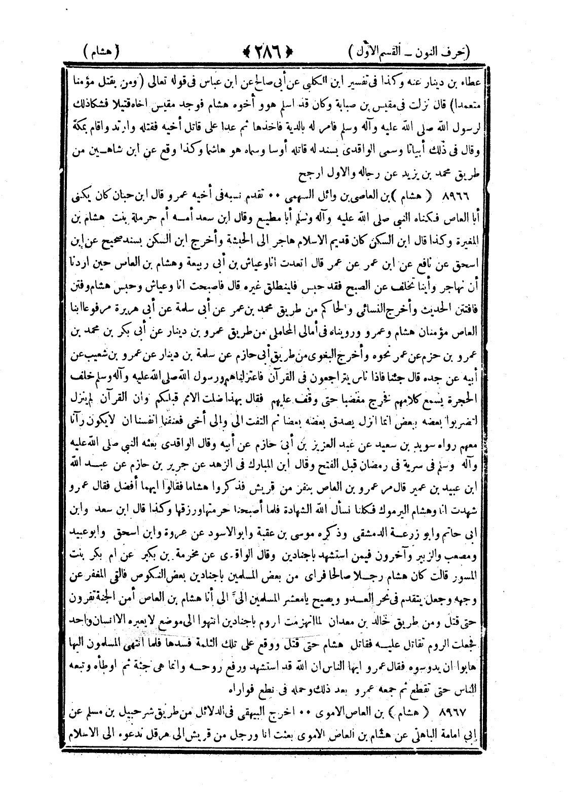 <286> عطاء بن دينار عنه وكذا في تفسير بن الكلبي عن أبي صالح عن بن عباس في قوله تعالى ومن يقتل مؤمنا متعمدا قال نزلت في مقيس بن صبابة وكان قد أسلم هو وأخوه هشام فوجد مقيس أخاه قتيلا فشكا ذلك لرسول الله صلى الله عليه وسلم فأمر له بالدية فأخذها ثم عدا على قاتل أخيه فقتله وارتد وأقام بمكة وقال في ذلك أبياتا وسمى الواقدي بسند له قاتله أوسا وسماه هو هاشما وكذا وقع عن بن شاهين من طريق محمد بن يزيد عن رجاله والأول أرجح هشام بن العاصي بن وائل السهمي تقدم نسبه في أخيه عمرو قال بن حبان كان يكنى أبا العاص فكناه النبي صلى الله عليه وسلم أبا مطيع وقال بن سعد أمه أم حرملة بنت هشام بن المغيرة وكذا قال بن السكن كان قديم الإسلام هاجر الى الحبشة وأخرج بن السكن بسند صحيح عن بن إسحاق عن نافع عن بن عمر عن عمر قال اتعدت أنا وعياش بن أبي ربيعة وهشام بن العاص حين أردنا أن نهاجر وأينا تخلف عن الصبح فقد حبس فلينطلق غيره قال فأصبحت أنا وعياش وحبس هشام وفتن فافتتن الحديث وأخرج النسائي والحاكم من طريق محمد بن عمر عن أبي سلمة عن أبي هريرة مرفوعا ابنا العاص مؤمنان هشام وعمرو ورويناه في أمالي المحاملي من طريق عمرو بن دينار عن أبي بكر بن محمد بن عمرو بن حزم عن عمر نحوه وأخرج البغوي من طريق أبي حازم عن سلمة بن دينار عن عمرو بن شعيب عن أبيه عن جده قال جئنا فإذا أناس يتراجعون في القرآن فاعتزلناهم ورسول الله صلى الله عليه وسلم خلف الحجرة يسمع كلامهم فخرج مغضبا حتى وقف عليهم فقال بهذا ضلت الأمم قبلكم وان القرآن لم ينزل لتضربوا بعضه ببعض إنما أنزل يصدق بعضه بعضا ثم التفت الي والى أخي فغبطنا أنفسنا أن لا يكون رآنا معهم رواه سويد بن سعيد عن عبد العزيز بن أبي حازم عن أبيه وقال الواقدي بعثه النبي صلى الله عليه وسلم في سرية في رمضان قبل الفتح وقال بن المبارك في الزهد عن جرير بن حازم عن عبد الله بن عبيد بن عمير قال مر عمرو بن العاص بنفر من قريش فذكروا هشاما فقالوا أيهما أفضل فقال عمرو شهدت أنا وهشام اليرموك فكلنا نسأل الله الشهادة فلما أصبحنا حرمتها ورزقها وكذا قال بن سعد وابن أبي حاتم وأبو زرعة الدمشقي وذكره موسى بن عقبة وأبو الأسود عن عروة وابن إسحاق وأبو عبيد ومصعب والزبير وآخرون فيمن استشهد بأجنادين وقال الواقدي عن مخرمة بن بكير عن أم بكر بنت المسور قالت كان هشام رجلا صالحا فرأى من بعض المسلمين بأجنادين بعض النكوص فألقى المفقر عن وجهه وجعل يتقدم في نحر العدو ويصيح يا معشر المسلمين الي الي أنا هشام بن العاص أمن الجنة تفرون حتى قتل ومن طريق خالد بن معدان لما انهزمت الروم بأجنادين انتهوا الى موضع لا يعبره الا انسان واحد فجعلت الروم تقاتل عليه فقاتل هشام حتى قتل ووقع على تلك الثلمة فسدها فما انتهى المسلمون إليها هابوا أن يدوسوه فقال عمرو أيها الناس ان الله قد استشهده ورفع روحه إنما هي جثة ثم أوطأه وتبعه الناس حتى تقطع ثم جمعه عمرو بعد ذلك وحمله في نطع فواراه هشام بن العاص الأموي أخرج البيهقي في الدلائل من طريق شرحبيل بن مسلم عن أبي أمامة الباهلي عن هشام بن العاص الأموي قال بعثت أنا ورجل من قريش الى هرقل ندعوه الى الإسلام §