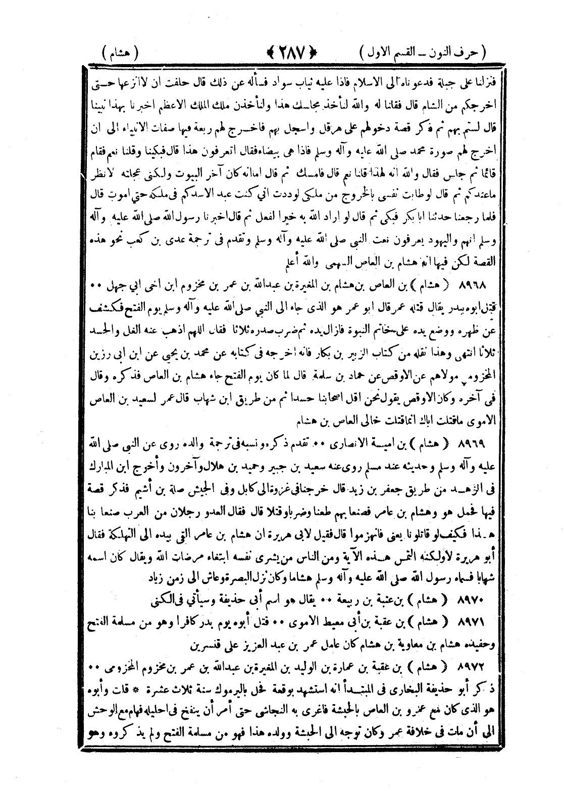 <287> فنزلنا على جبلة فدعوناه الى الإسلام فإذا عليه ثياب سواد فسأله عن ذلك قال حلفت ألا أنزعها حتى أخرجكم من الشام قال فقلنا له والله لنأخذن مجلسك هذا ولنأخذن منك الملك الأعظم أخبرنا بهذا نبينا قال لستم بهم ثم ذكر قصة دخولهم على هرقل واستخلائهم فأخرج لهم ربعة فيها صفات الأنبياء الى أن أخرج لهم صورة محمد صلى الله عليه وسلم فإذا هي بيضاء فقال أتعرفون هذا قال فبكينا وقلنا نعم فقام قائما ثم جلس فقال والله انه لهذا قلنا نعم قال فأمسك ثم قال اما انه كان آخر البيوت ولكني عجلته لأنظر ما عندكم ثم قال لو طابت نفسي بالخروج من ملكي لوددت أني كنت عبدا لأسدكم في ملكه حتى أموت قال فلما رجعنا حدثنا أبا بكر فبكى ثم قال لو أراد الله به خيرا لفعل ثم قال أخبرنا رسول الله صلى الله عليه وسلم أنهم واليهود يعرفون نعت النبي صلى الله عليه وسلم وتقدم في ترجمة عدي بن كعب نحو هذه القصة لكن فيها أنه هشام بن العاص السهمي والله أعلم هشام بن العاص بن هشام بن المغيرة بن عبد الله بن عمر بن مخزوم بن أخي أبي جهل قتل أبوه ببدر يقال قتله عمر قال أبو عمر هو الذي جاء الى النبي صلى الله عليه وسلم يوم الفتح فكشف عن ظهره ووضع يده على خاتم النبوة فأزال يده ثم ضرب صدره ثلاثا فقال اللهم أذهب عنه الغل والحسد ثلاثا انتهى وهذا نقله من كتاب الزبير بن بكار فإنه أخرجه في كتابه عن محمد بن يحيى عن بن أبي رزين المخزومي مولاهم عن الأوقص عن حماد بن سلمة قال لما كان يوم الفتح جاء هشام بن العاص فذكره وقال في آخره وكان الأوقص يقول نحن أقل أصحابنا حسدا ثم من طريق بن شهاب قال عمر لسعيد بن العاص الأموي ما قتلت أباك إنما قتلت خالي العاص بن هشام هشام بن عامر بن أمية الأنصاري تقدم ذكره ونسبه في ترجمة والده روى عن النبي صلى الله عليه وسلم وحديثه عند مسلم روى عنه سعيد بن جبير وحميد بن هلال وآخرون وأخرج بن المبارك في الزهد من طريق جعفر بن زيد قال خرجنا في غزوة الى كابل وفي الجيش صلة بن أشيم فذكر قصة فيها فحمل هو وهشام بن عامر فصنعا بهم طعنا وضربا وقتلا قال فقال العدو رجلان من العرب صنعا بنا هذا فكيف لو قاتلونا يعني فانهزموا قال فقيل لأبي هريرة ان هشام بن عامر ألقى بيده الى التهلكة فقال أبو هريرة لا ولكنه التمس هذه الآية ومن الناس من يشري نفسه ابتغاء مرضاة الله ويقال كان اسمه شهابا فسماه رسول الله صلى الله عليه وسلم وأله وسلم هشاما وكان نزل البصرة وعاش الى زمن زياد هشام بن عتبة بن ربيعة يقال هو اسم أبي حذيفة وسيأتي في الكنى هشام بن عقبة بن أبي معيط الأموي قتل أبوه يوم بدر كافرا وهو من مسلمة الفتح وحفيده هشام بن معاوية بن هشام كان عامل عمر بن عبد العزيز على قنسرين هشام بن عمارة بن الوليد بن المغيرة بن عبد الله بن عمر بن مخزوم المخزومي ذكر أبو حذيفة البخاري في المبتدأ انه استشهد بوقعة فحل باليرموك سنة ثلاث عشرة قلت وأبوه هو الذي كان مع عمرو بن العاص بالحبشة فأغرى به النجاشي حتى أمر أن ينفخ في احليله فهام مع الوحش الى أن مات في خلافة عمر وكان توجه الى الحبشة وولده هذا فهو من مسلمة الفتح ولم يذكروه وهو §