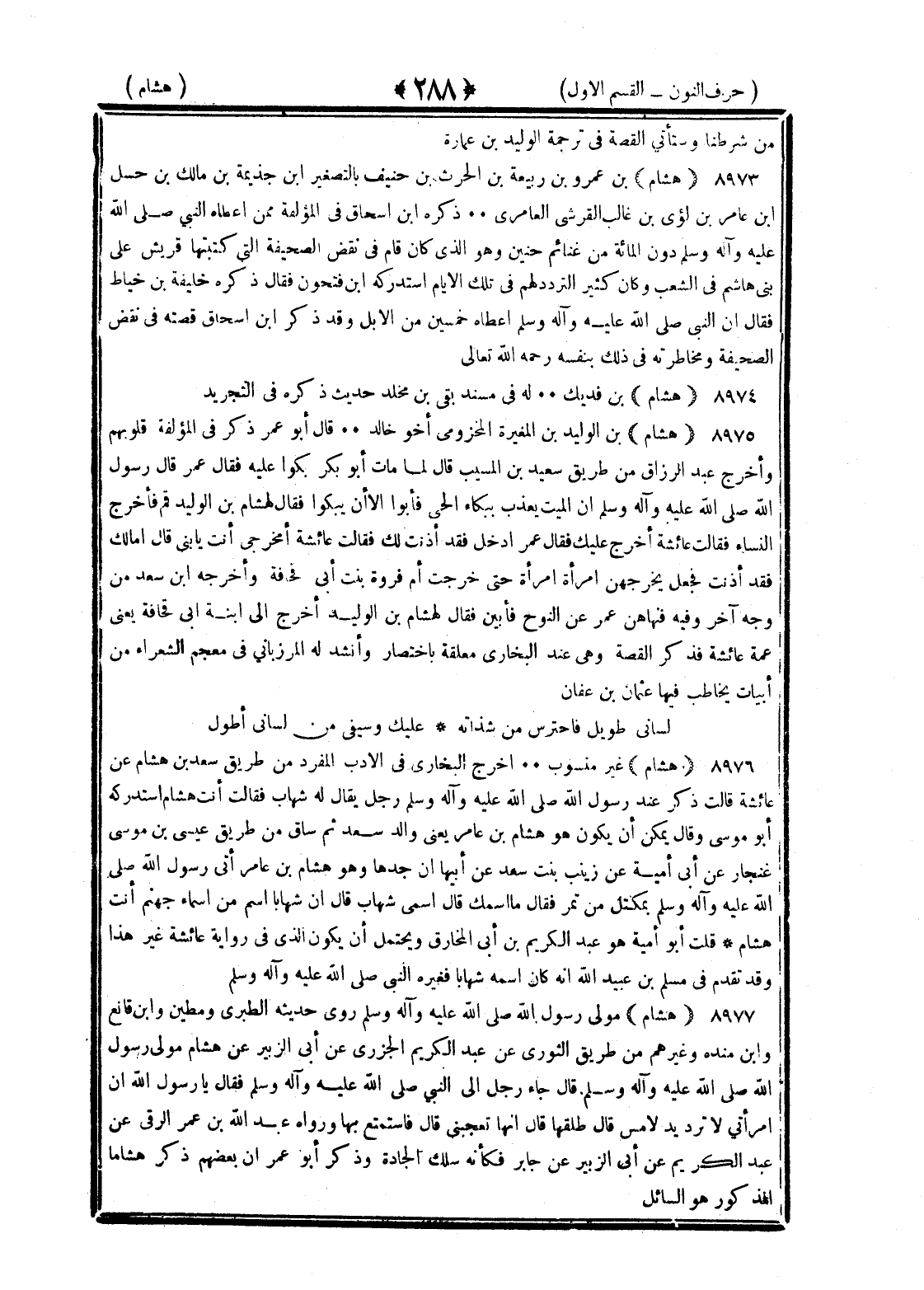 <288> من شرطنا وستأتي القصة في ترجمة الوليد بن عمارة هشام بن عمرو بن ربيعة بن الحارث بن حبيب بالتصغير بن جذيمة بن مالك بن حسل بن عامر بن لؤي بن غالب القرشي العامري ذكره بن إسحاق في المؤلفة ممن أعطاه النبي صلى الله عليه وسلم دون المائة من غنائم حنين وهو الذي كان قام في نقض الصحيفة التي كتبتها قريش على بني هاشم في الشعب وكان كثير التردد لهم في تلك الأيام استدركه بن فتحون فقال ذكره خليفة بن خياط فقال ان النبي صلى الله عليه وسلم أعطاه خمسين من الإبل وقد ذكر بن إسحاق قصته في نقض الصحيفة ومخاطرته في ذلك بنفسه رحمه الله هشام بن فديك له في مسند بقي بن مخلد ذكره في التجريد هشام بن الوليد بن المغيرة المخزومي أخو خالد قال أبو عمر ذكر في المؤتلفة قلوبهم وأخرج عبد الرزاق من طريق سعيد بن المسيب قال لما مات أبو بكر بكوا عليه فقال عمر قال رسول الله صلى الله عليه وسلم ان الميت يعذب ببكاء الحي فأبوا الا أن يبكوا فقال لهشام بن الوليد قم فأخرج النساء فقالت عائشة أخرج عليك فقال عمر ادخل فقد أذنت لك فقالت عائشة أمخرجي أنت يا بني قال أمالك فقد أذنت فجعل يخرجهن امرأة أمرأة حتى خرجت أم فروة بنت أبي قحافة وأخرجه بن سعد من وجه آخر وفيه فنهاهن عمر عن النوح فأبين فقال لهشام بن الوليد أخرج الى ابنة أبي قحافة يعني عمة عائشة فذكر القصة وهي عند البخاري معلقة باختصار وأنشد له المرزباني في معجم الشعراء من أبيات يخاطب فيها عثمان بن عفان لساني طويل فاحترس من شذاته عليك وسيفي من لساني أطول هشام غير منسوب أخرج البخاري في الأدب المفرد من طريق سعد بن هشام عن عائشة قالت ذكر عند رسول الله صلى الله عليه وسلم رجل يقال له شهاب فقال أنت هشام استدركه أبو موسى وقال يمكن أن يكون هو هشام بن عامر يعني والد سعد ثم ساق من طريق عيسى بن موسى غنجار عن أبي أمية عن زينب بنت سعد عن أبيها أن جدها وهو هشام بن عامر أتى رسول الله صلى الله عليه وسلم بمكتل من تمر فقال ما اسمك قال اسمي شهاب قال ان شهابا اسم من أسماء جهنم أنت هشام قلت أبو أمية هو عبد الكريم بن أبي المخارق ويحتمل أن يكون الذي في رواية عائشة غير هذا وقد تقدم في مسلم بن عبد الله أنه كان اسمه شهابا فغيره النبي صلى الله عليه وسلم هشام مولى رسول الله صلى الله عليه وسلم روى حديثه الطبراني ومطين وابن قانع وابن منده وغيرهم من طريق الثوري عن عبد الكريم الجزري عن أبي الزبير عن هشام مولى رسول الله صلى الله عليه وسلم قال جاء رجل الى النبي صلى الله عليه وسلم فقال يا رسول الله ان امرأتي لا ترد يد لامس قال طلقها قال انها تعجبني قال فاستمتع بها ورواه عبد الله بن عمر الرقي عن عبد الكريم عن أبي الزبير عن جابر فكأنه سلك الجادة وذكر أبو عمر أن بعضهم ذكر أن هشاما المذكور هو السائل §