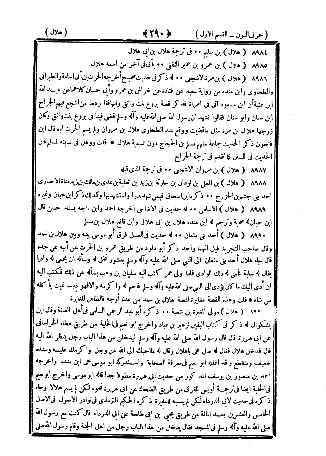 <290> هلال بن سليم في ترجمة هلال بن أبي هلال هلال بن عمرو بن عمير الثقفي يأتي في آخر من اسمه هلال هلال بن مرة الأشجعي له ذكر في حديث صحيح أخرجه الحارث بن أبي أسامة والطبراني والطحاوي وابن منده من رواية سعيد عن قتادة عن خداش بن عمرو وأبي حسان كلاهما عن عبد الله بن عتبة أن بن مسعود أتى في امرأة فذكر قصة بروع بنت واشق وفيها فقام رهط من أشجع فيهم الجراح بن سنان وأبو سنان فقالوا نشهد أن رسول الله صلى الله عليه وسلم قضى فينا في بروع بنت واشق وكان زوجها هلال بن مرة مثل ما قضيت ووقع عند الطحاوي هلال بن مروان ولم يسم الحارث أباه قال بن فتحون ذكر الحديث جماعة منهم مسلم بن الحجاج دون تسمية هلال قلت ووهل في نسبته لمسلم فان الحديث في السنن كما تقدم في ترجمة الجراح هلال بن مروان الأشجعي في ترجمة الذي قبله هلال بن المعلى بن لوذان بن حارثة بن زيد بن ثعلبة بن عدي بن مالك بن زيد مناة الأنصاري أحد بني جشم بن الخزرج ذكره بن إسحاق فيمن شهد بدرا واستشهد بها وكذلك ذكر بن حبان وغيره هلال الأسلمي له حديث في الأضاحي أخرجه أحمد وابن ماجة بسند حسن قال بن حبان له صحبة وترجم له بن منده هلال بن أبي هلال وابن قانع هلال بن مسلم هلال أحد بني متعان له حديث في العسل فرق أبو موسى بينه وبين هلال بن سعد وقال صاحب التجريد قيل انهما واحد ذكر أبو داود من طريق عمرو بن الحارث عن أبيه عن جده قال جاء هلال أحد بني متعان الى النبي صلى الله عليه وسلم بعشور نحل له وسأله أن يحمي له واديا يقال له سلبة فحمى له ذلك الوادي فلما ولي عمر كتب اليه سفيان بن وهب يسأله عن ذلك فكتب اليه ان أدي إليك ما كان يؤدى الى النبي صلى الله عليه وسلم فاحم له وأكرمه والا فهو ذباب غيث يأكله من شاء قلت وهذه القصة مغايرة القصة هلال بن سعد من عدة أوجه فالظاهر المغايرة هلال مولى المغيرة بن شعبة ذكره أبو عبد الرحمن السلمي في أهل الصفة وقال بن بشكوال له ذكر في كتاب اليقين لزهير بن عباد وأخرج أبو نعيم في الحلية من طريق عطاء الخراساني عن أبي هريرة قال قال رسول الله صلى الله عليه وسلم ليدخلن من هذا الباب رجل ينظر الله اليه قال فدخل هلال فقال له صل علي يا هلال وقال له ما أحبك الى الله عز وجل وأكرمك عليه وسنده ضعيف ومنقطع وقد أغفله أبو نعيم في معرفة الصحابة واستدركه أبو موسى على بن منده وأخرجه أحمد بن منصور بن يوسف المذكور من حديث أبي هريرة مطولا جدا قاله أبو موسى وأخرج أبو نعيم في الحلية أيضا في ترجمة أويس القرني من طريق الضحاك عن أبي هريرة نحوه لكن لم يسم هلالا وجاء ذكره في حديث لأبي الدرداء لكن لم ينسبه للمغيرة ذكره الحكيم الترمذي في نوادر الأصول في الأصل الخامس والعشرين بعد المائة من طريق يحيى بن أبي طلحة عن أبي الدرداء قال كنت مع رسول الله صلى الله عليه وسلم في المسجد فقال يدخل من هذا الباب رجل من أهل الجنة وقام رسول الله صلى §