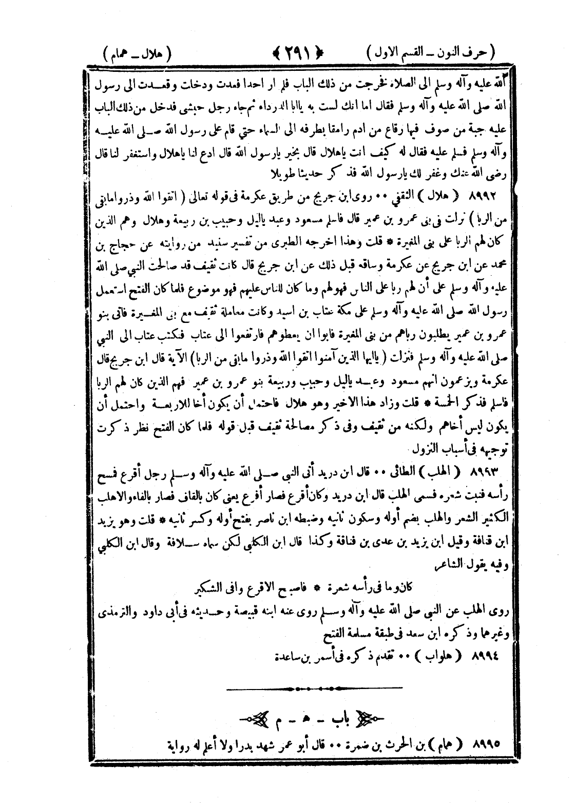 <291> الله عليه وسلم الى الصلاة فخرجت من ذلك الباب فلم أر أحدا فعدت ودخلت وقعدت الى رسول الله صلى الله عليه وسلم فقال أما انك لست به يا أبا الدرداء ثم جاء رجل حبشي فدخل من ذلك الباب عليه حبة من صوف فيها رقاع من أدم رامقا بطرفه الى السماء حتى قام على رسول الله صلى الله عليه وسلم فسلم عليه فقال له كيف أنت يا هلال قال بخير يا رسول الله قال ادع لنا يا هلال واستغفر لنا قال رضي الله عنك وغفر لك يا رسول الله فذكر حديثا طويلا هلال الثقفي روى بن جريج من طريق عكرمة في قوله تعالى اتقوا الله وذروا ما بقي من الربا نزلت في بني عمرو بن عمير قال فأسلم مسعود وعبد ياليل وحبيب بن ربيعة وهلال وهم الذين كان لهم الربا على بني المغيرة قلت وهذا أخرجه الطبري من تفسير سنيد من روايته عن حجاج بن محمد عن بن جريج عن عكرمة وساقه قبل ذلك عن بن جريج قال كانت ثقيف قد صالحت النبي صلى الله عليه وسلم على أن لهم ربا على الناس فهو لهم وما كان للناس عليهم فهو موضوع فلما كان الفتح استعمل رسول الله صلى الله عليه وسلم على مكة عتاب بن أسيد وكانت معاملة ثقيف مع بني المغيرة فأتى بنو عمرو بن عمير يطلبون رباهم من بني المغيرة فأبوا أن يعطوهم فارتفعوا الى عتاب فكتب عتاب الى النبي صلى الله عليه وسلم فنزلت يا أيها الذين آمنوا اتقوا الله وذروا ما بقي من الربا الآية قال بن جريج قال عكرمة ويزعمون أنهم مسعود وعبد ياليل وحبيب وربيعة بنو عمرو بن عمير فهم الذين كان لهم الربا فأسلم فذكر الخمسة قلت وزاد هذا الأخير وهو هلال فاحتمل أن يكون أخا للأربعة واحتمل أن يكون ليس أخاهم ولكنه من ثقيف وفي ذكر مصالحة ثقيف قبل قوله فلما كان الفتح نظر ذكرت توجيهه في أسباب النزول الهلب الطائي قال بن دريد أتى النبي صلى الله عليه وسلم رجل أفرع فمسح رأسه فنبت شعره فسمى الهلب قال بن دريد وكان أقرع فصار أفرع يعني كان بالقاف فصار بالفاء والأهلب الكثير الشعر والهلب بضم أوله وسكون ثانيه وضبطه بن ناصر بفتح أوله وكسر ثانيه قلت وهو يزيد بن قنافة وقيل بن يزيد بن عدي بن قنانة وكذا قال بن الكلبي لكن سماه سلامة وقال بن الكلبي وقيه يقول الشاعر كان وما في رأسه شعرة فأصبح الأقرع وافي الشكير روى الهلب عن النبي صلى الله عليه وسلم روى عنه ابنه قبيصة وحديثه في أبي داود والترمذي وغيرهما وذكره بن سعد في طبقة مسلمة الفتح هلواب تقدم ذكره في أسمر بن ساعدة الهاء بعدها الميم همام بن الحارث بن ضمرة قال أبو عمر شهد بدرا ولا أعلم له رواية §
