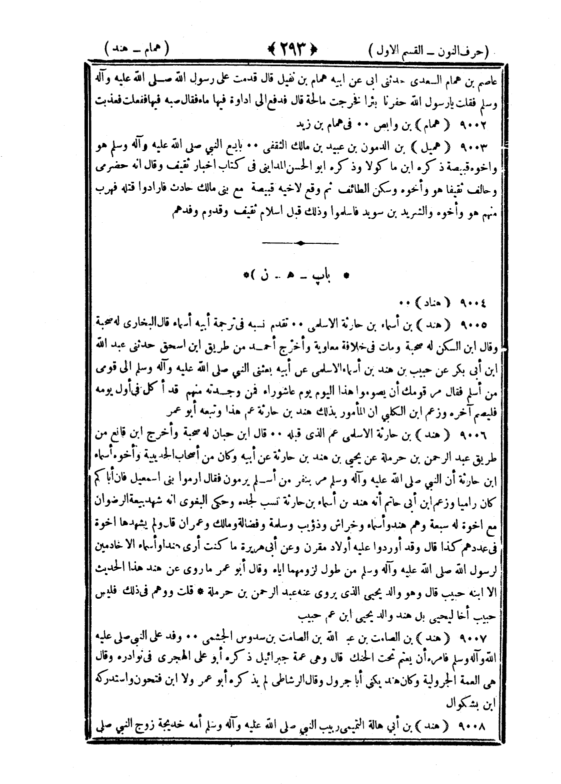 <293> عاصم بن همام السعدي حدثني أبي عن أبيه همام بن نفيل قال قدمت على رسول الله صلى الله عليه وسلم فقلت يا رسول الله حفرنا بئرا فخرجت مالحة قال فدفع الي إداوة فيها ماء فقال صبه فيها ففعلت فعذبت همام بن وابصة في همام بن زيد هميل بن الدمون بن عبيد بن مالك الثقفي بايع النبي صلى الله عليه وسلم هو وأخوه قبيصة ذكره بن ماكولا وذكره أبو الحسن المدائني في كتاب أخبار ثقيف وقال انه حضرمي حالف ثقيفا هو وأخوه وسكن الطائف ثم وقع لأخيه قبيصة مع بني مالك حادث فأرادوا قتله فهرب منهم هو وأخوه والشريد بن سويد فأسلموا وذلك قبل إسلام ثقيف وقدوم وفدهم الهاء بعدها النون هناد هند بن أسماء بن حارثة الأسلمي تقدم نسبه في ترجمة أبيه أسماء قال البخاري له صبة وقال بن السكن له صحبة ومات في خلافة معاوية وأخرج أحمد من طريق بن إسحاق حدثني عبد الله بن أبي بكر عن حبيب بن هند بن أسماء الأسلمي عن أبيه بعثني النبي صلى الله عليه وسلم الى قومي من أسلم فقال مر قومك أن يصوموا هذا اليوم يوم عاشوراء فمن وجدته منهم قد أكل في أول يومه فليصم آخره وزعم بن الكلبي أن المأمور بذلك هند بن حارثة عم هذا وتبعه أبو عمر هند بن حارثة الأسلمي عم الذي قبله قال بن حبان له صحبة وأخرج بن قانع من طريق عبد الرحمن بن حرملة عن يحيى بن هند بن حارثة عن أبيه وكان من أصحاب الحديبية وأخوه أسماء بن حارثة أن النبي صلى الله عليه وسلم مر بنفر من أسلم يرمون قال ارموا بني إسماعيل فان أباكم كان راميا وزعم بن أبي حاتم أن هند بن أسماء بن حارثة نسب لجده وحكى البغوي أنه شهد بيعة الرضوان مع اخوة له سبعة وهم هند وأسماء وخراش وذؤيب وسلمة وفضالة ومالك وحمران قال ولم يشهدها اخوة في عددهم كذا قال وقد أوردوا عليه أولاد مقرن وعن أبي هريرة ما كنت أرى هندا وأسماء الا خادمين لرسول الله صلى الله عليه وسلم من طول لزومهما إياه وقال أبو عمر ما روى عن هند هذا الحديث الا ابنه حبيب وقال هو والد يحيى الذي يروى عنه عبد الرحمن بن حرملة قلت ووهم في ذلك فليس حبيب أخا ليحيى بل هند والد يحيى بن عم حبيب هند بن الصامت بن عبد الله بن الصامت بن سدوس الجشمي وفد على النبي صلى الله عليه وسلم فأمره أن يعتم تحت الحنك قال وهي عمة جبرائيل ذكره أبو علي الهجري في نوادره وقال هي العمة الجرولية وكان هند ويكنى أبا جرول وقال الرشاطي لم يذكره أبو عمر ولا بن فتحون واستدركه بن بشكوال هند بن أبي هالة التميمي ربيب النبي صلى الله عليه وسلم أمه خديجة زوج النبي صلى §