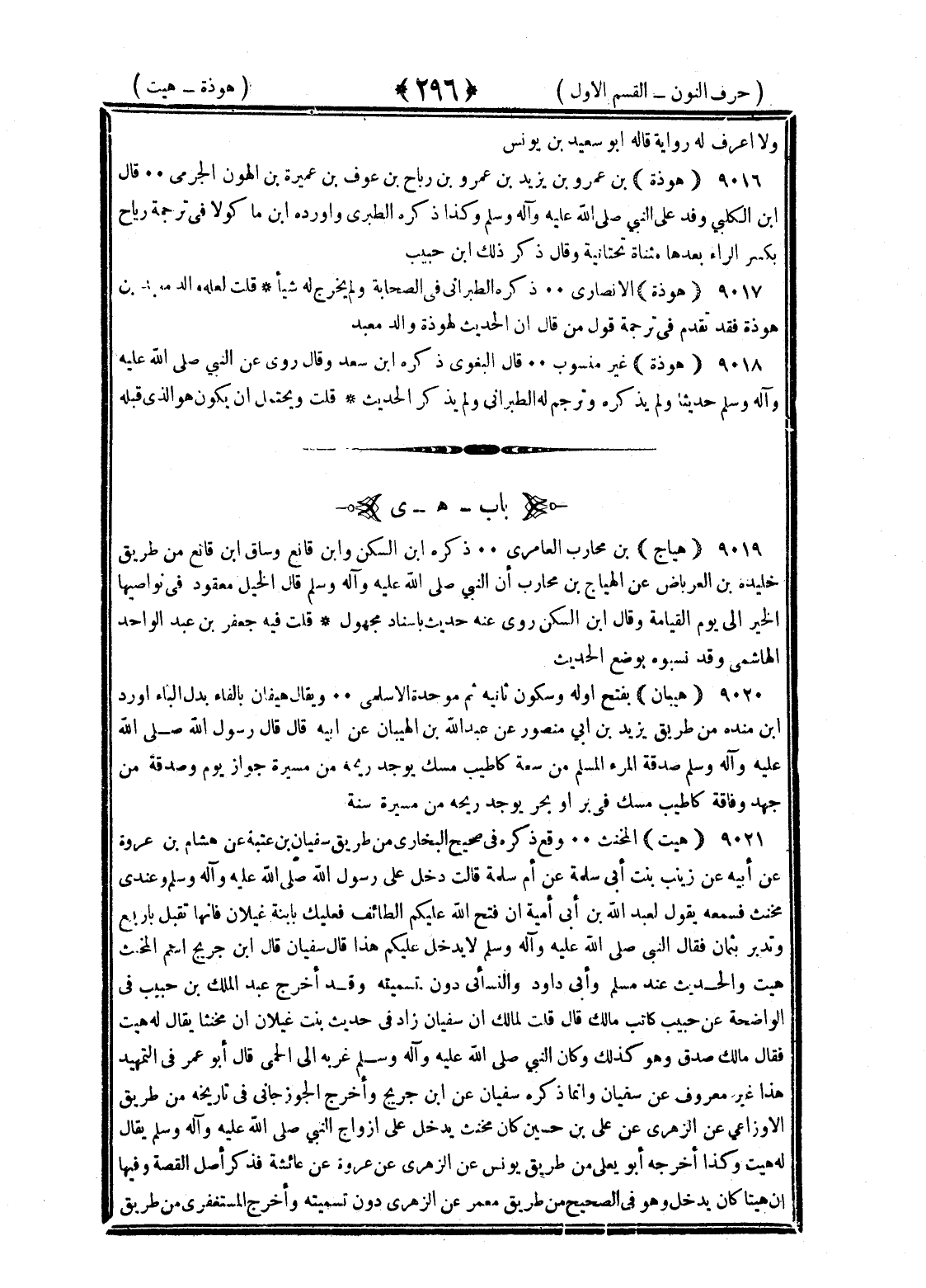 <296> ولا أعرف له رواية قاله سعيد بن يونس هوذة بن عمرو بن يزيد بن عمرو بن رياح بن عوف بن عمرو بن الهون الجرمي قال بن الكلبي وفد على النبي صلى الله عليه وسلم وكذا ذكره الطبري وأورده بن ماكولا في ترجمة رياح بكسر الراء بعدها مثناة تحتانية وقال ذكر ذلك بن حبيب هوذة الأنصاري ذكره الطبراني في الصحابة ولم يخرج له شيئا قلت لعله والد معبد بن هوذة فقد تقدم في ترجمته قول من قال ان الحديث لهوذة والد معبد هوذة غير منسوب قال البغوي ذكره بن سعد وقال روى عن النبي صلى الله عليه وسلم حديثا ولم يذكره وترجم له الطبراني ولم يذكر الحديث قلت ويحتمل أن يكون هو الذي قبله الهاء بعدها الياء هياج بن محارب العامري ذكره بن السكن وابن قانع وساق بن قانع من طريق خلدة بنت العرباض عن الهياج بن الهياج بن محارب أن النبي صلى الله عليه وسلم قال الخيل معقود في نواصيها الخير الى يوم القيامة وقال بن السكن روى عنه حديث بإسناد مجهول قلت فيه جعفر بن عبد الواحد الهاشمي وقد نسبوه لوضع الحديث هيبان بفتح أوله وسكون ثانيه ثم موحدة الأسلمي ويقال هيفان بالفاء بدل الباء أورد بن منده من طريق يزيد بن أبي منصور عن عبد الله بن الهيبان عن أبيه قال قال رسول الله صلى الله عليه وسلم صدقة المرء المسلم من سعة كأطيب مسك يوجد ريحه من مسيرة جواز يوم وصدقة من جهد وفاقة كأطيب مسك في بر أو بحر يوجد ريحه من مسيرة سنة هيت المخنث وقع ذكره في صحيح البخاري من طريق سفيان بن عتبة عن هشام بن عروة عن أبيه عن زينب بنت أبي سلمة عن أم سلمة قالت دخل علي رسول الله صلى الله عليه وسلم وعندي مخنث فسمعته يقول لعبد الله بن أبي أمية أن فتح الله عليكم الطائف فعليك بابنة غيلان فانها تقبل بأربع وتدبر بثمان فقال النبي صلى الله عليه وسلم لا يدخل عليكم هذا قال سفيان قال بن جريج اسم المخنث هيت والحديث عند مسلم وأبي داود والنسائي دون تسميته وقد أخرج عبد الملك بن حبيب في الواضحة عن حبيب كاتب مالك قال قلت لمالك ان سفيان زاد في حديث بنت غيلان أن مخنثا يقال له هيت فقال مالك صدق وهو كذلك وكان النبي صلى الله عليه وسلم غربه الى الحمى قال أبو عمر في التمهيد هذا غير معروف عن سفيان وانما ذكره سفيان عن بن جريج وأخرج الجوزجاني في تاريخه من طريق الأوزاعي عن الزهري عن علي بن حسين كان مخنث يدخل على أزواج النبي صلى الله عليه وسلم يقال له هيت وكذا أخرجه أبو يعلى من طريق يونس عن الزهري عن عروة عن عائشة فذكر أصل القصة وفيها ان هيتا كان يدخل وهو في الصحيح من طريق معمر عن الزهري دون تسميته وأخرج المستغفري من طريق §