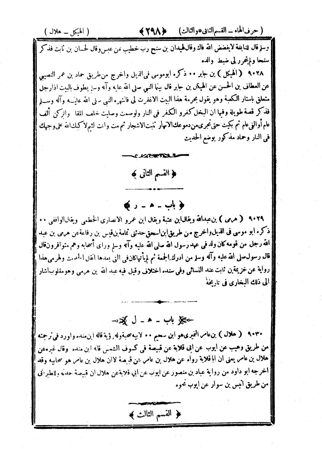 <298> وسلم قال للنابغة لا يفضض الله فاك وقال لهيدان بن سيج رب خطيب من عبس وقال لحسان بن ثابت فذكر كرسيجا ولم يتحرر لي ضبط والده الهيكل بن جابر ذكره أبو موسى في الذيل وأخرج من طريق حماد بن عمرو النصيبي عن العطاف بن الحسن عن الهيكل بن جابر قال بينما النبي صلى الله عليه وسلم يطوف بالبيت إذا رجل متعلق بأستار الكعبة وهو يقول بحرمة هذا البيت الا غفرت لي فانتهره النبي صلى الله عليه وسلم فذكر قصة طويلة وفيها ان البخل كفر والكفر في النار ولو صمت وصليت خلف المقام والركن ألف عام ثم بكيت حتى تجري من دموعك الأنهار وتنبت الأشجار ثم مت وأنت لئيم الا كبك الله على وجهك في النار وحماد مذكور بوضع الحديث القسم الثاني بعدها الراء هرمى بن عبد الله ويقال بن عتبة ويقال بن عمرو الأنصاري الخطمي ويقال الواقفي ذكره أبو موسى في الذيل وأخرج من طريق بن إسحاق حدثني ثمامة بن قيس بن رفاعة عن هرمى بن عبد الله رجل من قومه كان ولد في عهد رسول الله صلى الله عليه وسلم ورأى أصحابه وهم متوافرون قال قال رسول الله صلى الله عليه وسلم من أدرك الجمعة ثم لم يأتها كان في التي بعدها أثقل الحديث ولهرمى هذا رواية عن خزيمة بن ثابت عند النسائي وفي سنده اختلاف وقيل فيه عبد الله بن هرمى وهو مقلوب أشار الى ذلك البخاري في تاريخه الهاء بعدها اللام هلال بن عامر النميري هو بن سحيم لأبيه صحبة وله رؤية قاله بن منده وأورد في ترجمته من طريق وهيب عن أيوب عن أبي قلابة عن قبيصة في كسوف الشمس قاله بن منده وقال غيره عن هلال بن عامر يعني أن أبا قلابة رواه عن هلال بن عامر عن قبيصة لا أن هلال بن عامر هو صحابته وقد أخرجه أبو داود من رواية عباد بن منصور عن أيوب عن أبي قلابة عن هلال أن قبيصة حدثه والطبراني من طريق أنيس بن سوار عن أيوب نحوه §