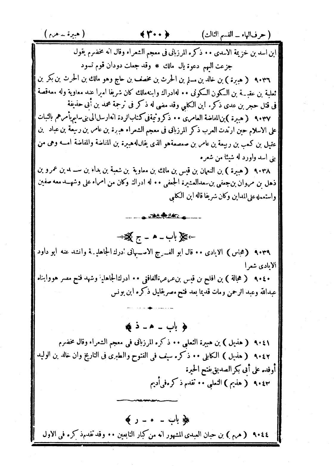<300> بن أسد بن خزيمة الأسدي ذكره المرزباني في معجم الشعراء وقال انه مخضرم يقول فزعت إليهم دعوة يال مالك وقد جعلت دودان قوم تسود هبيرة بن خالد بن مسلم بن الحارث بن مخصف بن حاج وهو مالك بن الحارث بن بكر بن ثعلبة بن عقبة بن السكون السكوني له إدراك وابنه مالك كان شريفا أميرا عند معاوية وله معه قصة في قتل حجر بن عدي ذكره بن الكلبي وقد مضى له ذكر في ترجمة محمد بن أبي حذيفة هبيرة بن مفاضة العامري ذكر وثيمة في كتاب الردة أنه أرسل الى بني سليم يأمرهم بالثبات على الإسلام حين ارتدت العرب ذكر المرزباني في معجم الشعراء هبيرة بن عامر بن ربيعة بن عبادة بن عقيل بن كعب بن ربيعة بن عامر بن صعصعة هو الذي يقال له هبيرة بن المفاضة والمفاضة أمه وهي من بني أسد وأورد له شيئا من شعره هبيرة بن النعمان بن قيس بن مالك بن معاوية بن سعنة بن بداء بن سعد بن عمرو بن ذهل بن مران بن جعفى بن سعد العشيرة الجعفي له إدراك وكان من أمراء علي وشهد معه صفين واستعمله على المدائن وكان شريفا قاله بن الكلبي الهاء بعدها الجيم هجاس الايادي قال أبو الفرج الأصبهاني أدرك الجاهلية وأنشد عنه داود الايادي شعرا هجالة بن أفلح بن قيس بن عرعرة الغافقي أدرك الجاهلية وشهد فتح مصر هو وابناه عبد الله وعبد الرحمن ومات قديما بعد فتح مصر بقليل ذكره بن يونس الهاء بعدها الدال هديل بن هبيرة الثعلبي ذكره المرزباني في معجم الشعراء وقال مخضرم هديل الكاهلي ذكره سيف في الفتوح والطبري في التاريخ وأن خالد بن الوليد أوفده على أبي بكر الصديق بفتح الحيرة هديم الثعلبي تقدم ذكره في أديم الهاء بعدها الراء هرم بن حيان العبدي المشهور أنه من كبار التابعين وقد تقدم ذكره في الأول §