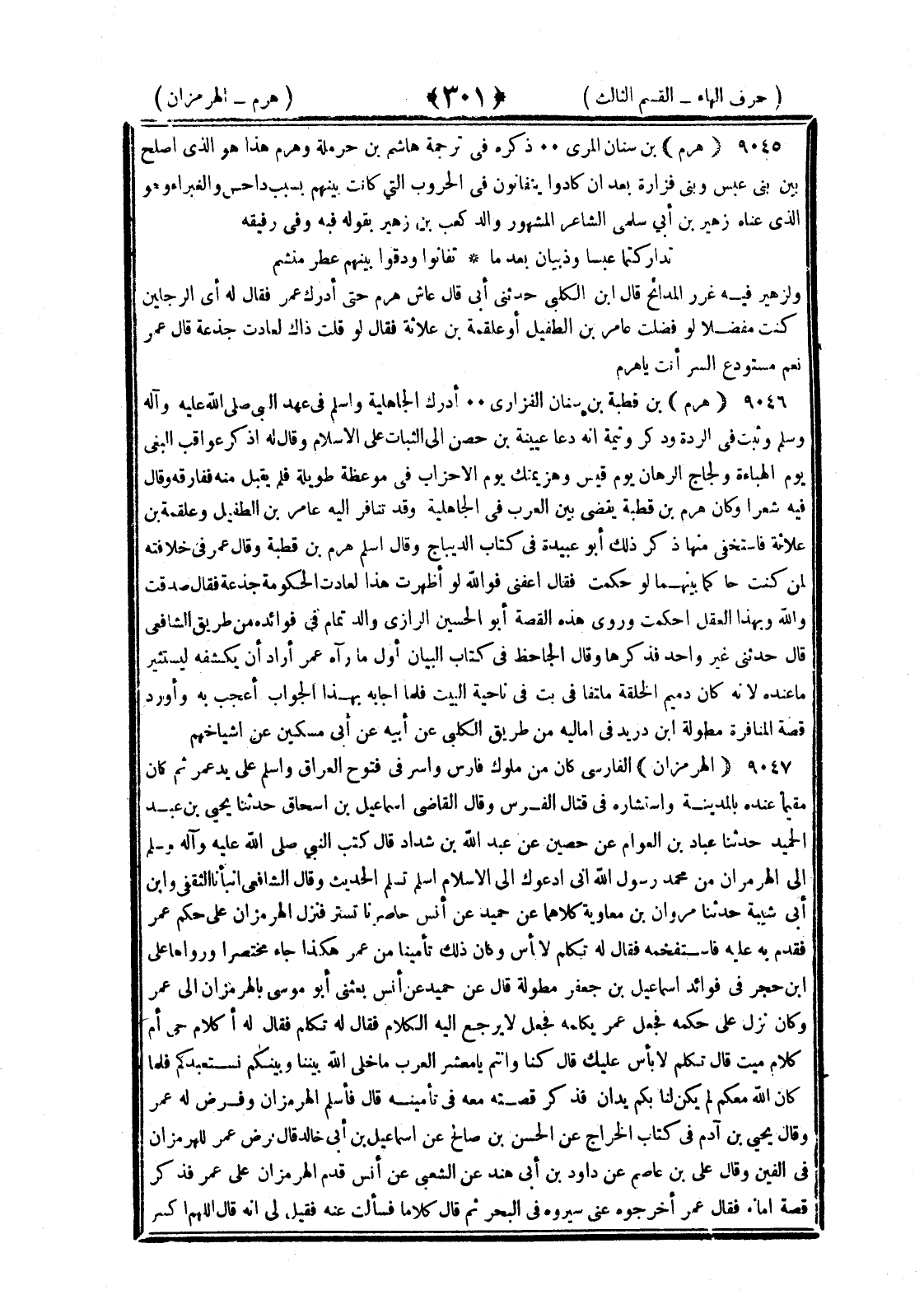 <301> هرم بن سنان المزي ذكر في ترجمة هاشم بن حرملة وهرم هذا هو الذي أصلح بين بني عبس وبني فزارة بعد أن كادوا يتفانون في الحرب التي كانت بينهم بسبب داحس والغبراء وهو الذي عناه زهير بن أبي سلمى الشاعر المشهور والد كعب بن زهير بقوله فيه وفي رفيقه تداركتما عبسا وذبيان بعدما تفانوا ودقوا بينهم عطر منشم ولزهير فيه غرر المدائح قال بن الكلبي حدثني أبي قال عاش هرم حتى أدرك عمر فقال له أي الرجلين كنت مفضلا عامر بن الطفيل أو علقمة بن علاثة فقال لو قلت ذاك لعادت جذعة قال عمر نعم مستودع السر أنت يا هرم هرم بن قطبة بن سنان الفزاري أدرك الجاهلية وأسلم في عهد النبي صلى الله عليه وسلم وثبت في الردة وذكر وثيمة أنه دعا عيينة بن حصن الى الثبات على الإسلام وقال له اذكر عواقب البغي يوم الهباءة ولجاج الرهان يوم قيس وهزيمتك يوم الأحزاب في موعظة طويلة فلم يقبل منه ففارقه وقال فيه شعرا وكان هرم بن قطبة يقضي بين العرب في الجاهلية وقد تنافر اليه عامر بن الطفيل وعلقمة بن علاثة فاستخفى منهما ذكر ذلك أبو عبيدة في كتاب الديباج وقال أسلم هرم بن قطبة وقال عمر في خلافته لمن كنت حاكما بينهما لو حكمت فقال أعفني فوالله لو أظهرت هذا لعادت الحكومة جذعة فقال صدقت والله وبهذا العقل أحكمت وروى هذه القصة أبو الحسين الرازي والد تمام في فوائده من طريق الشافعي قال حدثني غير واحد فذكرها وقال الجاحظ في كتاب البيان أول ما رآه عمر أراد أن يكشفه يستثير ما عنده لأنه كان دميم الخلقة ملتفا في بت في ناحية البيت فلما أجابه بهذا الحديث أعجب به وأورد قصة المنافرة مطولة بن دريد في أماليه من طريق بن الكلبي عن أبيه عن أبي مسكين عن أشياخهم الهرمزان الفارسي كان من ملوك فارس وأسر في فتوح العراق وأسلم على يد عمر ثم كان مقيما عنده بالمدينة واستشاره في قتال الفرس وقال القاضي إسماعيل بن إسحاق حدنثا يحيى بن عبد الحميد حدثنا عباد بن العوام عن حصين عن عبد الله بن شداد قال كتب النبي صلى الله عليه وسلم الى الهرمزان من محمد رسول الله اني أدعوك الى الإسلام أسلم تسلم الحديث وقال الشافعي أنبأنا الثقفي وابن أبي شيبة حدثنا مروان بن معاوية كلاهما عن حميد عن أنس حاصرنا تستر فنزل الهرمزان على حكم عمر فقدم به عليه فاستفخمه فقال له تكلم لا بأس وكان ذلك تأمينا من عمر هكذا جاء مختصرا ورواها على بن حجر في فوائد إسماعيل بن جعفر مطولة قال عن حميد عن أنس بعثني أبو موسى بالهرمزان الى عمر وكان نزل على حكمه فجعل عمر يكلمه فجعل لا يرجع اليه الكلام فقال له تكلم فقال له أكلام حي أم كلام ميت قال تكلم لا بأس عليك قال كنا وأنتم يا معشر العرب ما خلى الله بيننا وبينكم نستعبدكم فلما كان الله معكم لم يكن لنا بكم يدان فذكر قصته معه في تأمينه قال فأسلم الهرمزان وفرض له عمر وقال يحيى بن آدم في كتاب الخراج عن الحسن بن صالح عن إسماعيل بن أبي خالد قال فرض عمر للهرمزان في ألفين وقال علي بن عاصم عن داود بن أبي هند عن الشعبي عن أنس قدم الهرمزان على عمر فذكر قصة أماناه فقال عمر أخرجوه عني سيروه في البحر ثم قال كلاما فسألت عنه فقيل لي انه قال اللهم اكسر §