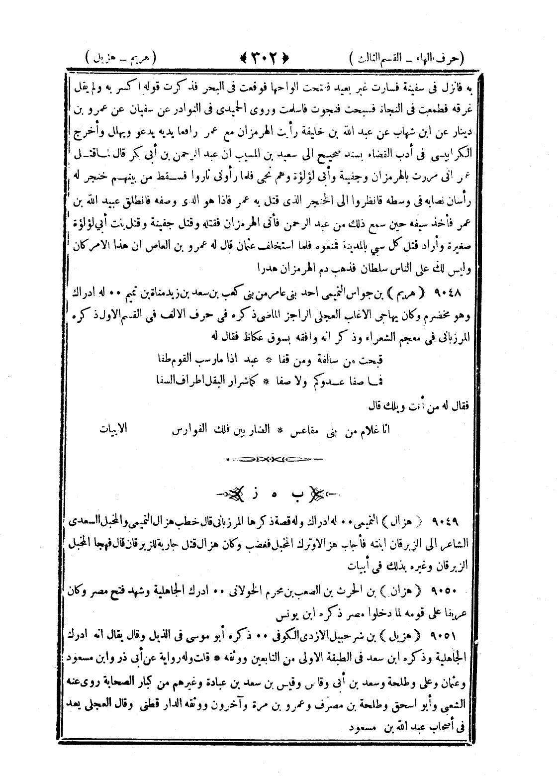 <302> به فأنزل في سفينة فسارت غير بعيد ففتحت ألواحها فوقعت في البحر فذكرت قوله اكسر به ولم يقل غرقه فطمعت في النجاة فسبحت فنجوت فأسلمت وروى الحميدي في النوادر عن سفيان عن عمرو بن دينار عن بن شهاب عن عبد الله بن خليفة رأيت الهرمزان مع عمر رافعا يديه يدعو ويهلل وأخرج الكرابيسي في أدب القضاء بسند صحيح الى سعيد بن المسيب أن عبد الرحمن بن أبي بكر قال لما قتل عمر اني مررت بالهرمزان وجفينة وأبي لؤلؤة وهم نجى فلما رأوني ثاروا فسقط من بينهم خنجر له رأسان نصابه في وسطه فانظروا الى الخنجر الذي قتل به عمر فإذا هو الذي وصفه فانطلق عبيد الله بن عمر فأخذ سيفه حين سمع ذلك من عبد الرحمن فأتى الهرمزاني فقتله وقتل جفينة وقتل بنت أبي لؤلؤة صغيرة وأراد قتل كل سبي بالمدينة فمنعوه فلما استخلف عثمان قال له عمرو بن العاص ان هذا الأمر كان وليس لك على الناس سلطان فذهب دم الهرمزان هدرا هريم بن جواس التميمي أحد بني عامر من بني كعب بن سعد بن زيد مناة بن تميم له إدراك وهو مخضرم وكان يهاجي الأغلب العجلي الراجز الماضي ذكره في حرف الألف في القسم الأول ذكره المرزباني في معجم الشعراء وذكر أنه وافقه بسوق عكاظ فقال له قبحت من سالفة ومن قفا عبد إذا ما رسب القوم طفا فما صفا عدوكم ولا صفا كما شرار البقل أطراف السفا فقال له من أنت ويلك قال أنا غلام من بني مقاعس الضاربين فلك الفوارس الأبيات هزال التميمي له إدراك وله قصة ذكرها المرزباني قال خطب هزال التميمي والمخبل السعدي الشاعر الى الزبرقان ابنته فأجاب هزالا وترك المخبل فغضب وكان هزال قتل جارية للزبرقان قال فهجا المخبل الزبرقان وعيره بذلك في أبيات هزال بن الحارث بن الصعب بن مخرم الخولاني أدرك الجاهلية وشهد فتح مصر وكان عريفا على قومه لما دخلوا مصر ذكره بن يونس هزيل بن شرحبيل الأزدي الكوفي ذكره أبو موسى في الذيل وقال يقال انه أدرك الجاهلية وذكره بن سعد في الطبقة الأولى من التابعين ووثقه قلت وله رواية عن أبي ذر وابن مسعود وعثمان وعلي وطلحة وسعد بن أبي وقاص وقيس بن عسد بن عبادة وغيرهم من كبار الصحابة روى عنه الشعبي وأبو إسحاق وطلحة بن مصرف وعمرو بن مرة وآخرون ووثقه الدارقطني وقال العجلي يعد من أصحاب عبد الله بن مسعود §