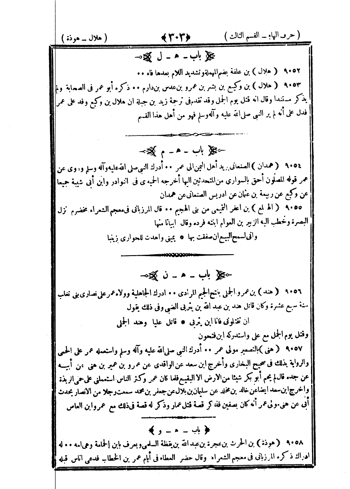 <303> الهاء بعدها اللام هلال بن علفة بضم المهملة وتشديد اللام بعدها فاء هلال بن وكيع بن بشر بن عمرو بن عدس بن دارم ذكره أبو عمر في الصحابة ولم يذكر مستندا وقال انه قتل يوم الجمل وقد تقدم في ترجمة زيد بن جبلة أن هلال بن وكيع وفد على عمر فدل على أنه لم ير النبي صلى الله عليه وسلم فهو من أهل هذا القسم الهاء بعدها الميم همدان الصنعاني بريد أهل اليمن الى عمر أدرك النبي صلى الله عليه وسلم وروى عن عمر قوله المصلون أحق بالسواري من المتحدثين إليها أخرجه الحميدي في النوادر وابن أبي شيبة جميعا عن وكيع عن ربيعة بن عثمان عن إدريس الصنعاني عن همدان الهملع بن أعفر التميمي من بني الهجيم قال المرزباني في معجم الشعراء مخضرم نزل البصرة وخطب اليه الزبير بن العوام ابنته فرده وقال أبياتا منها واني لسمح البيع ان صفقت بها يميني وأهدت للحواري زينبا الهاء بعدها النون هند بن عمرو الجملي بفتح الجيم المرادي أدرك الجاهلية وولاه عمر على نصارى بني تغلب سنة سبع عشرة وكان قاتل هند بن عبد الله بن يثربي الضبي وفي ذلك يقول ان تقتلوني فأنا بن يثربي قاتل عليا وهند الجملي وقتل يوم الجمل مع علي واستدركه بن فتحون هنى بالتصغير مولى عمر أدرك النبي صلى الله عليه وسلم واستعمله عمر على الحمى والرواية بذلك في صحيح البخاري وأخرج بن سعد عن الواقدي عن عمرو بن عمير بن هنى عن أبيه عن جده قال لم يحم أبو بكر شيئا من الأرض الا البقيع فلما كان عمر وكثر الناس استعملني على حمى الريذة وأخرج بن سعد أيضا عن خالد بن مخلد عن سليمان بن بلال عن جعفر بن محمد سمعت رجلا من الأنصار يحدث أبي عن هنى مولى عمر أنه كان بصفين فذكر قصة قتل عمار وذكر له قصة في ذلك مع عمرو بن العاص الهاء بعدها الواو هوذة بن الحارث بن عجرة بن عبد الله بن يقظة السلمي ويعرف بابن الحمامة وهي أمه له إدراك ذكره المرزباني في معجم الشعراء وقال حضر العطاء في أيام عمر بن الخطاب فدعا أناسا قبله §