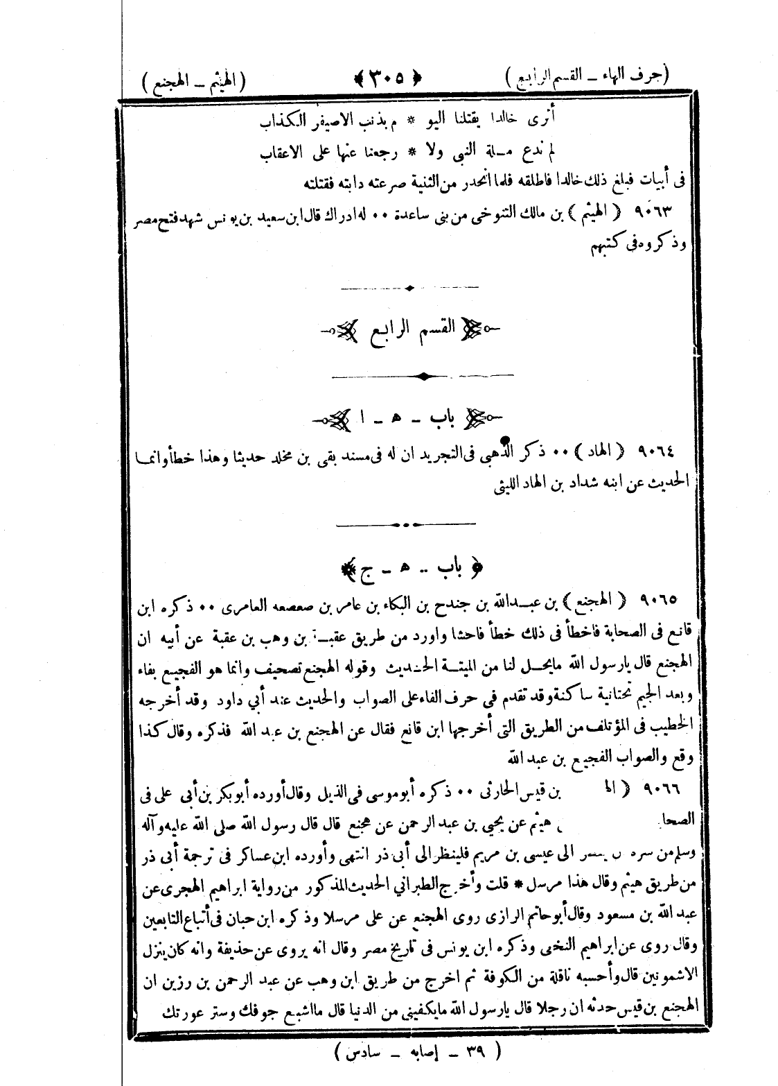 <305> أترى خالدا يقتلنا اليوم بذنب الأصيغر الكذاب لم ندع ملة النبي ولا نحن رجعنا منها على الأعقاب في أبيات فبلغ ذلك خالدا فأطلقه فلما انحدر من الثنية صرعته دابة فقتلته الهيثم بن مالك التنوخي من بني ساعدة له إدراك قال أبو سعيد بن يونس شهد فتح مصر وذكروه في كتبهم القسم الرابع بعدها الألف الهاد ذكر الذهبي في التجريد أن له في مسند بقي بن مخلد حديثا وهذا خطأ وانما الحديث عن ابنه شداد بن الهاد الليثي الهاء بعدها الجيم الهجنع بن عبد الله بن جندع بن البكاء بن عامر بن صعصعة العامري ذكره بن قانع في الصحابة فأخطأ في ذلك خطأ فاحشا وأورد من طريق عقبة بن وهب بن عقبة عن أبيه أن الهجنع قال يا رسول الله ما يحل لنا من الميتة الحديث وقوله الهجنع تصحيف وانما هو الفجيع بفاء وبعد الجيم تحتانية ساكنة وقد تقدم في حرف الفاء على الصواب والحديث عند أبي داود وقد أخرجه الخطيب في المؤتلف من الطريق التي أخرجها بن قانع فقال عن الهجنع بن عبد الله فذكره وقال كذا وقع والصواب الفجيع بن عبد الله الهجنع بن قيس الحارثي ذكره أبو موسى في الذيل وقال أورده أبو بكر بن أبي علي في الصحابة وساق من طريق هشيم عن يحيى بن عبد الرحمن عن هجنع قال قال رسول الله صلى الله عليه وسلم من سره أن ينظر الى عيسى بن مريم فلينظر الى أبي ذر انتهى وأورده بن عساكر في ترجمة أبي ذر من طريق هشيم وقال هذا مرسل قلت وأخرج الطبراني الحديث المذكور من رواية إبراهيم الهجري عن عبد الله بن مسعود وقال أبو حاتم الرازي روى الهجنع عن علي مرسلا وذكره بن حبان في أتباع التابعين وقال روى عن إبراهيم النخعي وذكره بن يونس في تاريخ مصر وقال انه يروى عن حذيفة وانه كان ينزل الأشمونين قال وأحسبه ناقلة من الكوفة ثم أخرج من طريق بن وهب عن عبد الرحمن بن رزين أن الهجنع بن قيس حدثه أن رجلا قال يا رسول الله ما يكفيني من الدنيا قال ما أشبع جوفك وستر عورتك §