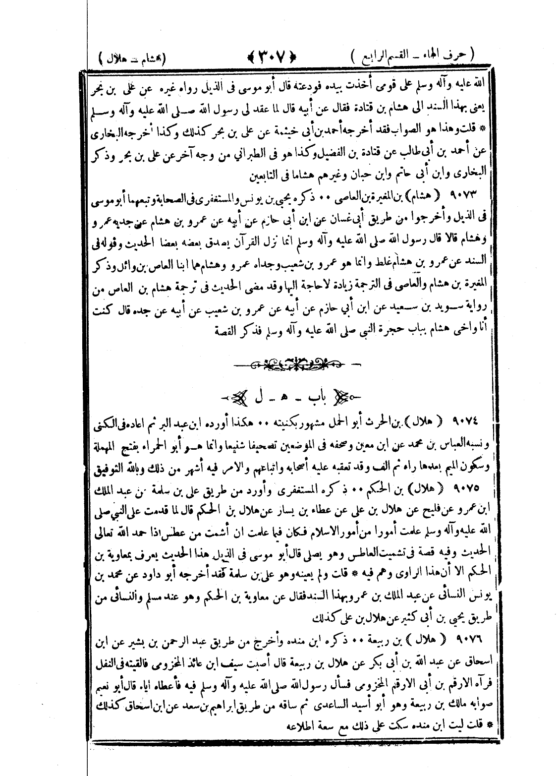 <307> الله عليه وسلم على قومي أخذت بيده فودعته قال أبو موسى في الذيل رواه غيره عن علي بن بحر يعني بهذا السند الى هشام بن قتادة فقال عن أبيه قال لما عقد لي رسول الله صلى الله عليه وسلم قلت وهذا هو الصواب فقد أخرجه أحمد بن أبي خيثمة عن علي بن بحر كذلك وكذا أخرجه البخاري عن أحمد بن أبي طالب عن قتادة بن الفضل وكذا هو في الطبراني من وجه آخر عن علي بن بحر وذكر البخاري وابن أبي حاتم وابن حبان وغيرهم هشام بن قتادة في التابعين هشام بن المغيرة بن العاص ذكره يحيى بن يونس والمستغفري في الصحابة وتبعهما أبو موسى في الذيل وأخرجوا من طريق أبي غسان عن بن أبي حازم عن أبيه عن عمرو بن هشام عن جديه عمرو وهشام قالا قال رسول الله صلى الله عليه وسلم إنما نزل القرآن يصدق بعضه بعضا الحديث وقوله في السند عن عمرو بن هشام غلط وانما هو عمرو بن شعيب وجداه عمرو وهشام هما ابنا العاص بن وائل وذكر المغيرة بن هشام والعاصي في الترجمة زيادة لا حاجة إليها وقد مضى الحديث في ترجمة هشام بن العاص من رواية سويد بن سعيد عن بن أبي حازم عن أبيه عن عمرو بن شعيب عن أبيه عن جده قال كنت أنا وأخي هشام بباب حجرة النبي صلى الله عليه وسلم فذكر القصة الهاء بعدها اللام هلال بن الحارث أبو الحمل مشهور بكنيته هكذا أورده بن عبد البر ثم أعاده في الكنى ونسبه العباس بن محمد عن بن معين وصحفه في الموضعين تصحيفا شنيعا وانما هو أبو الحمراء بفتح المهملة وسكون الميم بعدها راء ثم ألف وقد تعقبه عليه أصحابه وأتباعهم والأمر فيه أشهر من ذلك وبالله التوفيق هلال بن الحكم ذكره المستغفري وأورد من طريق علي بن سلمة عن عبد الملك بن عمرو عن فليح عن هلال بن علي عن عطاء بن يسار عن هلال بن الحكم قال لما قدمت على النبي صلى الله عليه وسلم علمت أمورا من أمور الإسلام فكان فما علمت أن أشمت من عطس إذا حمد الله تعالى الحديث وفيه قصة في تشميت العاطس وهو يصلي قال أبو موسى في الذيل هذا الحديث يعرف بمعاوية بن الحكم الا أن هذا الراوي وهم فيه قلت ولم يعينه وهو علي بن سلمة فقد أخرجه أبو داود عن محمد بن يونس النسائي عن عبد الملك بن عمرو بهذا السند فقال عن معاوية بن الحكم وهو عند مسلم والنسائي من طريق يحيى بن أبي كثير عن هلال بن علي كذلك هلال بن ربيعة ذكره بن منده وأخرج من طريق عبد الرحمن بن بشير عن بن إسحاق عن عبد الله بن أبي بكر عن هلال بن ربيعة قال أصبت سيف بن عائذ المخزومي فألقيته في النفل فرآه الأرقم بن أبي الأرقم المخزومي فسأل رسول الله صلى الله عليه وسلم فيه فأعطاه إياه قال أبو نعيم صوابه مالك بن ربيعة وهو أبو أسيد الساعدي ثم ساقه من طريق إبراهيم بن سعد عن إسحاق كذلك قلت ليت بن منده سكت على ذلك مع سعة اطلاعه §