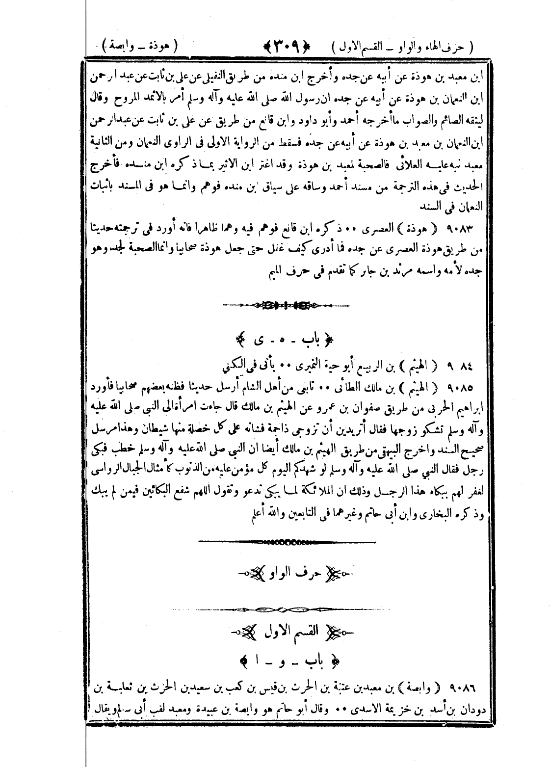 <309> بن معبد بن هوذة عن أبيه عن جده وأخرج بن منده من طريق النفيلي عن علي بن ثابت عن عبد الرحمن بن النعمان بن هوذة عن أبيه عن جده أن رسول الله صلى الله عليه وسلم أمر بالأثمد المروح وقال ليتقه الصائم والصواب ما أخرجه أحمد وأبو داود وابن قانع من طرق عن علي بن ثابت عن عبد الرحمن بن النعمان بن معبد بن هوذة عن أبيه عن جده فسقط من الرواية الأولى في نسب الراوي النعمان ومن الثانية معبد نبه عليه العلائي فالصحبة لمعبد بن هوذة وقد اغتر بن الأثير بما ذكره بن منده فأخرج الحديث في هده الترجمة من مسند أحمد وساقه على سياق بن منده فوهم وانما هو في المسند بإثبات النعمان في السند هوذة العصري ذكره بن قانع فوهم فيه وهما ظاهرا فإنه أورد في ترجمته حديثا من طريق هوذة العصري عن جده فما أدري كيف غفل حتى جعل هوذة صحابيا وانما الصحبة لجده وهو جده لأمه واسمه مرثد بن جابر كما تقدم في حرف الميم الهاء بعدها الياء الهيثم بن الربيع أبو حية النميري يأتي في الكنى الهيثم بن مالك الطائي تابعي من أهل الشام أرسل حديثا فظنه بعضهم صحابيا فأورد إبراهيم الحربي من طريق صفوان بن عمرو عن الهيثم بن مالك قال جاءت امرأة الى النبي صلى الله عليه وسلم تشكو زوجها فقال أتريدين أن تزوجي ذا جمة فينشأ على كل خصلة منها شيطان وهذا مرسل صحيح السند وأخرج البيهقي من طريق الهيثم بن مالك أيضا أن النبي صلى الله عليه وسلم خطب فبكى رجل فقال النبي صلى الله عليه وسلم لو شهدكم اليوم كل مؤمن عليه من الذنوب كأمثال الجبال الرواسي لغفر لهم ببكاء هذا الرجل وذلك ان الملائكة لما يبكي تدعو وتقول اللهم شفع البكائين فيمن لم يبك وذكره البخاري وابن أبي حاتم وغيرهما في التابعين والله أعلم