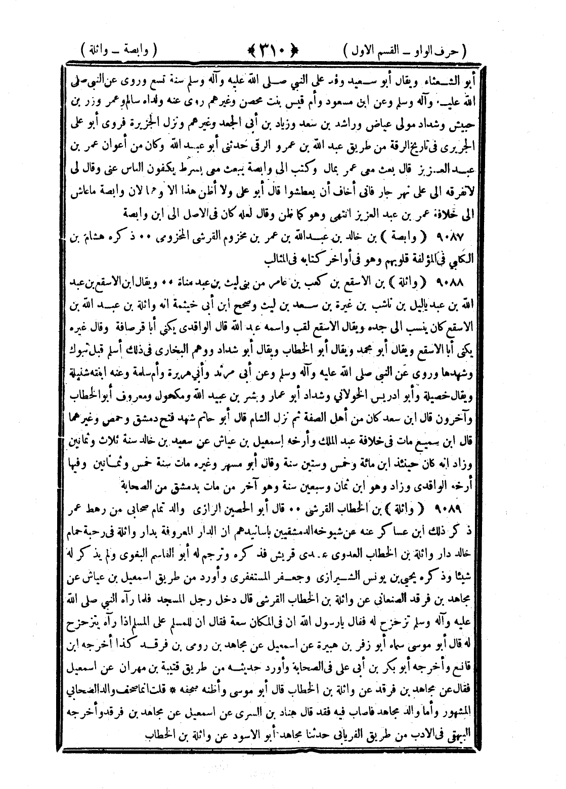 <310> أبو الشعثاء يقال أبو سعيد وفد على النبي صلى الله عليه وسلم سنة تسع وروى عن النبي صلى الله عليه وسلم وعن بن مسعود وأم قيس بنت محصن وغيرهم روى عنه ولداه سالم وعمر وزر بن حبيش وشداد مولى عياض وراشد بن سعد وزياد بن أبي الجعد وغيرهم ونزل الجزيرة فروى أبو علي الحراني في تاريخ الرقة من طريق عبيد الله بن عمرو الرقي حدثني أبو عبد الله الرقي وكان من أعوان عمر بن عبد العزيز قال بعث معي عمر بمال وكتب الى وابصة يبعث معي بشرط يكفون الناس عني وقال لا تفرقه الا على نهر جار فاني أخاف أن يعطشوا قال أبو علي ولا أظن هذا الا وهما لأن وابصة ما عاش الى خلافة عمر بن عبد العزيز انتهى وهو كما ظن وقال لعله كان في الأصل ان بن وابصة وابصة بن خالد بن عبد الله بن عمر بن مخزوم القرشي المخزومي ذكره هشام بن الكلبي في المؤلفة قلوبهم وهو في أواخر كتابه في المثالب واثلة بن الأسقع بن كعب بن عامر من بني ليث بن عبد مناة ويقال بن الأسقع بن عبد الله بن عبد ياليل بن ناشب بن غيرة بن سعد بن ليث وصحح بن أبي خيثمة أنه واثلة بن عبد الله بن الأصقع كان ينسب الى جده ويقال الأسقع لقب واسمه عبد الله قال الواقدي يكنى أبا قرصافة وقال غيره يكنى أبا الأسقع ويقال أبو محمد ويقال أبو الخطاب ويقال أبو شداد ووهم البخاري في ذلك أسلم قبل تبوك وشهدها وروى عن النبي صلى الله عليه وسلم وعن أبي مرثد وأبي هريرة وأم سلمة وعنه ابنته فسيلة ويقال خصيلة وأبو إدريس الخولاني وشداد أبو عمار وبشر بن عبيد الله ومكحول ومعروف أبو الخطاب وآخرون قال بن سعد كان من أهل الصفة ثم نزل الشام قال أبو حاتم شهد فتح دمشق وحمص وغيرهما قال بن سميع ماتت في خلافة عبد الملك وأرخه إسماعيل بن عياش عن سعيد بن خالد سنة ثلاث وثماني وزاد أنه كان حينئذ بن مائة وخمس وستين سنة وقال أبو مسهر وغيره مات سنة خمس وثماني وفيها أرخه الواقدي وزاد وهو بن ثمان وسبعين سنة وهو آخر من مات بدمشق من الصحابة واثلة بن الخطاب القرشي قال أبو الحصين الرازي والد تمام صحابي من رهط عمر ذكر ذلك بن عساكر عنه عن شيوخه الدمشقيين بأسانيدهم أن الدار المعروفة بدار واثلة في رحبة حمام خالد دار واثلة بن الخطاب العدوي عدي قريش فذكره وترجم له أبو القاسم البغوي ولم يذكر له شيئا وذكره يحيى بن يونس الشيرازي وجعفر المستغفري وأوردا من طريق إسماعيل بن عياش عن مجاهد بن فرقد الصنعاني عن واثلة بن الخطاب القرشي قال دخل رجل المسجد فلما رآه النبي صلى الله عليه وسلم تزحزح له فقال يا رسول الله ان في المكان سعة فقال ان للمسلم على المسلم إذا رآه ان يتزحزح له قال أبو موسى سماه زفر بن هبيرة عن إسماعيل عن مجاهد بن رومي بن فرقد كذا أخرجه بن قانع وأخرجه أبو بكر بن أبي علي في الصحابة وأورد حديثه من طريق قتيبة بن مهران عن إسماعيل فقال عن مجاهد بن فرقد عن واثلة بن الخطاب قال أبو موسى وأظنه صحفه قلت إنما صحف والد الصحابي المشهور وأما والد مجاهد فأصاب فيه فقد قال هناد بن السرى عن إسماعيل عن مجاهد بن فرقد وأخرجه البيهقي في الأدب من طريق الفريابي حدثنا مجاهد أبو الأسود عن واثلة بن الخطاب §