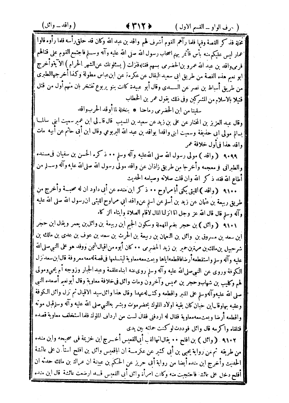 <312> نخلة فذكر القصة وفيها فلما رآهم القوم أشرف لهم واقد بن عبد الله وكان قد حلق رأسه فلما رأوه قالوا عمار ليس عليكم منه بأس فأتمر بهم أصحاب رسول الله صلى الله عليه وسلم فاجتمع القوم على قتالهم فرمى واقد بن عبد الله عمرو بن الحضرمي بسهم فقتله فنزلت يسألونك عن الشهر الحرام الآية وأخرج أبو نعيم هذه القصة من طريق أبي سعد البقال عن عكرمة عن أبن عباس مطولة وكذا أخرجها الطبري من طريق أسباط بن نصر عن السدى وقال أبو عبيدة كانت بنو يربوع تفتخر بأن منهم أول من قتل قتيلا بالإسلام من المشركين وفي ذلك يقول عمر بن الخطاب سقينا من بن الحضرمي رماحنا بنخلة لما أوقد الحرب واقد وقال عبد العزيز بن المختار عن علي بن يزيد عن سعيد بن المسيب قال قال لي بن عمير سميت ابني سالما بسالم مولى أبي حذيفة وسميت ابني واقدا بواقد بن عبد الله اليربوعي وقال بن أبي حاتم عن أبيه مات واقد هذا في أول خلافة عمر واقد مولى رسول الله صلى الله عليه وسلم ذكره الحسن بن سفيان في مسنده والطبراني في معجمه وأخرجا من طريق زاذان عن واقد مولى رسول الله صلى الله عليه وسلم من أطاع الله فقد ذكر الله وان قلت صلاته وصيامه الحديث واقد الليثي يكنى أبا مراوح ذكر بن منده عن أبي داود أن له صحبة وأخرج من طريق ربيعة بن عثمان عن زيد بن أسلم عن أسلم عن واقد أبي مراوح الليثي أن رسول الله صلى الله عليه وسلم قال قال الله عز وجل انا أنزلنا المال لاقام الصلاة وايتاء الزكاة وائل بن حجر بضم المهملة وسكون الجيم بن ربيعة بن وائل بن يعمر ويقال بن حجر بن سعد بن مسروق بن وائل بن النعمان بن ربيعة بن الحارث بن سعد بن عوف بن عدي بن مالك بن شرحبيل بن مالك بن مرة بن حمير بن زيد الحضرمي كان أبوه من أقيال اليمن ووفد هو على النبي صلى الله عليه وسلم واستقطعه أرضا فأقطعه إياها وبعث معه معاوية ليتسلمها في قصة له معه معروفة قال بن سعد نزل الكوفة وروى عن النبي صلى الله عليه وسلم روى عنه ابناه علقمة وعبد الجبار وزوجه أم يحيى ومولى لهم وكليب بن شهاب وحجر بن عنبس وآخرون ومات وائل في خلافة معاوية وقال أبو نعيم أصعده النبي صلى الله عليه وسلم على المنبر وأقطعه وكتب له عهدا وقال هذا وائل سيد الأقيال ثم نزل وائل الكوفة وعقبه بها وقال بن حبان كان بقية أولاد الملوك بحضرموت وبشر به النبي صلى الله عليه وسلم قبل موته وأقطعه أرضا وبعث معه معاوية فقال له أردفني فقال لست من أرداف الملوك فلما استخلف معاوية قصده فتلقاه وأكرمه قال وائل فوددت لو كنت حملته بين يدي وائل بن أفلح يقال انها لقب أبي القيس أخرج بن خزيمة في صحيحه وابن منده من طريقه ثم من رواية يحيى بن أبي كثير عن عكرمة أن أبا قعيس وائل بن أفلح استأذن على عائشة الحديث وأخرج بن منده أيضا من رواية أبي حريز عن الحكم بن عيينة أن عراك بن مالك حدثه أن أفلح دخل على عائشة فاحتجبت منه وكانت امرأة وائل أبي القعيس قد أرضعت عائشة قال بن منده §
