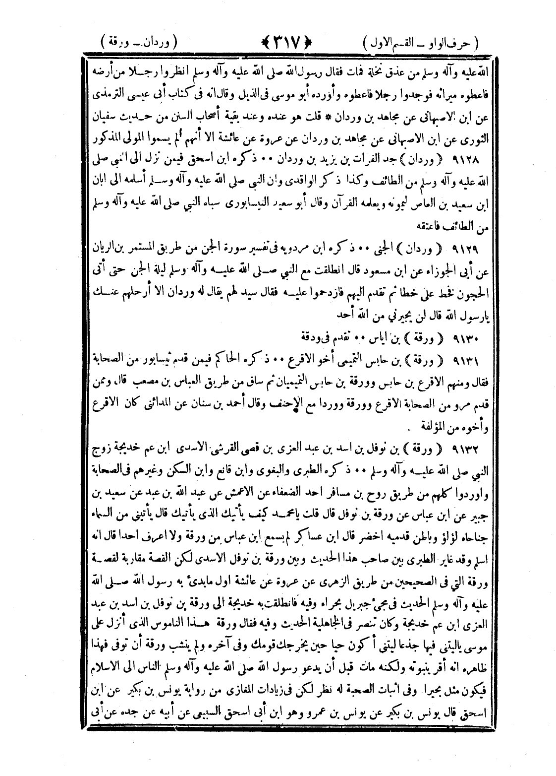 <317> من عذق نخلة فمات فقال رسول الله صلى الله عليه وسلم انظروا رجلا من أرضه فأعطوه ميراثه فوجدوا رجلا فأعطوه وأورده أبو موسى في الذيل وقال انه في كتاب أبي عيسى الترمذي عن بن الأصبهاني عن مجاهد بن وردان قلت هو عنده وعند بقية أصحاب السنن من حديث سفيان الثوري عن بن الأصبهاني عن مجاهد بن وردان عن عروة عن عائشة الا أنهم لم يسموا المولى المذكور وردان جد الفرات بن يزيد بن وردان ذكره بن إسحاق فيمن نزل الى النبي صلى الله عليه وسلم من الطائف وكذا ذكره الواقدي وأن النبي صلى الله عليه وسلم أسلمه الى أبان بن سعيد بن العاص ليمونه ويعلمه القرآن وقال أبو سعيد النيسابوري سباه النبي صلى الله عليه وسلم من الطائف فأعتقه وردان الجني ذكره بن مردويه في تفسير سورة الجن من طريق المستمر بن الريان عن أبي الجوزاء عن بن مسعود قال انطلقت مع النبي صلى الله عليه وسلم ليلة الجن حتى أتى الحجون فخط علي خطا ثم تقدم إليهم فازدحموا عليه فقال سيد لهم يقال له وردان ألا أرحلهم عنك يا رسول الله قال لن يجيرني من الله أحد ورقة بن إياس تقدم في ودقة ورقة بن حابس التميمي أخو الأقرع ذكره الحاكم فيمن قدم نيسابور من الصحابة فقال ومنهم الأقرع بن حابس وورقة بن حابس التميميان ثم ساق من طريق العباس بن مصعب قال وممن قدم مرو من الصحابة الأقرع وورقة ووردان مع الأحنف وقال أحمد بن سنان عن المدائني كان الأقرع وأخوه من المؤلفة ورقة بن نوفل بن أسد بن عبد العزى بن قصي القرشي الأسدي بن عم خديجة زوج النبي صلى الله عليه وسلم ذكره الطبري والبغوي وابن قانع وابن السكن وغيرهم في الصحابة وأوردوا كلهم من طريق روح بن مسافر أحد الضعفاء عن الأعمش عن عبد الله بن عبد الله عن سعيد بن جبير عن بن عباس عن ورقة بن نوفل قال قلت يا محمد كيف يأتيك الذي يأتيك قال يأتيني من السماء جناحاه لؤلؤ وباطن قدميه أخضر قال بن عساكر لم يسمع بن عباس من ورقة ولا أعرف أحدا قال انه أسلم وقد غاير الطبري بين صاحب هذا الحديث وبين ورقة بن نوفل الأسدي لكن القصة مغايرة لقصة ورقة التي في الصحيحين من طريق الزهري عن عروة عن عائشة أول ما بدئ به رسول الله صلى الله عليه وسلم الحديث في مجيء جبريل بحراء وفيه فانطلقت به خديجة الى ورقة بن نوفل بن أسد بن عبد العزى بن عم خديجة وكان تنصر في الجاهلية الحديث وفيه فقال ورقة هذا الناموس الذي أنزل على موسى يا ليتني فيها جذعا ليتني أكون حيا حين يخرجك قومك وفي أخره ولم ينشب ورقة أن توفى فهذا ظاهره أنه أقر بنبوته ولكنه مات قبل أن يدعو بحيرا رسول الله صلى الله عليه وسلم الناس الى الإسلام فيكون مثل بحيرا وفي اثبات الصحبة له نظر لكن في زيادات المغازي من رواية يونس بن بكير عن بن إسحاق قال يونس بن بكير عن يونس بن عمرو وهو بن أبي إسحاق السبيعي عن أبيه عن جده عن أبي §