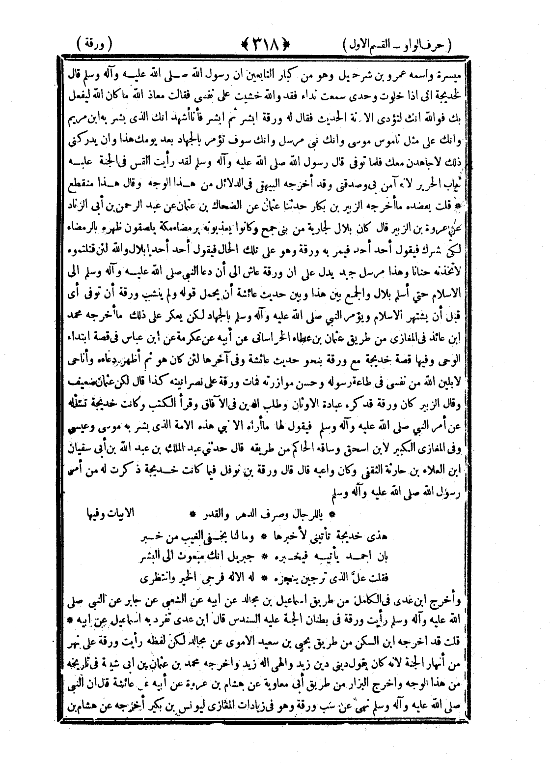 <318> ميسرة واسمه عمرو بن شرحبيل وهو من كبار التابعين أن رسول الله صلى الله عليه وسلم قال لخديجة اني إذا خلوت وحدي سمعت نداء فقد والله خشيت على نفسي فقالت معاذ الله ما كان الله ليفعل بك فوالله انك لتؤدي الأمانة الحديث فقال له ورقة أبشر ثم أبشر فأنا أشهد أنك الذي بشر به بن مريم وانك على مثل ناموس موسى وانك نبي مرسل وانك سوف تؤمر بالجهاد بعد يومك هذا وان يدركني ذلك لأجاهدن معك فلما توفي قال رسول الله صلى الله عليه وسلم لقد رأيت القس في الجنة عليه ثياب الحرير لأنه آمن بي وصدقني وقد أخرجه البيهقي في الدلائل من هذا الوجه وقال هذا منقطع قلت يعضده ما أخرجه الزبير بن بكار حدثنا عثمان عن الضحاك بن عثمان عن عبد الرحمن بن أبي الزناد عن عروة بن الزبير قال كان بلال لجارية من بني جمح وكانوا يعذبونه برمضاء مكة يلصقون ظهره بالرمضاء لكي يشرك فيقول أحد أحد فيمر به ورقة وهو على تلك الحال فيقول أحد أحد يا بلال والله لئن قتلتموه لأتخذنه حنانا وهذا مرسل جيد يدل على ان ورقة عاش الى أن دعا النبي صلى الله عليه وسلم الى الإسلام حتى أسلم بلال والجمع بين هذا وبين حديث عائشة أن يحمل قوله ولم ينشب ورقة أن توفى أي قبل أن يشتهر الإسلام ويؤمر النبي صلى الله عليه وسلم بالجهاد لكن يعكر على ذلك ما أخرجه محمد بن عائذ في المغازي من طريق عثمان بن عطاء الخراساني عن أبيه عن عكرمة عن بن عباس في قصة ابتداء الوحي وفيها قصة خديجة مع ورقة بنحو حديث عائشة وفي آخرها لئن كان هو ثم أظهر دعاءه وأنا حي لأبلين الله من نفسي في طاعة رسوله وحسن مؤازرته فمات ورقة على نصرانيته كذا قال لكن عثمان ضعيف قال الزبير كان ورقة قد كره عبادة الأوثان وطلب الدين في الآفاق وقرأ الكتب وكانت خديجة تسأله عن أمر النبي صلى الله عليه وسلم فيقول لها ما أراه الا نبي هذه الأمة الذي بشر به موسى وعيسى وفي المغازي الكبير لابن إسحاق وساقه الحاكم من طريقه قال حدثني عبد الملك بن عبد الله بن أبي سفيان بن العلاء بن حارثة الثقفي وكان راعيه قال قال ورقة بن نوفل فيما كانت خديجة ذكرت له من أمر رسول الله صلى الله عليه وسلم يا للرجال وصرف الدهر والقدر الأبيات وفيها هذي خديجة تأتيني لأخبرها وما لنا بخفي الغيب من خبر بأن أحمد يأتيه فيخبره جبريل أنك مبعوث الى البشر فقلت عل الذي ترجين ينجزه له الإله فرجى الخير وانتظري وأخرج بن عدي في الكامل من طريق إسماعيل بن مجالد عن أبيه عن الشعبي عن جابر عن النبي صلى الله عليه وسلم رأيت ورقة في بطنان الجنة عليه السندس قال بن عدي تفرد به إسماعيل عن أبيه قلت قد أخرجه بن السكن من طريق يحيى بن سعيد الأموي عن مجالد لكني لفظه رأيت ورقة على نهر من أنهار الجنة لأنه كان يقول ديني دين زيد والهي اله زيد وأخرجه محمد بن عثمان بن أبي شيبة في تاريخه من هذا الوجه وأخرج البزار من طريق أبي معاوية عن هشام بن عروة عن أبيه عن عائشة قالت ان النبي صلى الله عليه وسلم نهي عن سب ورقة وهو في زيادات المغازي ليونس بن بكير أخرجه عن هشام بن §