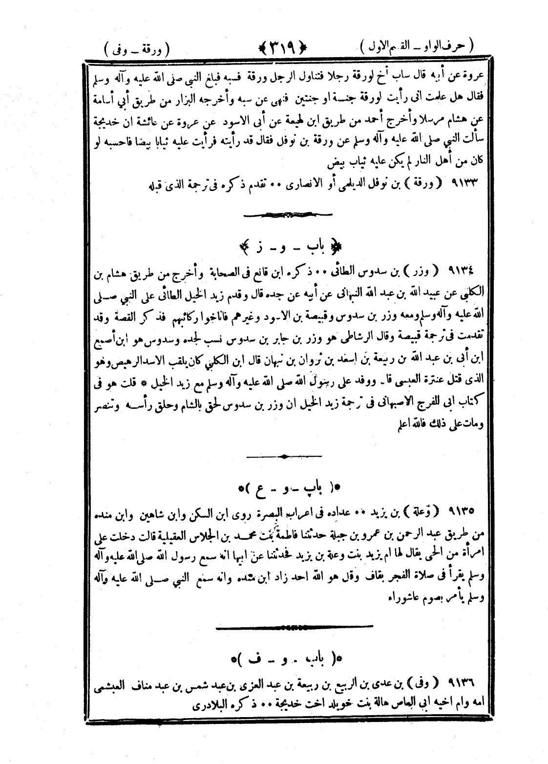 <319> عروة عن أبيه قال ساب أخ لورقة رجلا فتناول الرجل ورقة فسبه فبلغ النبي صلى الله عليه وسلم فقال هل علمت أني رأيت لورقة جنة أو جنتين فنهى عن سبه وأخرجه البزار من طرق أبي أسامة عن هشام مرسلا وأخرج أحمد من طريق بن لهيعة عن أبي الأسود عن عروة عن عائشة أن خديجة سألت النبي صلى الله عليه وسلم عن ورقة بن نوفل فقال قد رأيته فرأيت عليه ثيابا بيضا فأحسبه لو كان من أهل النار لم يكن عليه ثياب بيض ورقة بن نوفل الدبلي أو الأنصاري تقدم ذكره في ترجمة الذي قبله الواو بعدها الزاي وزر بن سدوس الطائي ذكره بن قانع في الصحابة وأخرج من طريق هشام بن الكلبي عن عبيد الله بن عبد الله النبهاني عن أبيه عن جده قال وقدم زيد الخيل الطائي على النبي صلى الله عليه وسلم ومعه وزر بن سدوس وقبيصة بن ألأسود وغيرهم فأناخوا ركائبهم فذكر القصة وقد تقدمت في ترجمة قبيصة وقال الرشاطي هو وزر بن جابر بن بن سدوس نسب لجده وسدوس هو بن أصمع بن أبي بن عبد الله بن ربيعة بن سعد بن ثروان بن نبهان قال بن الكلبي كان يلقب الأسد الرهيص وهو الذي قتل عنترة العبسي قال ووفد على رسول الله صلى الله عليه وسلم مع زيد الخيل قلت هو في كتاب أبي الفرج الأصبهاني في ترجمة زيد الخيل أن وزر بن سدوس لحق بالشام وحلق رأسه وتنصر ومات على ذلك والله أعلم الواو بعدها العين وعلة بن يزيد عداده في أعراب البصرة روى بن السكن وابن شاهين وابن منده من طريق عبد الرحمن بن عمرو بن جبلة حدثتنا فاطمة بنت محمد بن الجلاس العقيلية قالت دخلت على امرأة من الحي يقال لها أم يزيد بنت وعلة بن يزيد فحدثتنا عن أبيها أنه سمع رسول الله صلى الله عليه وسلم يقرأ في صلاة الفجر بقاف وقل هو الله أحد زاد بن منده وأنه سمع النبي صلى الله عليه وسلم يأمر بصوم عاشوراء الواو بعدها الفاء وفاء بن عدي بن الربيع بن ربيعة بن عبد العزى بن عبد شمس بن عبد مناف العبشمي أمه وأم أخيه أبي العاص هالة بنت خويلد أخت خديجة ذكره البلاذري §