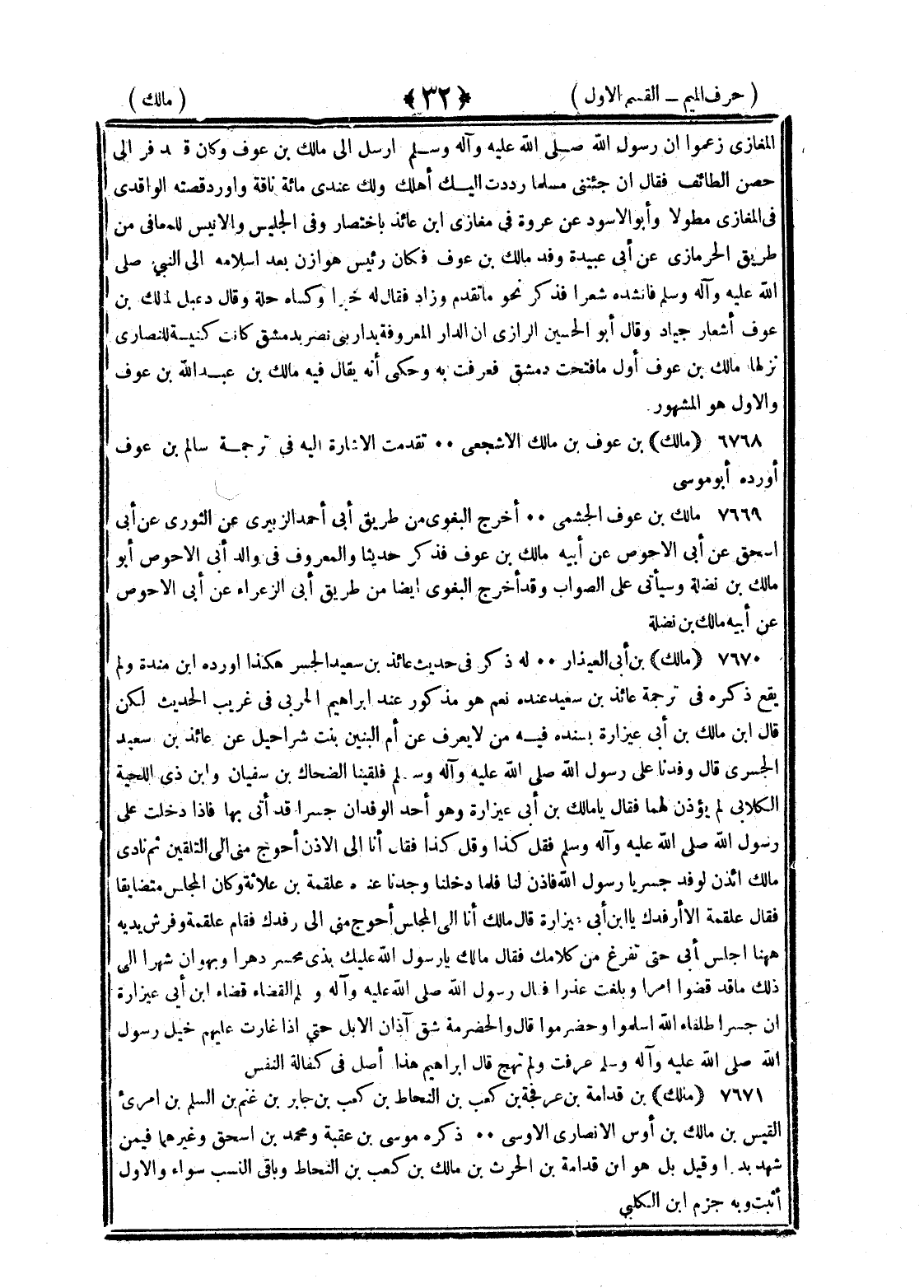 <32> المغازي زعموا ان رسول الله صلى الله عليه وسلم أرسل الى مالك بن عوف وكان قد فر الى حصن الطائف فقال ان جئتني مسلما رددت إليك أهلك ولك عندي مائة ناقة وأورد قصته الواقدي في المغازي مطولا وأبو الأسود عن عروة في مغازي بن عائذ باختصار وفي الجليس والأنيس للمعافى من طريق الحرمازي عن أبي عبيدة وفد مالك بن عوف فكان رئيس هوازن بعد إسلامه الى النبي صلى الله عليه وسلم فأنشده شعرا فذكر نحو ما تقدم وزاد فقال له خيرا وكساه حلة وقال دعبل لمالك بن عوف اشعار جياد وقال أبو الحسين الرازي ان الدار المعروفة بدار بني نصر بدمشق كانت كنيسة للنصارى نزلها مالك بن عوف أول ما فتحت دمشق فعرفت به وحكى انه يقال فيه مالك بن عبد الله بن عوف والأول هو المشهور مالك بن عوف بن مالك الأشجعي تقدمت الإشارة اليه في ترجمة سالم بن عوف وأورده أبو موسى مالك بن عوف الجشمي اخرج البغوي من طريق أبي احمد الزبيري عن الثوري عن أبي إسحاق عن أبي الأحوص عن أبيه مالك بن عوف فذكر حديثا والمعروف في والد أبي الأحوص انه مالك بن نضلة وسيأتي على الصواب وقد اخرج البغوي أيضا من طريق أبي الزعراء عن أبي الأحوص عن أبيه مالك بن نضلة مالك بن أبي العيزار له ذكر في حديث عائذ بن سعيد الجسري هكذا أورده بن منده ولم يقع ذكره في ترجمة عائذ بن سعيد عنده نعم هو مذكور عند إبراهيم الحربي في غريب الحديث لكن قال مالك بن أبي عيزارة بسند فيه من لا يعرف عن أم البنين بنت شراحيل عن عائذ بن سعيد الجسري قال وفدنا على رسول الله صلى الله عليه وسلم فلقينا الضحاك بن سفيان وابن ذي اللحية الكلابي لم يؤذن لهما فقال يا مالك بن أبي عيزارة وهو أحد الوفد ان جسرا قد اتى بها فإذا دخلت لي رسول الله صلى الله عليه وسلم فقل كذا وقل كذا فقال انا الى الإذن أحوج منى الى التلقين ثم نادى مالك ائذن لوفد جسر يا رسول الله فأذن لنا فلما دخلنا وجدنا عنده علقمة بن علاثة وكان المجلس متضايقا فقال علقمة الا ارفدك يا بن أبي عيزارة قال مالك انا الى المجلس أحوج منى الى رفدك فقام علقمة وفرش يديه ههنا اجلس بابي حتى تفرغ من كلامك فقال مالك يا رسول الله عليك بذي محسر دهرا وبهوان شهرا الى ذلك ما قد قضوا أمرا وبلغت عذرا فقال رسول الله صلى الله عليه وسلم القضاء قضاء بن أبي عيزارة ان جسرا طلقاء الله أسلموا وحضرموا قال والحضرمة شق آذان الإبل حتى إذا غارت عليهم خيل رسول الله صلى الله عليه وسلم عرفت ولم تهج قال إبراهيم هذا أصل في كفالة النفس مالك بن قدامة بن عرفجة بن كعب بن النحاط بن كعب بن جابر بن غنم بن السلم بن امرئ القيس بن مالك بن أوس الأنصاري الأوسي ذكره موسى بن عقبة ومحمد بن إسحاق وغيرهما فيمن شهد بدرا وقيل بل هو بن قدامة بن الحارث بن مالك بن كعب بن النحاط وباقي النسب سواء والأول اثبت وبه جزم بن الكلبي §