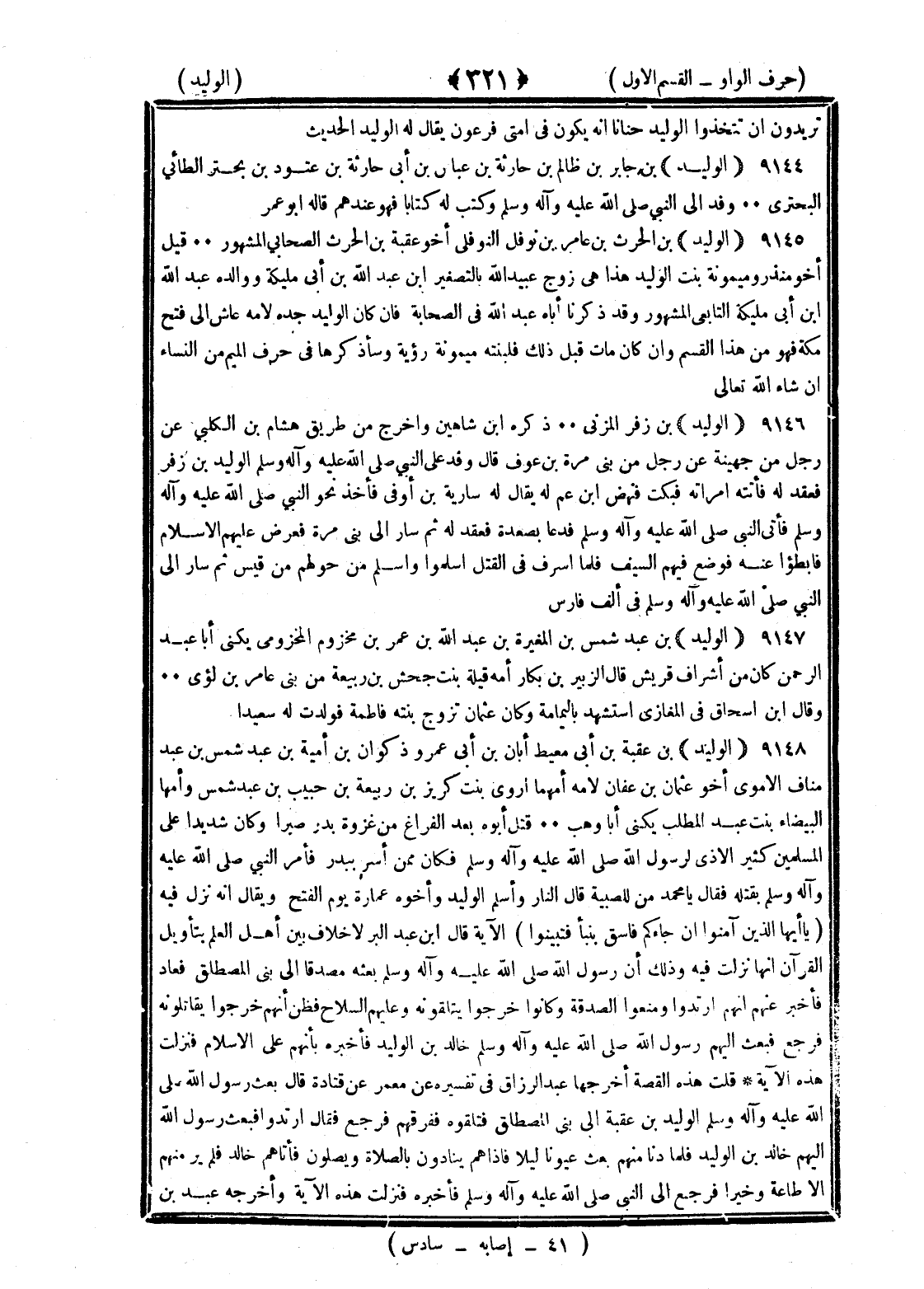 <321> تريدون أن تتخذوا الوليد حنانا انه يكون في أمتي فرعون يقال له الوليد الوليد بن جابر بن ظالم بن حارثة بن عباس بن أبي حارثة بن عتود بن بحتر الطائي البحتري وفد على النبي صلى الله عليه وسلم وكتب له كتابا فهو عندهم قاله أبو عمر الوليد بن الحارث بن عامر بن نوفل النوفلي أخو عقبة بن الحارث الصحابي المشهور قيل أخو منذر وميمونة بنت الوليد هذا هي زوج عبيد الله بالتصغير بن عبد الله بن أبي مليكة ووالده عبد الله بن أبي مليكة التابعي المشهور وقد ذكرنا أباه عبد الله في الصحابة فان كان الوليد جده لأمه عاش الى فتح مكة فهو من هذا القسم وان كان مات قبل ذلك فلبنته ميمونة رؤية وسأذكرها في حرف الميم من النساء ان شاء الله تعالى الوليد بن زفر المزني ذكره بن شاهين وأخرج من طريق هشام بن الكلبي عن رجل من جهينة عن رجل من بني مرة بن عوف قال وفد على النبي صلى الله عليه وسلم الوليد بن زفر فعقد له امرأته فبكت فنهض بن عم له يقال له سارية بن أوفى فأخذ نحو النبي صلى الله عليه وسلم فدعا بصعدة فعقد له ثم سار الى بني مرة فعرض عليهم الإسلام فأبطئوا عنه فوضع فيهم السيف فلما أسرف في القتل أسلموا وأسلم من حولهم من قيس ثم سار الى النبي صلى الله عليه وسلم في ألف فارس الوليد بن عبد شمس بن المغيرة بن عبد الله بن عمر بن مخزوم المخزومي يكنى أبا عبد الرحمن كان من أشراف قريش قال الزبير بن بكار أمه قيلة بنت جحش بن ربيعة من بني عامر بن لؤي وقال بن إسحاق في المغازي استشهد باليمامة وكان عثمان تزوج بنته فاطمة فولدت له سعيدا الوليد بن عقبة بن أبي معيط أبان بن أبي عمرو ذكوان بن أمية بن عبد شمس بن عبد مناف الأموي أخو عثمان بن عفان لأمه أمهما أروى بنت كريز بن ربيعة بن حبيب بن عبد شمس وأمها البيضاء بنت عبد المطلب يكنى أبا وهب قتل أبوه بعد الفراغ من غزوة بدر صبرا وكان شديدا على المسلمين كثير الأذى لرسول الله صلى الله عليه وسلم فكان ممن أسر ببدر فأمر النبي صلى الله عليه وسلم بقتله فقال يا محمد من للصبية قال النار وأسلم الوليد وأخوه عمارة يوم الفتح ويقال انه نزل فيه يا أيها الذين آمنوا إن جاءكم فاسق بنبأ فتبينوا الآية قال بن عبد البر لا خلاف بين أهل العلم بتأويل القرآن انها نزلت فيه وذلك أن رسول الله صلى الله عليه وسلم بعثه مصدقا الى بني المصطلق فعاد فأخبر عنهم أنهم ارتدوا ومنعوا الصدقة وكانوا خرجوا يتلقونه وعليهم السلاح فظن أنهم خرجوا يقاتلونه فرجع فبعث إليهم رسول الله صلى الله عليه وسلم خالد بن الوليد فأخبره بأنهم على الإسلام فنزلت هذه الآية قلت هذه القصة أخرجها عبد الرزاق في تفسيره عن معمر عن قتادة قال وبعث رسول الله صلى الله عليه وسلم الوليد بن عقبة الى بني المصطلق فتلقوه فعرفهم فرجع فقال ارتدوا فبعث رسول الله إليهم خالد بن الوليد فلما دنا منهم بعث عيونا ليلا فإذا هم ينادون بالصلاة ويصلون فأتاهم خالد فلم ير منهم الا طاعة وخيرا فرجع الى النبي صلى الله عليه وسلم فأخبره فنزلت هذه الآية وأخرجه عبد بن §