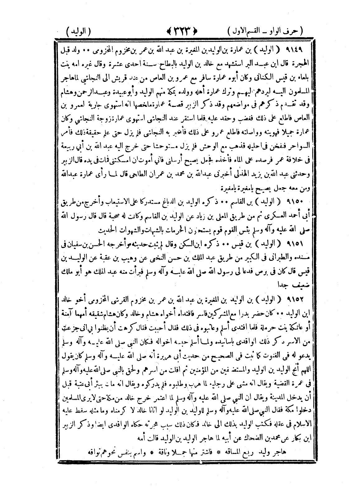 <323> الوليد بن عمارة بن الوليد بن المغيرة بن عبد الله بن عمر بن مخزوم المخزومي ولد قبل الهجرة قال بن عبد البر استشهد مع خالد بن الوليد بالبطاح سنة إحدى عشرة وقال غيره أمه بنت بلعاء بن قيس الكناني وكان أبوه عمارة سافر مع عمرو بن العاص من عند قريش الى النجاشي لما هاجر المسلمون اليه ليردهم إليهم وترك عمارة أهله وولده بمكة منهم الوليد وأبو عبيدة وعبد الرحمن وهشام وقد تقدم ذكرهم في مواضعهم وقد ذكر الزبير قصة عمارة ملخصها أنه استهوى جارية لعمرو بن العاص فاطلع على ذلك فغضب وحقد عليه فلما استقر عند النجاشي استهوى عمارة زوجة النجاشي وكان عمارة جميلا فهويته وواصلته فاطلع عمرو على ذلك فأخبر به النجاشي فلم يزل حتى علم حقيقة ذلك فأمر السواحر فنفخن في احليله فذهب مع الوحش فلم يزل مستوحشا حتى خرج اليه عبد الله بن أبي ربيعة في خلافة عمر فرصده على الماء فأخذه فجعل يصيح أرسلني فاني أموت أن امسكتني فمات في يده قال الزبير وحدثني عبد الله بن يزيد الهذلي أخبرني عبد الله بن محمد بن عمران الطلحي قال لما رأى عمارة عبد الله ومن معه جعل يصيح يا مغيرة يا مغيرة الوليد بن القاسم ذكره الوليد بن الدباغ مستدركا على الاستيعاب وأخرج من طريق أبي أحزد العسكري ثم من طريق المعلى بن زياد عن الوليد بن القاسم وكان له صحبة قال قال رسول الله صلى الله عليه وسلم بئس القوم قوم يستحلون الحرمات بالشبهات والشهوات الحديث الوليد بن قيس ذكره بن السكن وقال لم يثبت حديثه وأخرجه الحسن بن سفيان في مسنده والطبراني في الكبير من طريق عبد الملك بن حسن النخعي عن وهيب بن عقبة عن الوليد بن قيس قال كان في برص فدعا لي رسول الله صلى الله عليه وسلم فبرأت منه عبد الملك هو أبو مالك ضعيف جدا الوليد بن الوليد بن المغيرة بن عبد الله بن عمر بن مخزوم القرشي المخزومي أخو خالد بن الوليد كان حضر بدرا مع المشركين فأسر فافتداه أخواه هشام وخالد وكان هشام شقيقه أمهما آمنة أو عاتكة بنت حرملة فلما افتدى أسلم وعاتبوه في ذلك فقال أجبت فقال كرهت أن يظنوا بي أني جزعت من الأسر ذكر الواقدي بأسانيده ولما أسلم حبسه أخواله فكان النبي صلى الله عليه وسلم يدعو له في القنوت كما ثبت في الصحيح من حديث أبي هريرة أنه صلى الله عليه وسلم كان يقول اللهم أنج الوليد بن الوليد والمستضعفين من المؤمنين ثم أفلت من أسرهم ولحق بالنبي صلى الله عليه وسلم في عمرة القضية ويقال انه مشى على رجليه لما هرب وطلبوه فلم يدركوه ويقال انه مات ببشر أبي عتبة قبل أن يدخل المدينة ويقال ان النبي صلى الله عليه وسلم لما اعتمر خرج خالد من مكة حتى لا يرى المسلمين دخلوا مكة فقال النبي صلى الله عليه وسلم للوليد بن الوليد لو أتانا خالد لأكرمناه وما مثله سقط عليه الإسلام في عقد فكتب الوليد بذلك الى خالد فكان ذلك سبب هجرته حكاه الواقدي أيضا وذكر الزبير بن بكار عن محمد بن الضحاك عن أبيه لما هاجر الوليد بن الوليد قالت أمه هاجر الوليد ربع المسافة فاشتر منها جملا وناقه واسم بنفس نحوهم تواقه §